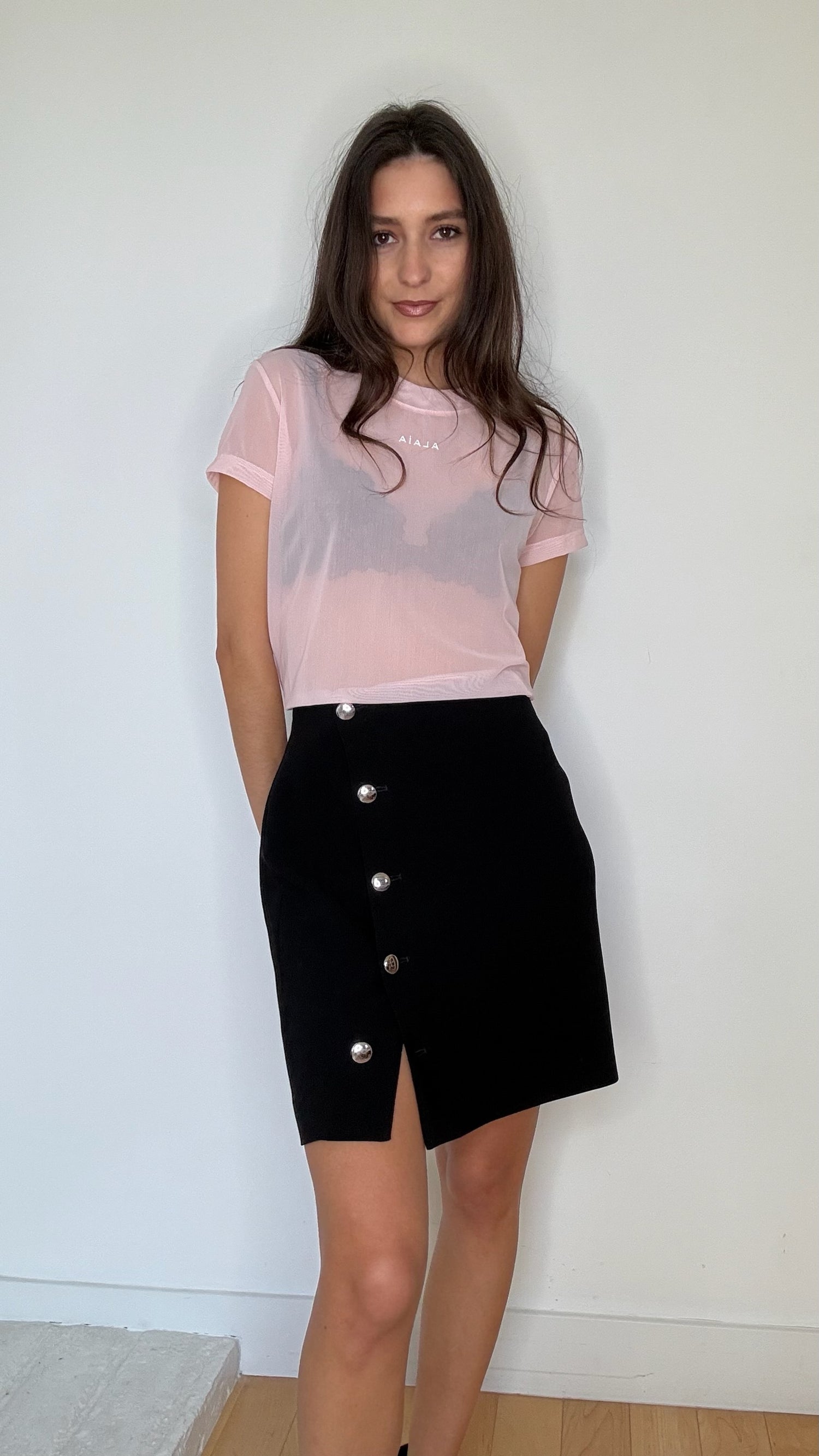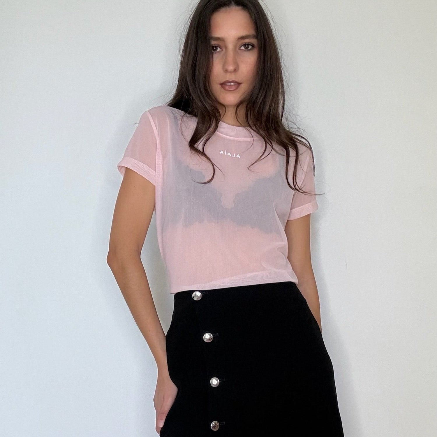 Alaia pink mesh top. Logo at front. See-through light mesh. Grey on bralette, tank top or as a layering piece.