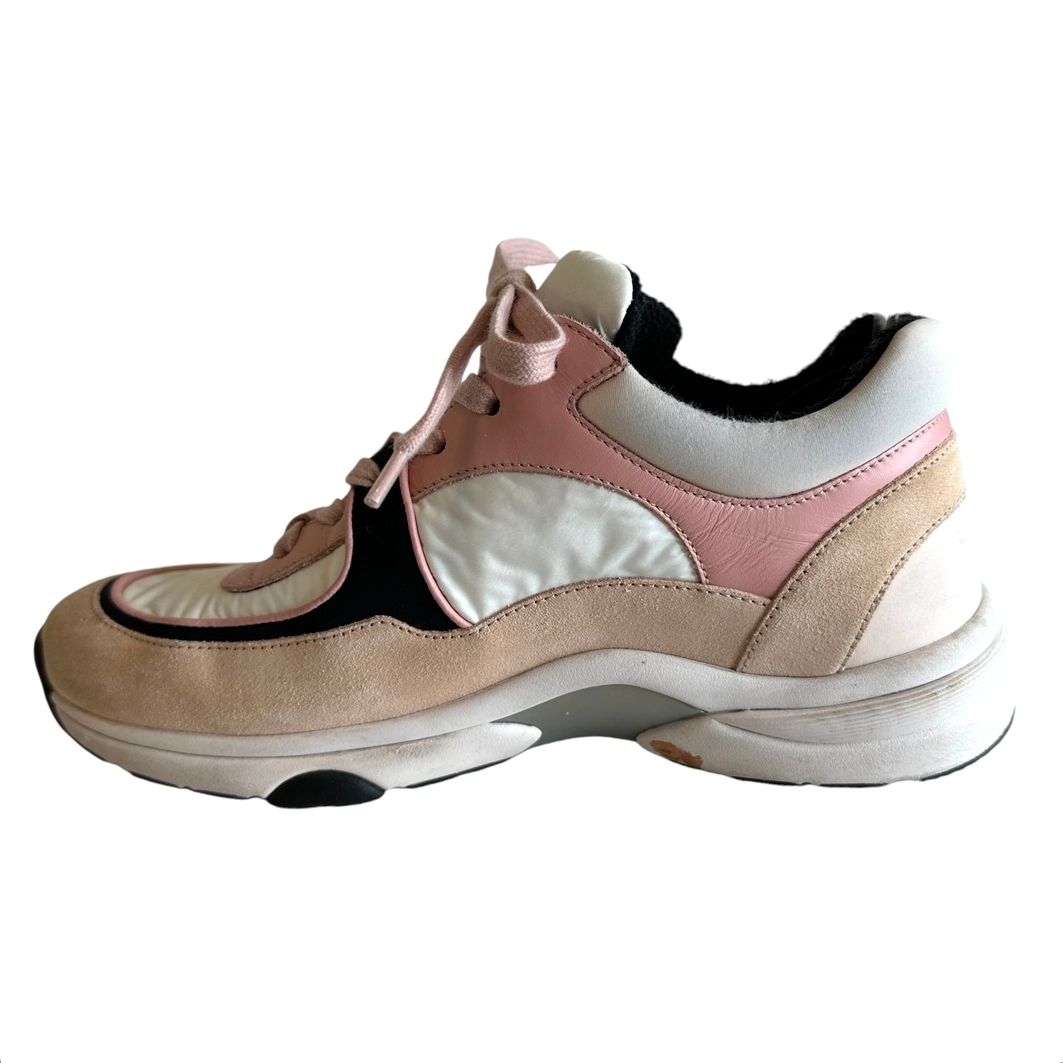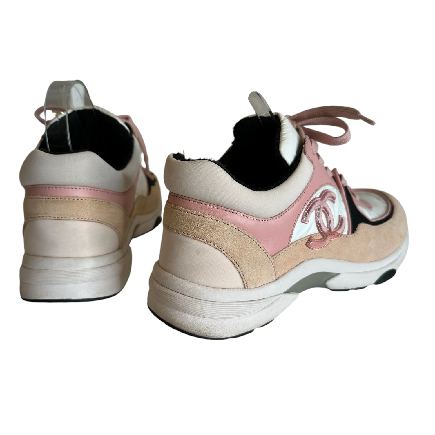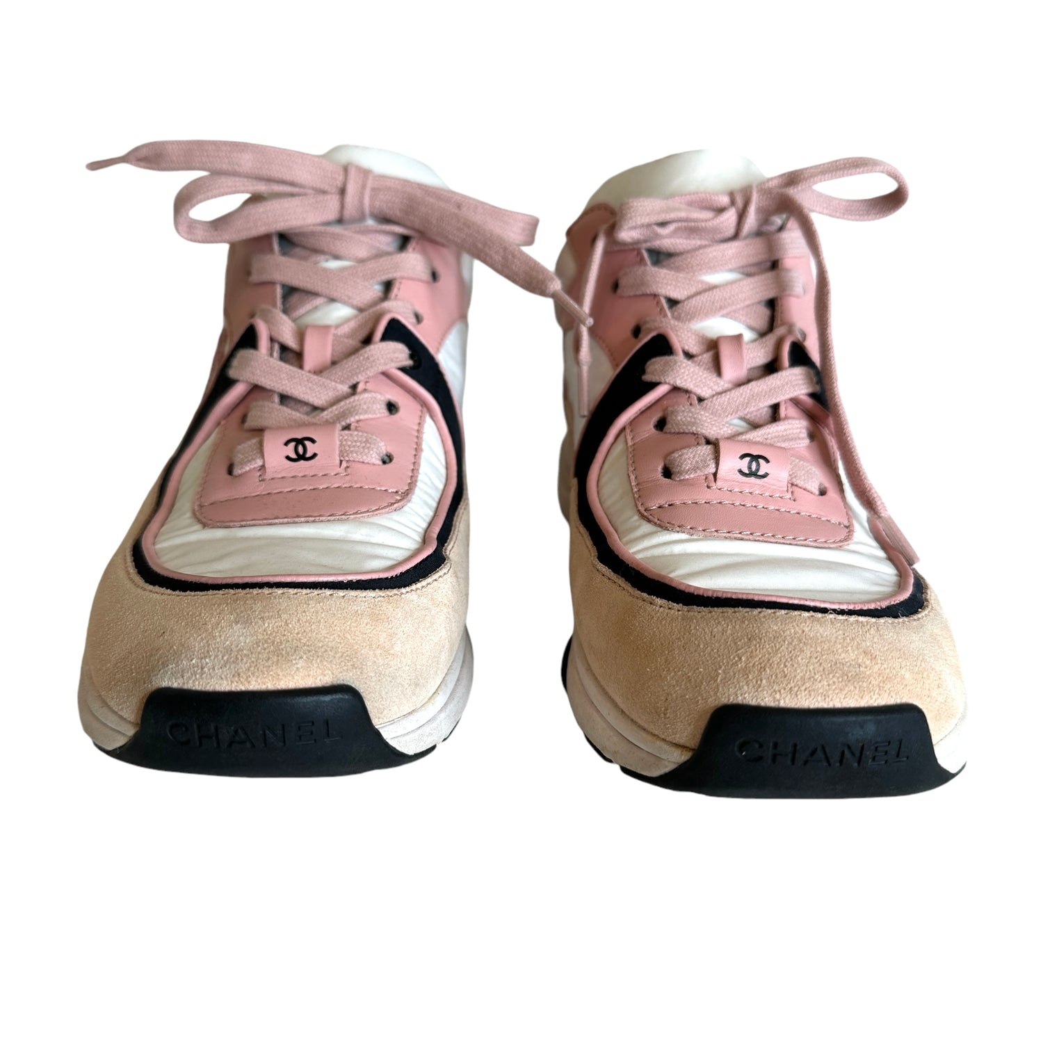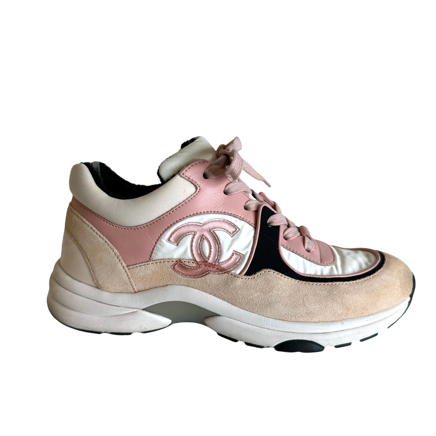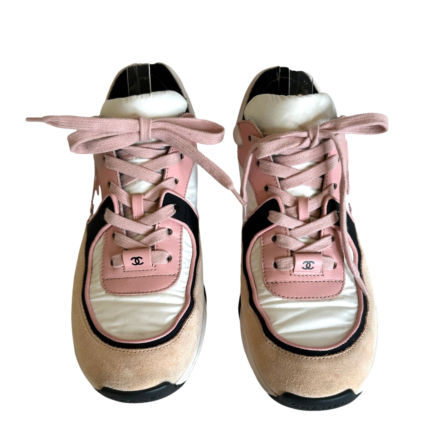 Chanel pink logo sneakers. Chanel logo at sides and front rubber. Lace closure at top. Designer size 38.
