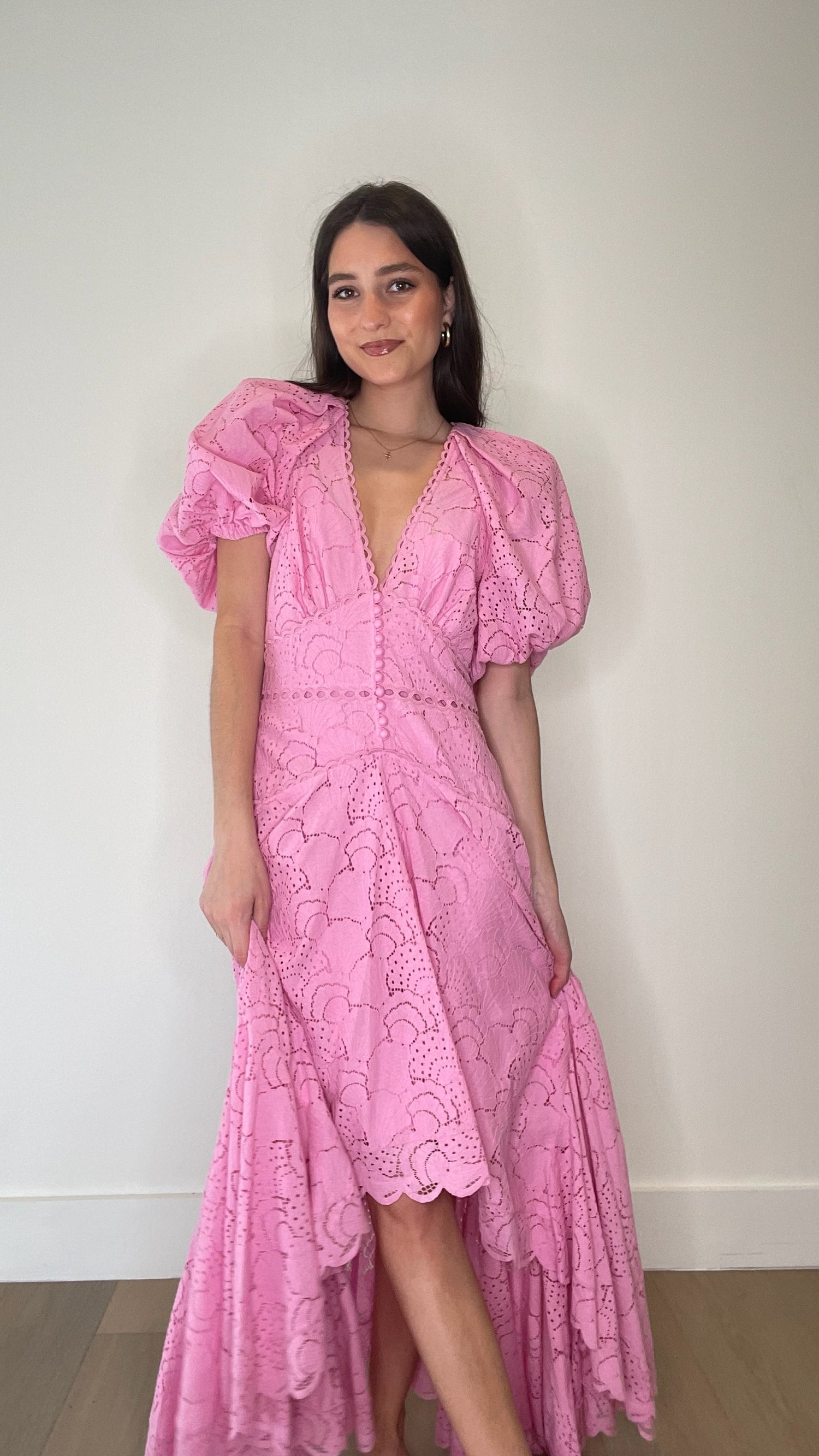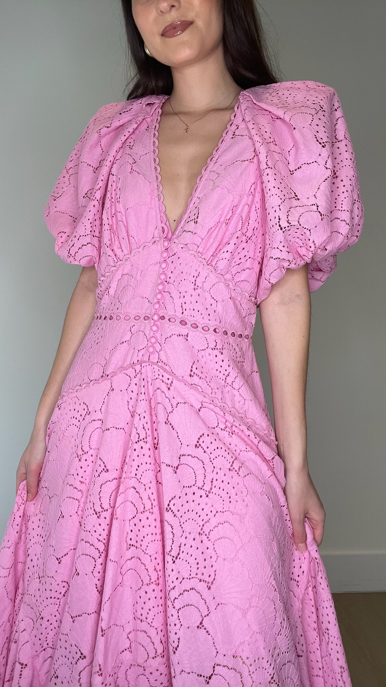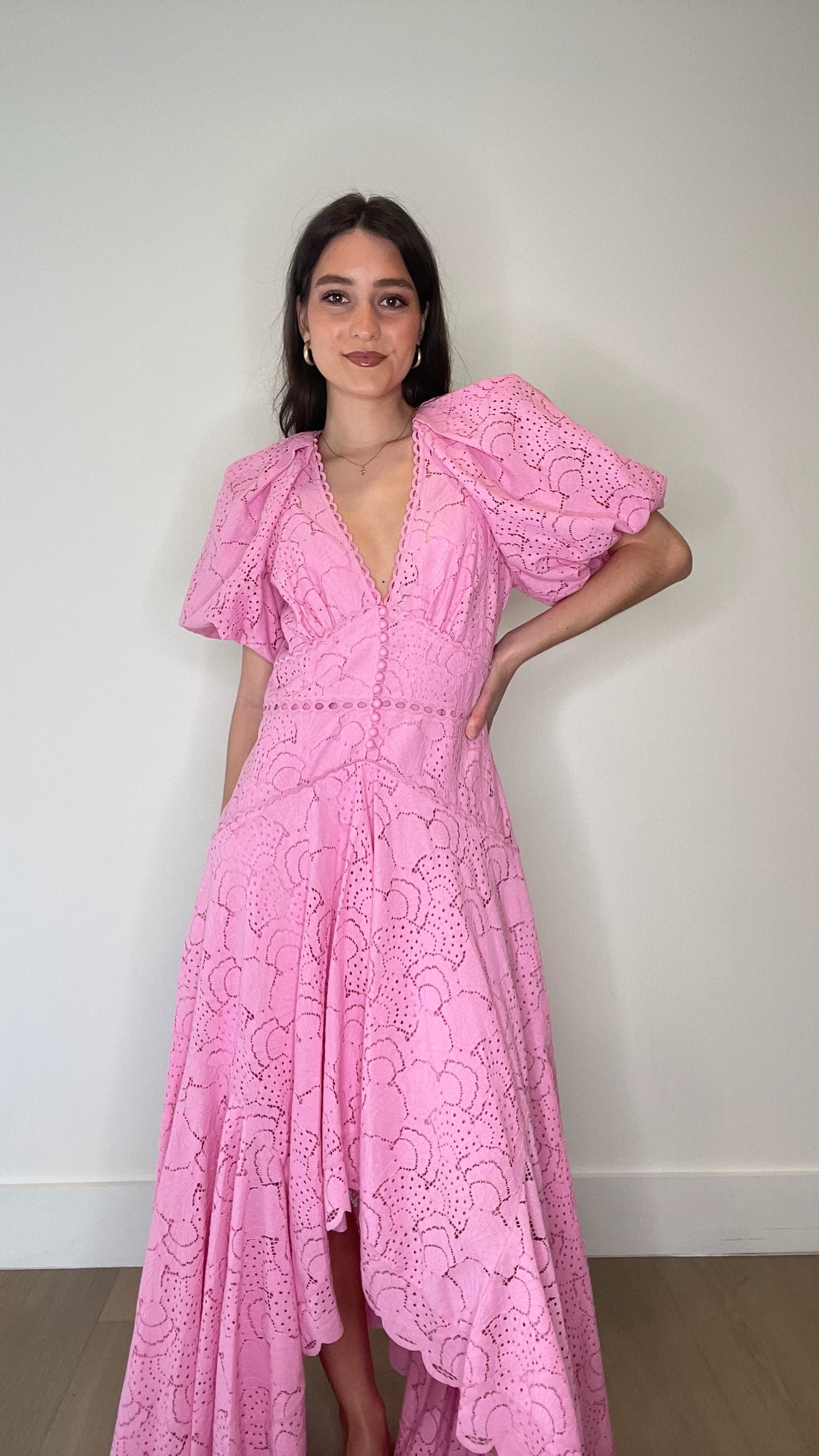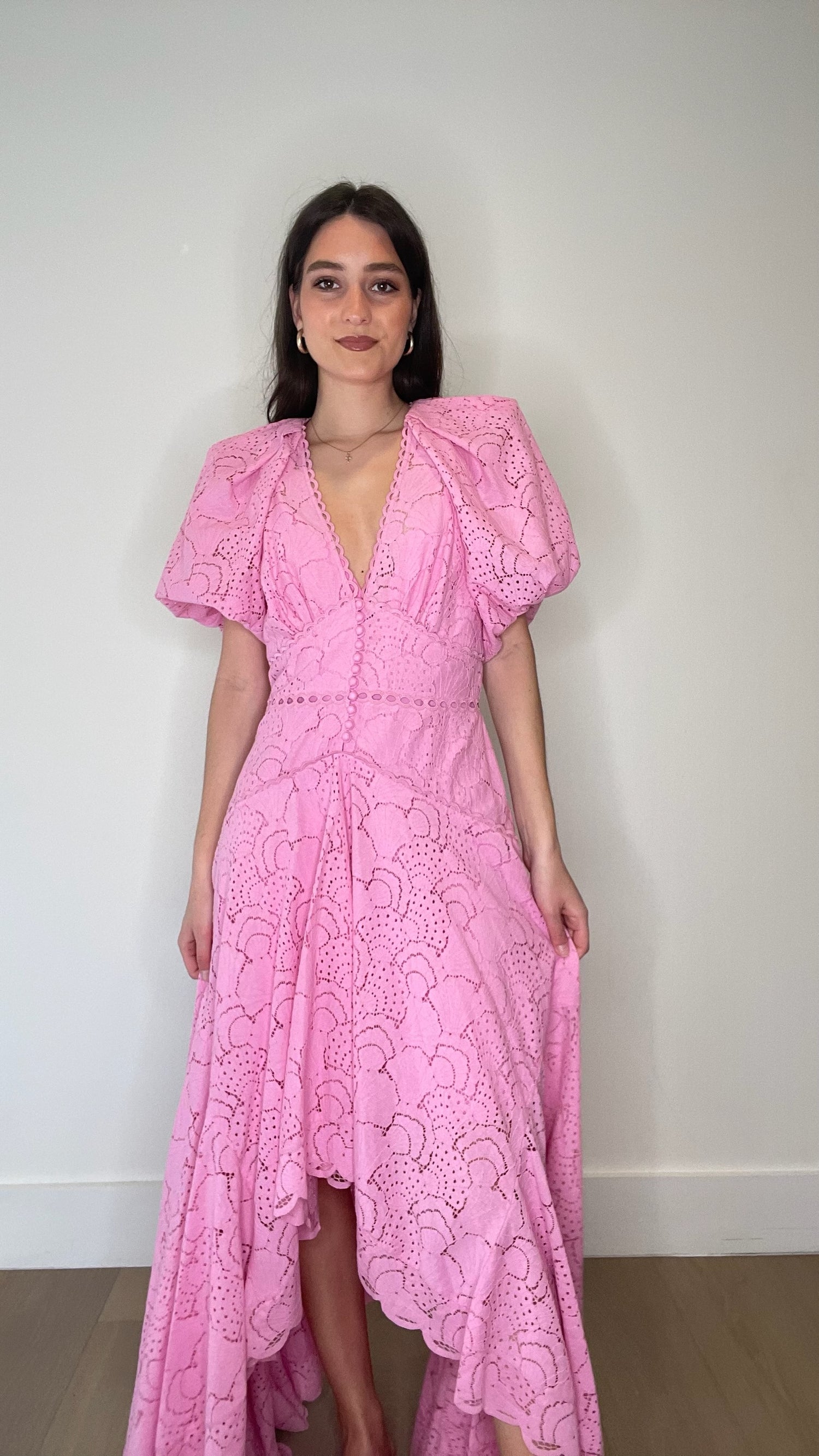 Acler pink long lace dress. V-neck with balloon short sleeves. Mini buttons embellishments at front. High low skirt. Designer size US 6