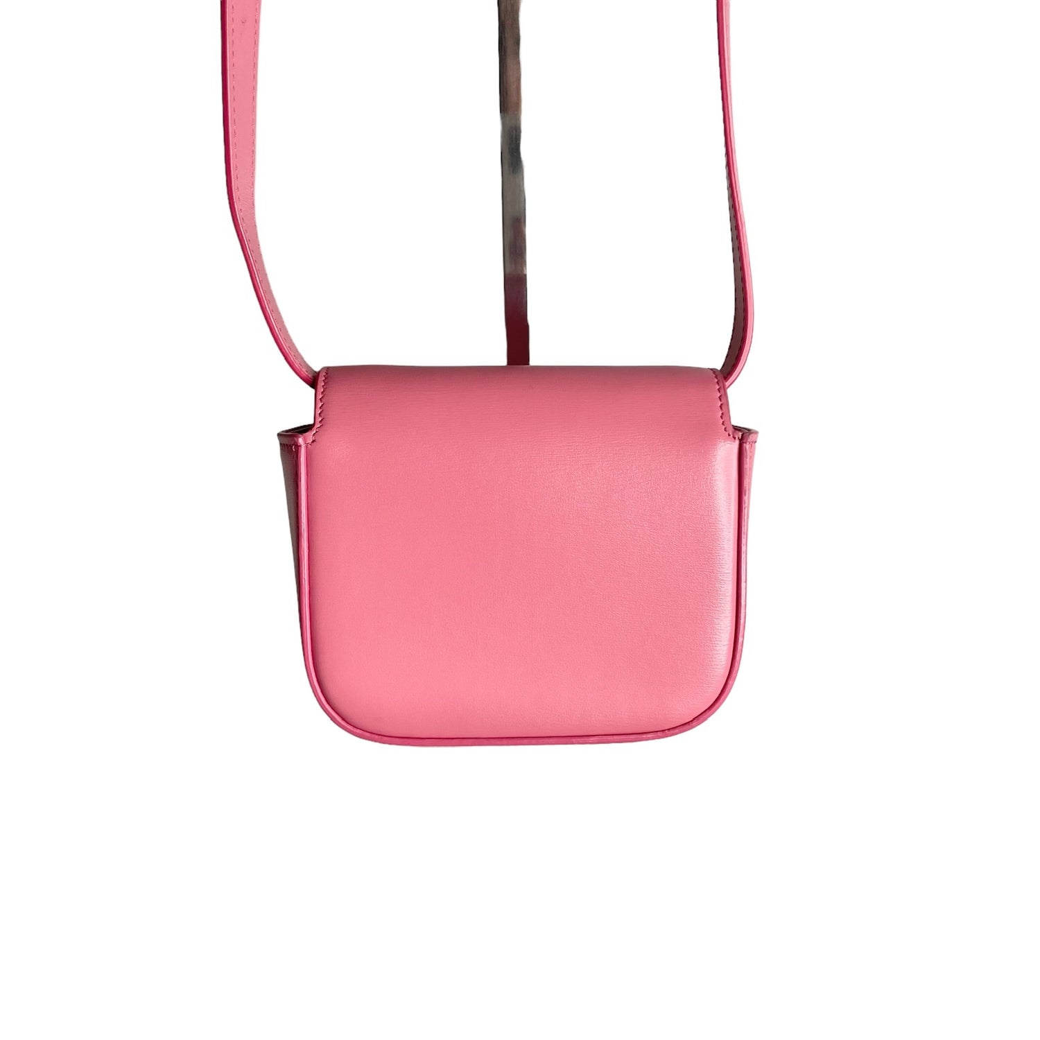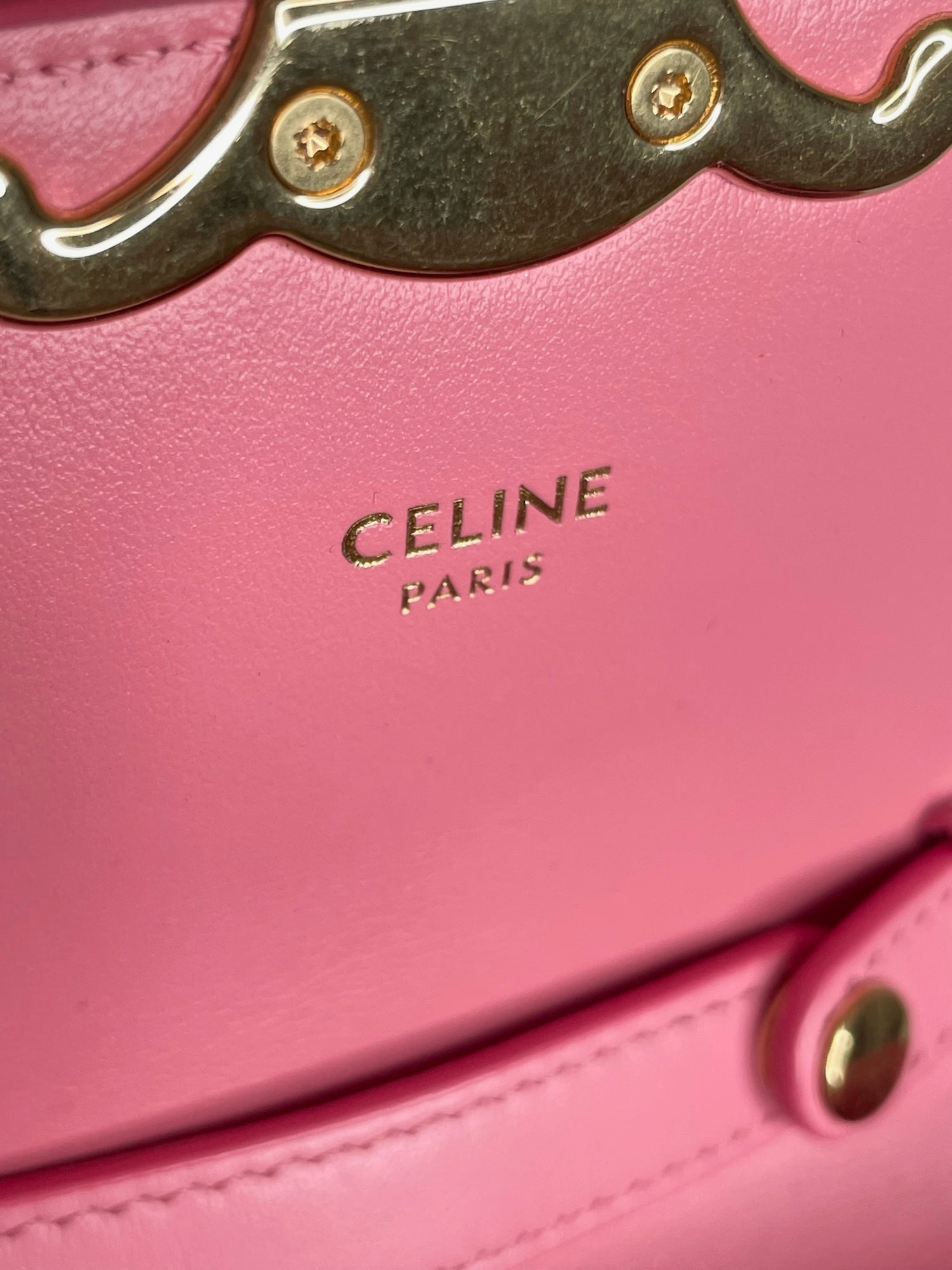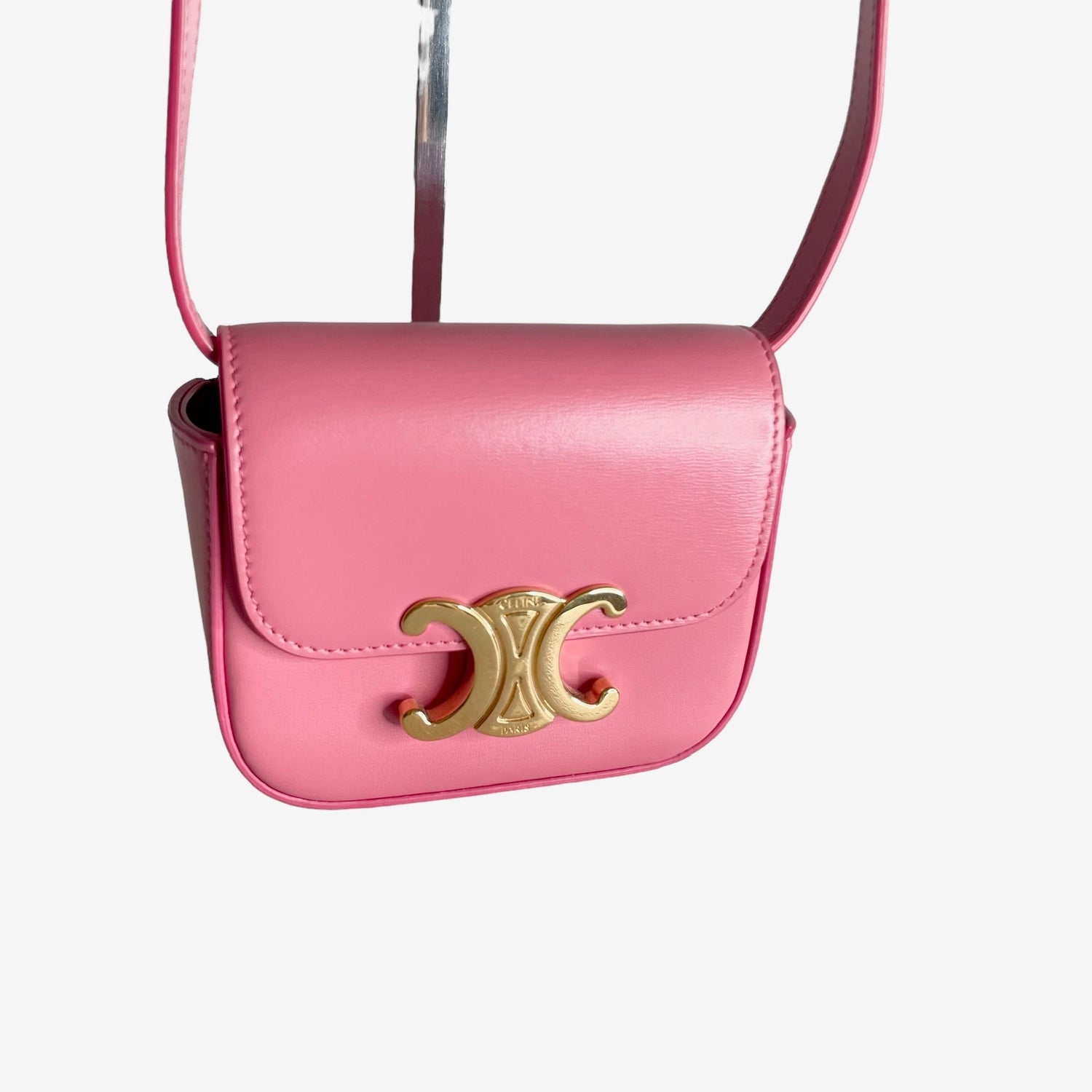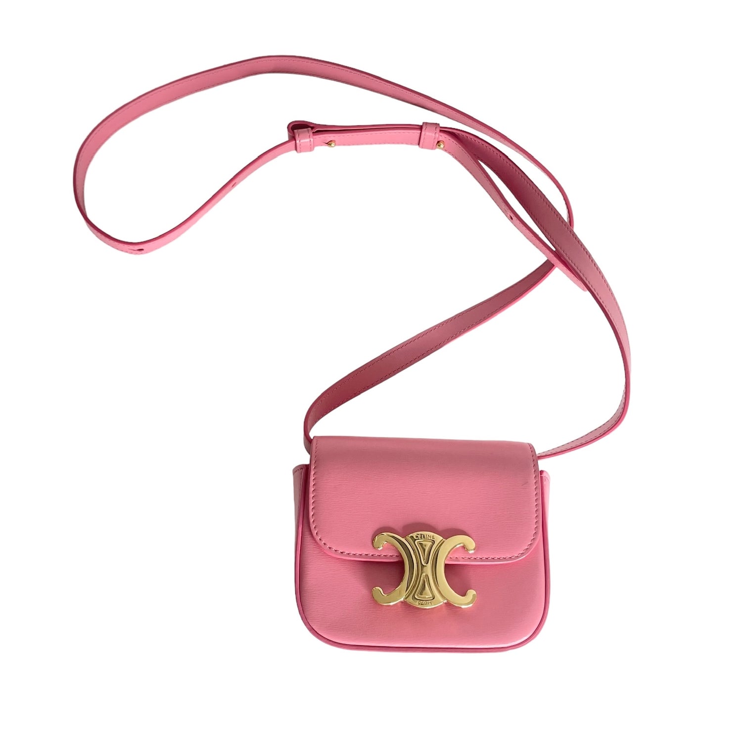 Celine nano Triomphe bag. Bubble gum pink leather with gold-tone hardware. Magnetic snap closure at flap. Adjustable strap.