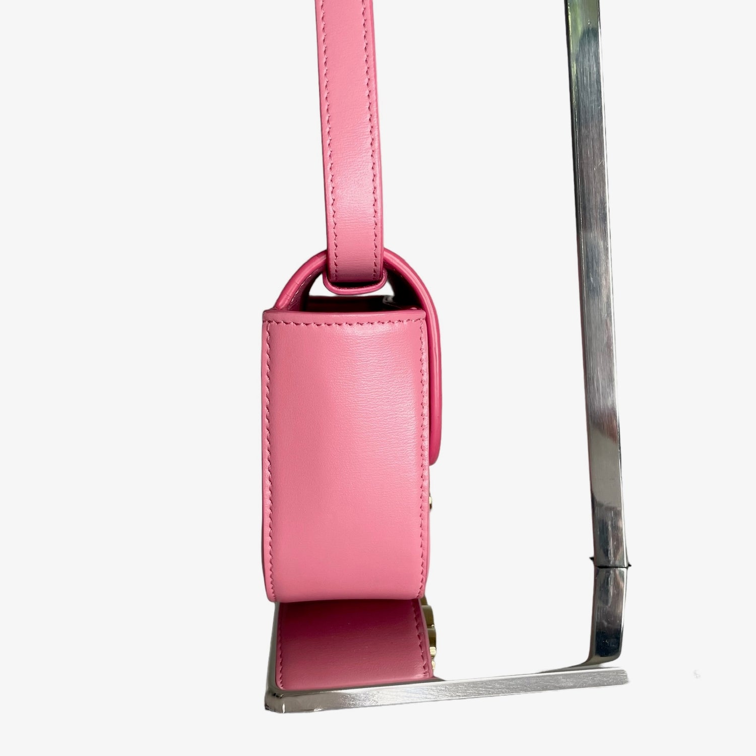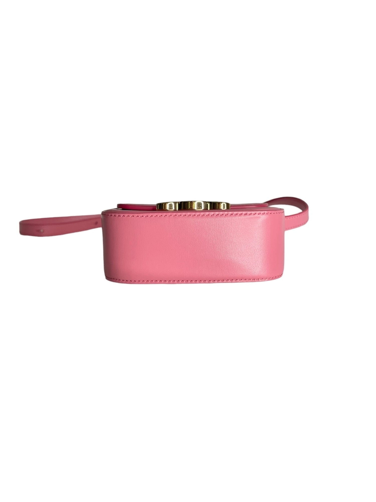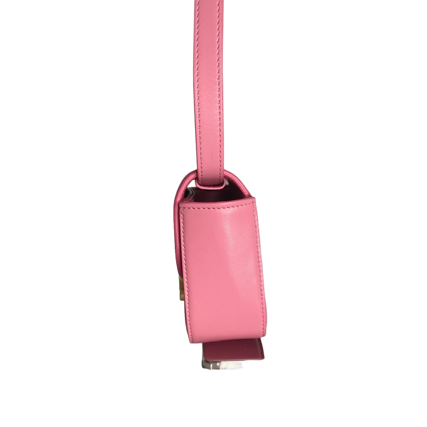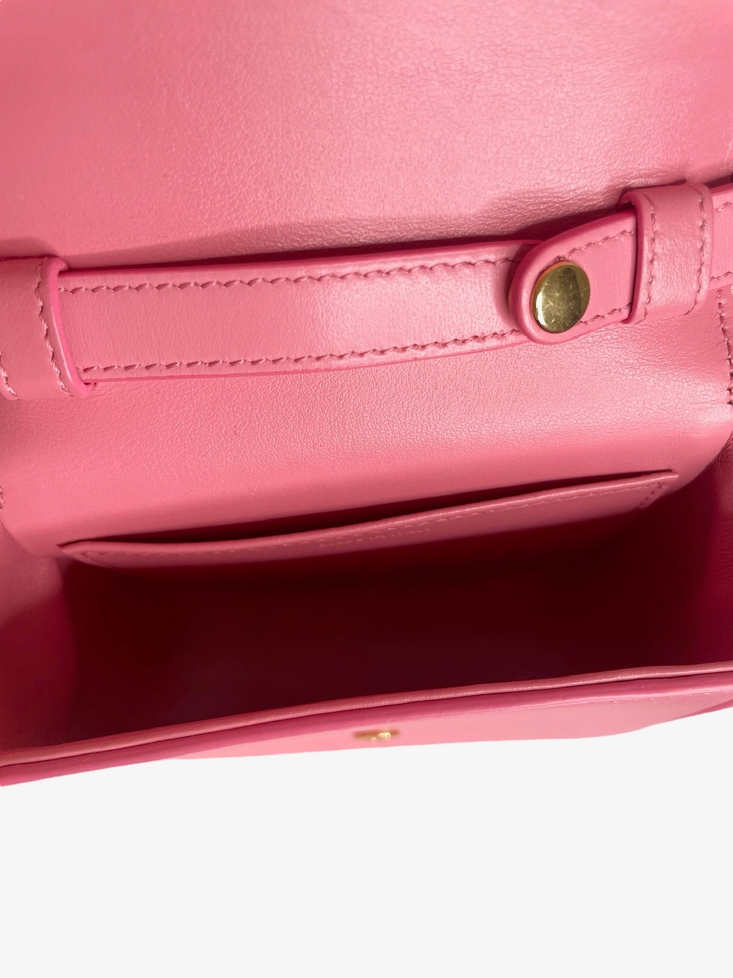 Celine nano Triomphe bag. Bubble gum pink leather with gold-tone hardware. Magnetic snap closure at flap. Adjustable strap.