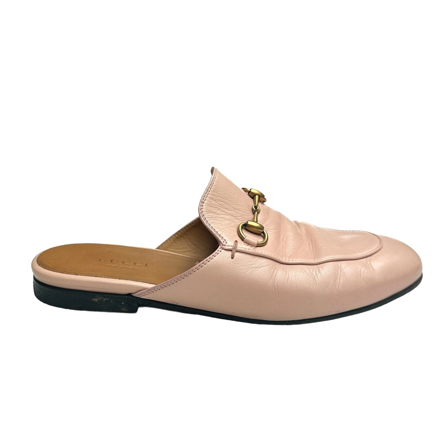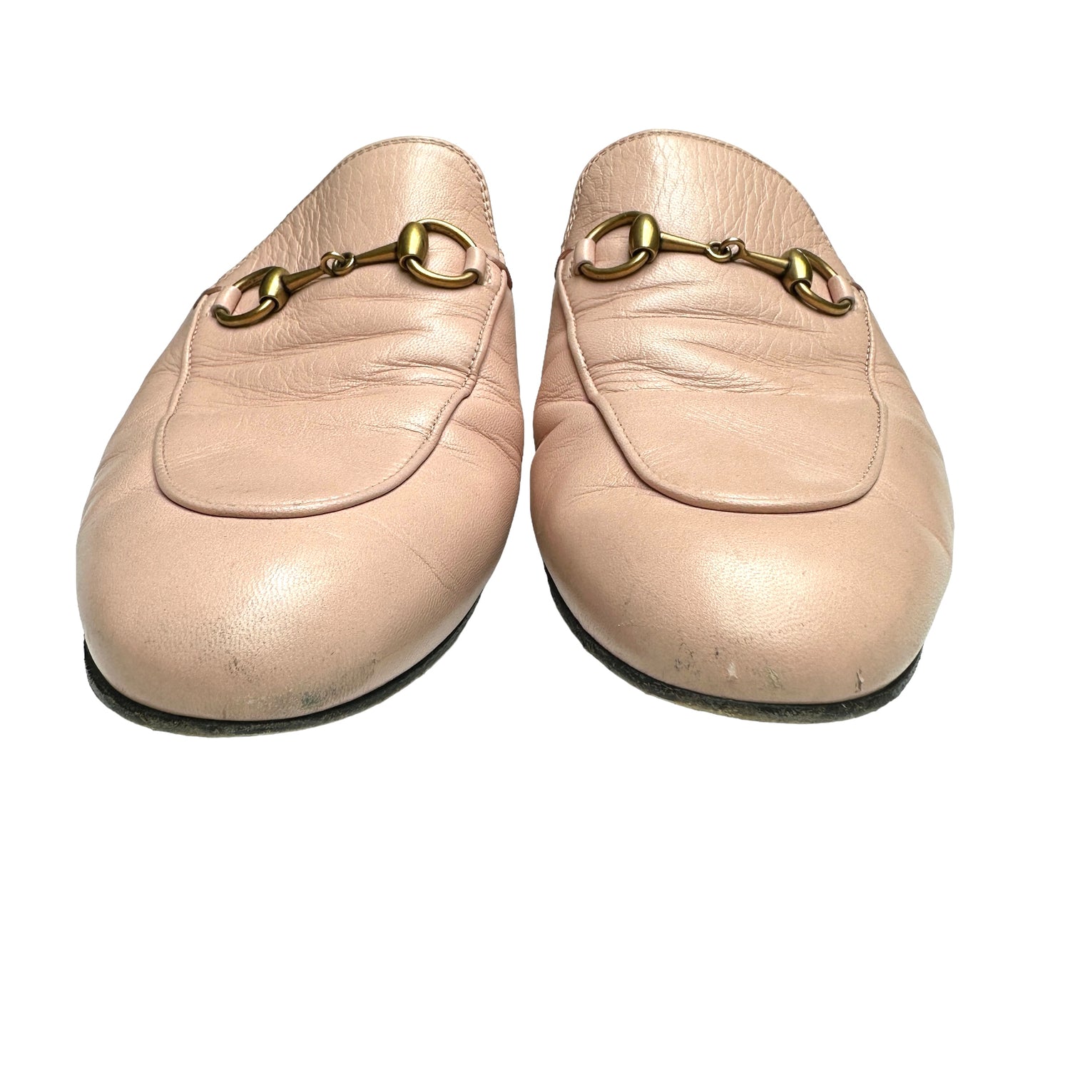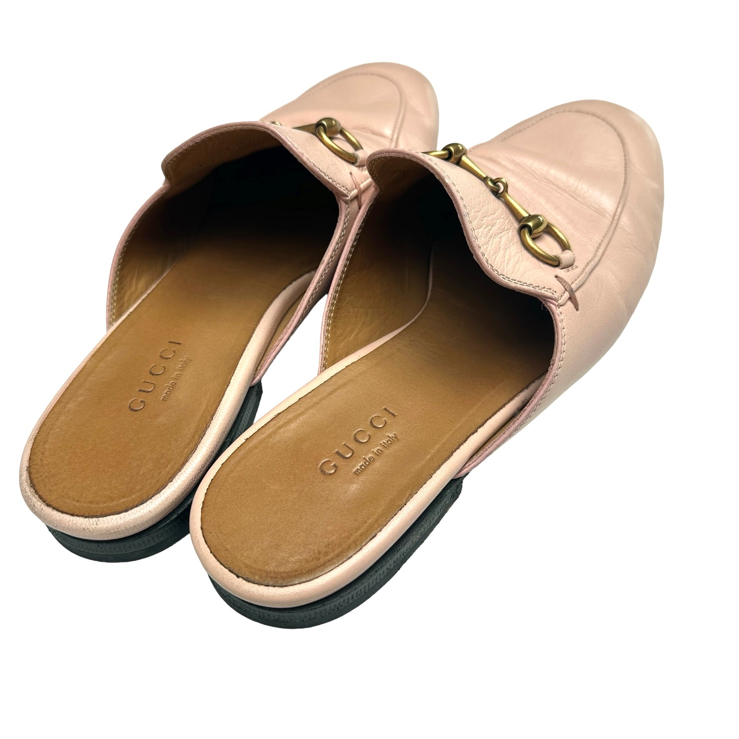 Gucci powder pink leather Princetown mules. Gold-tone Gucci horse bite. Designer size 36.