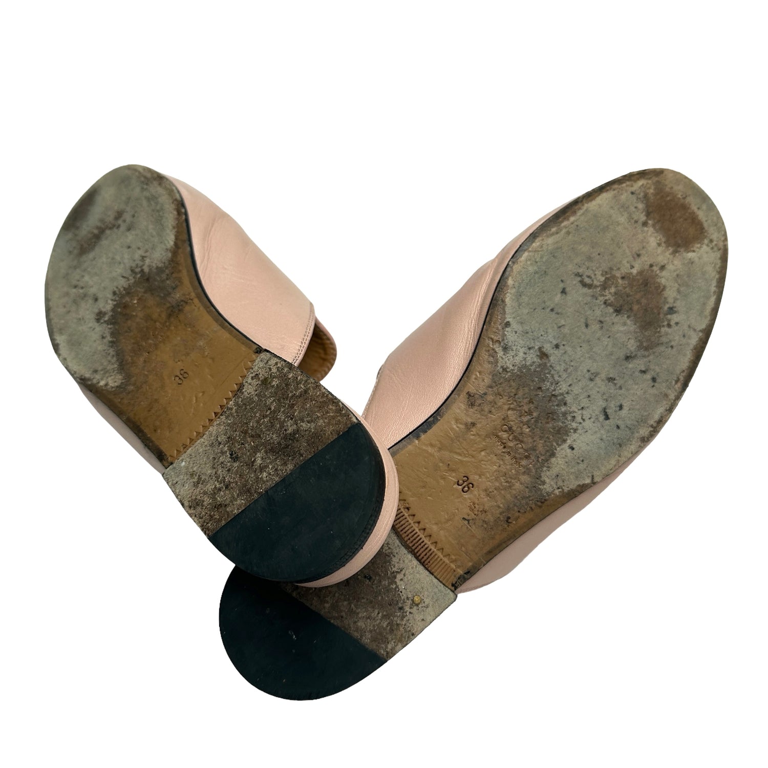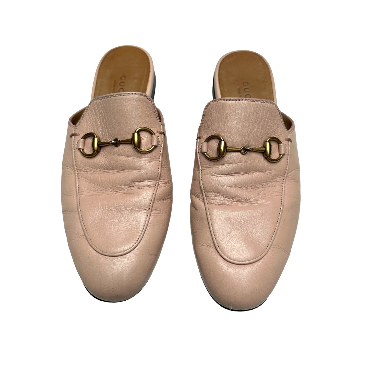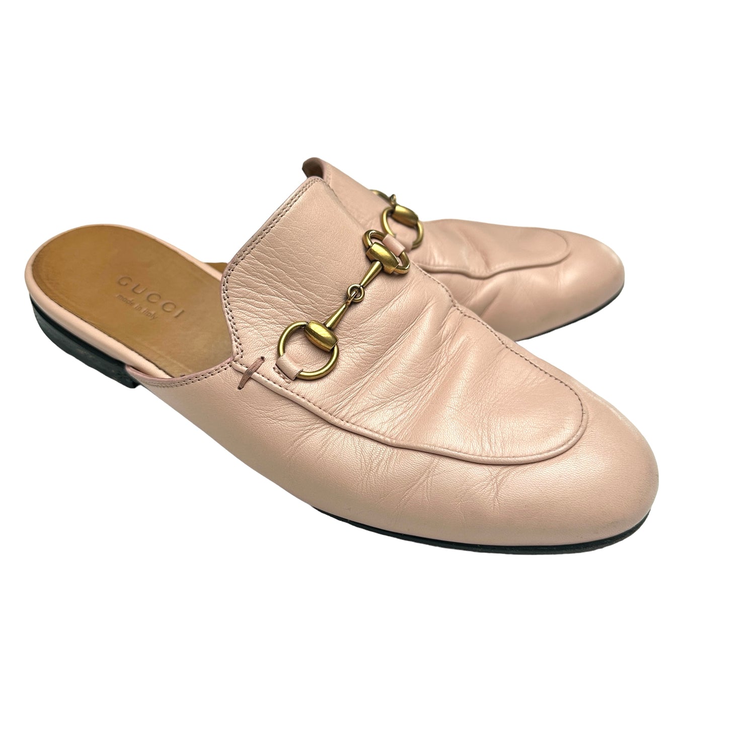 Gucci powder pink leather Princetown mules. Gold-tone Gucci horse bite. Designer size 36.