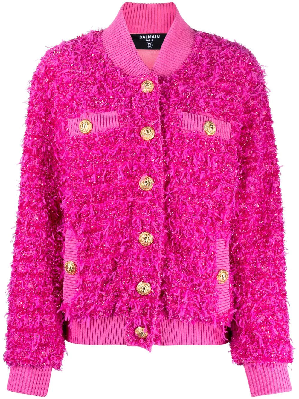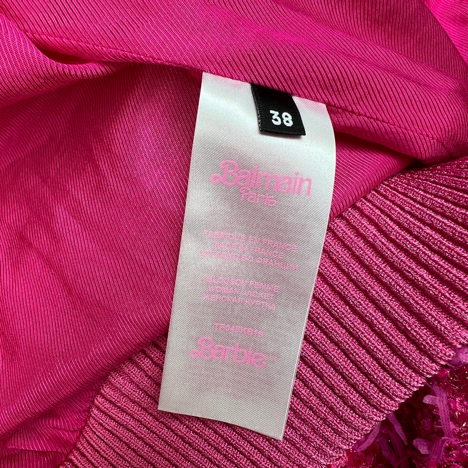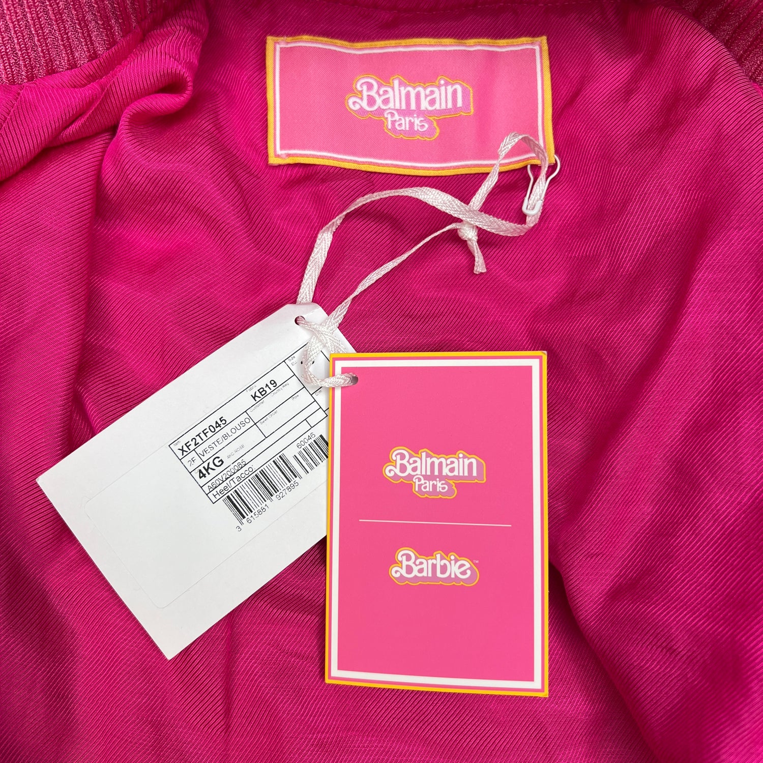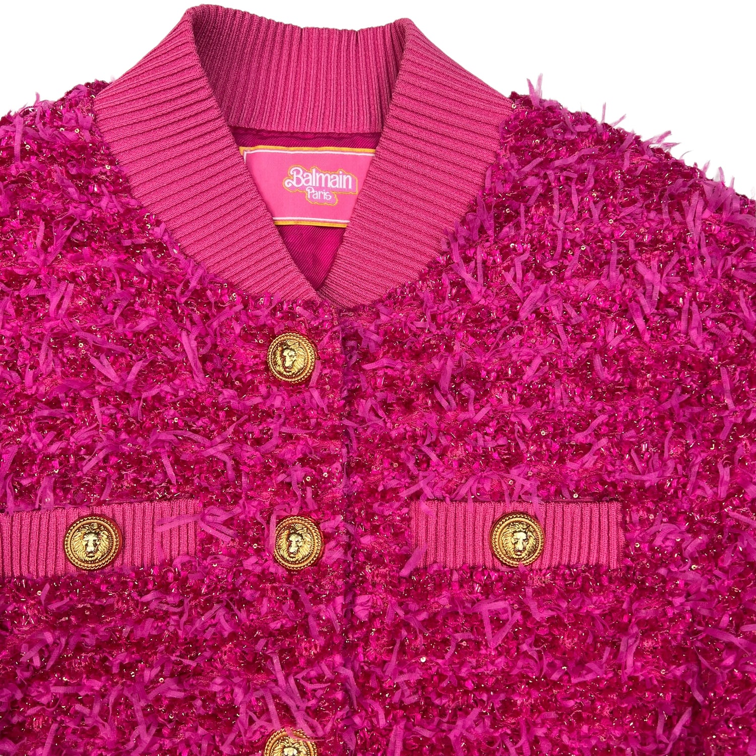 The classic bomber jacket is given an iconic makeover thanks to Balmain's collaboration with Barbie ®. Made from metallic tweed, it has ribbed-knit detailing and golden buttons. Designer size 38.