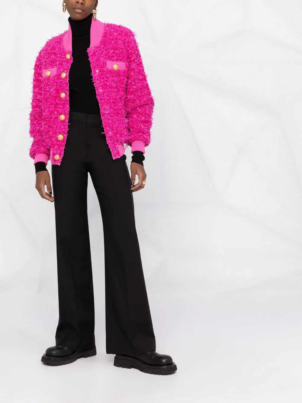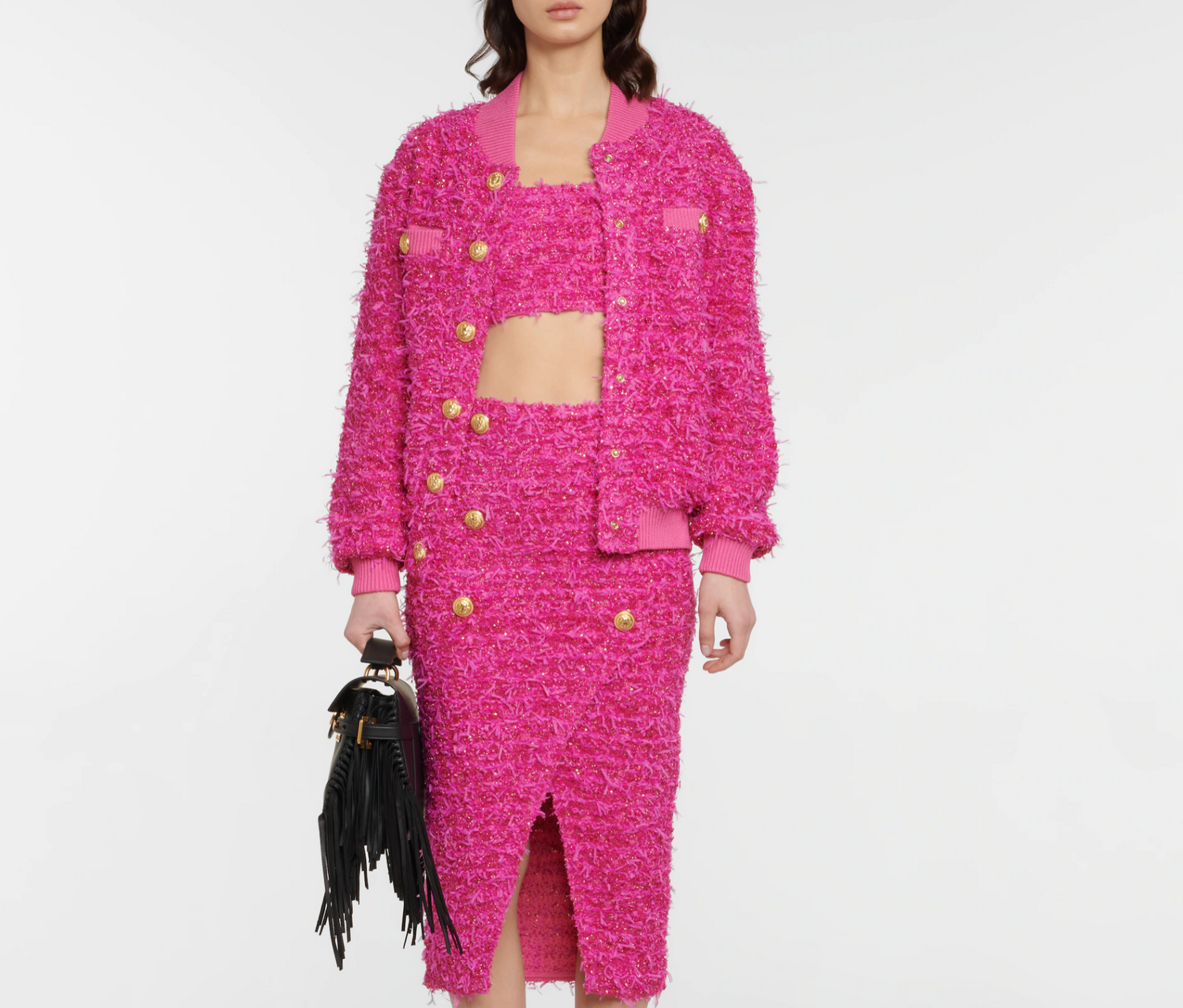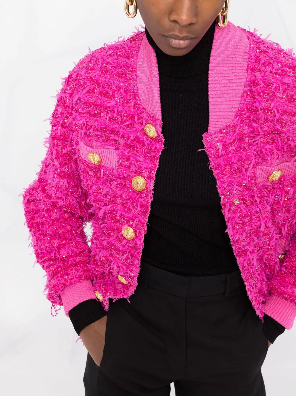 The classic bomber jacket is given an iconic makeover thanks to Balmain's collaboration with Barbie ®. Made from metallic tweed, it has ribbed-knit detailing and golden buttons. Designer size 38.
