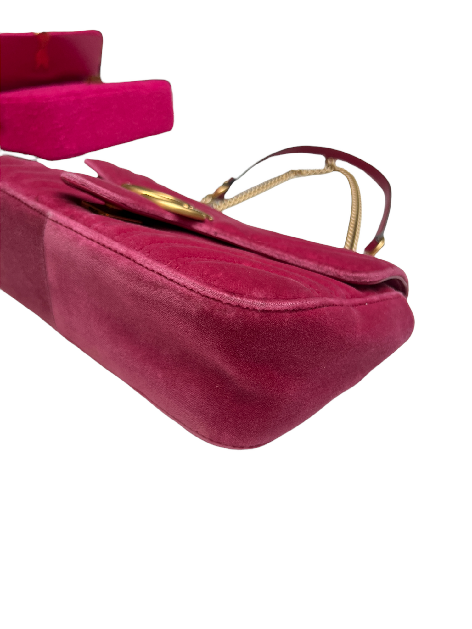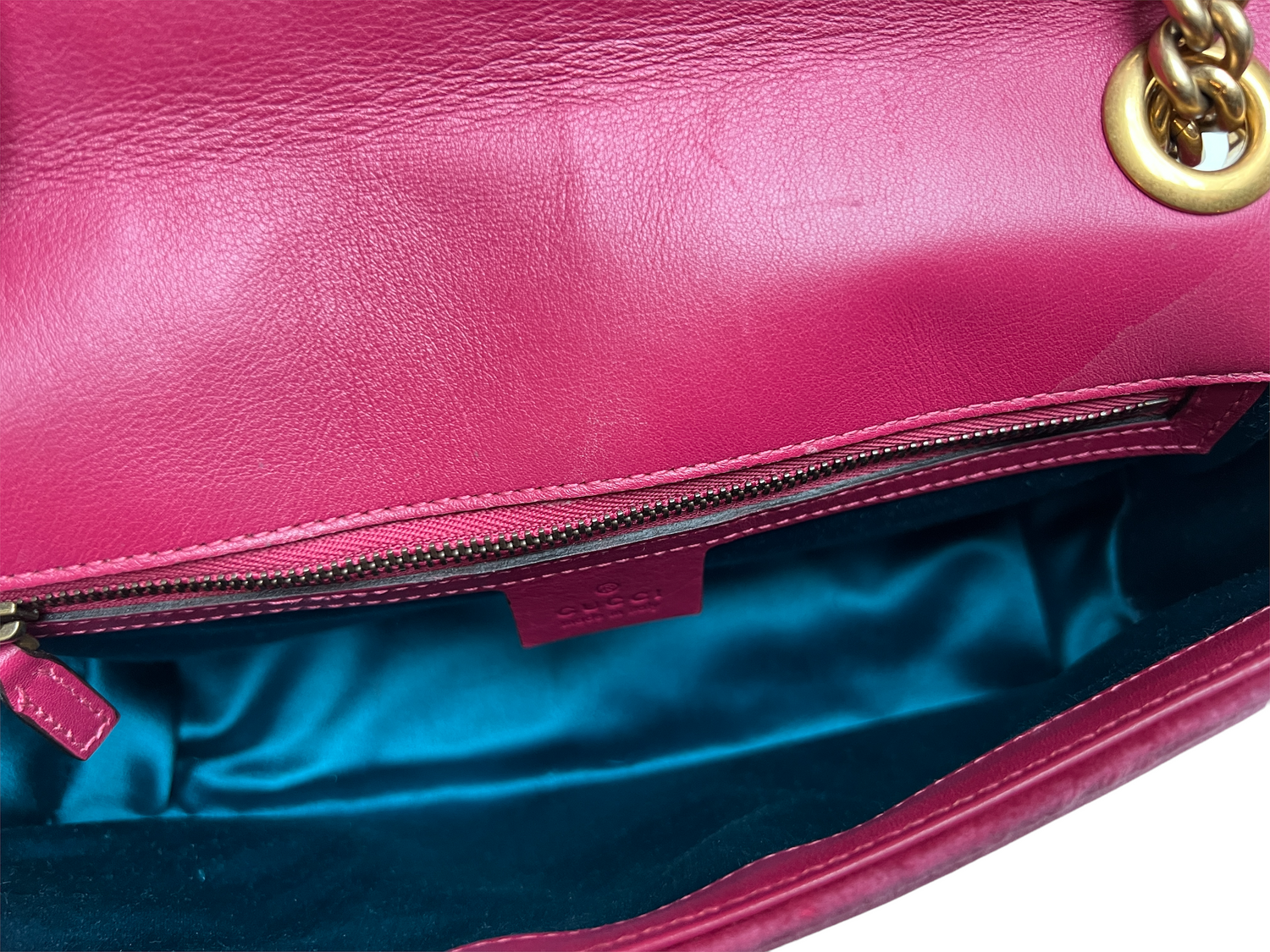 Gucci Marmont. Double chain and leather straps. This bag can be worn as a shoulder bag or crossbody. Gold-tone hardware. GG clasp closure at front. Silk lining. One zipped pocket inside.