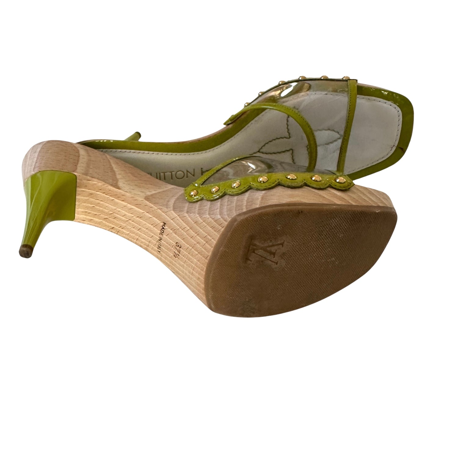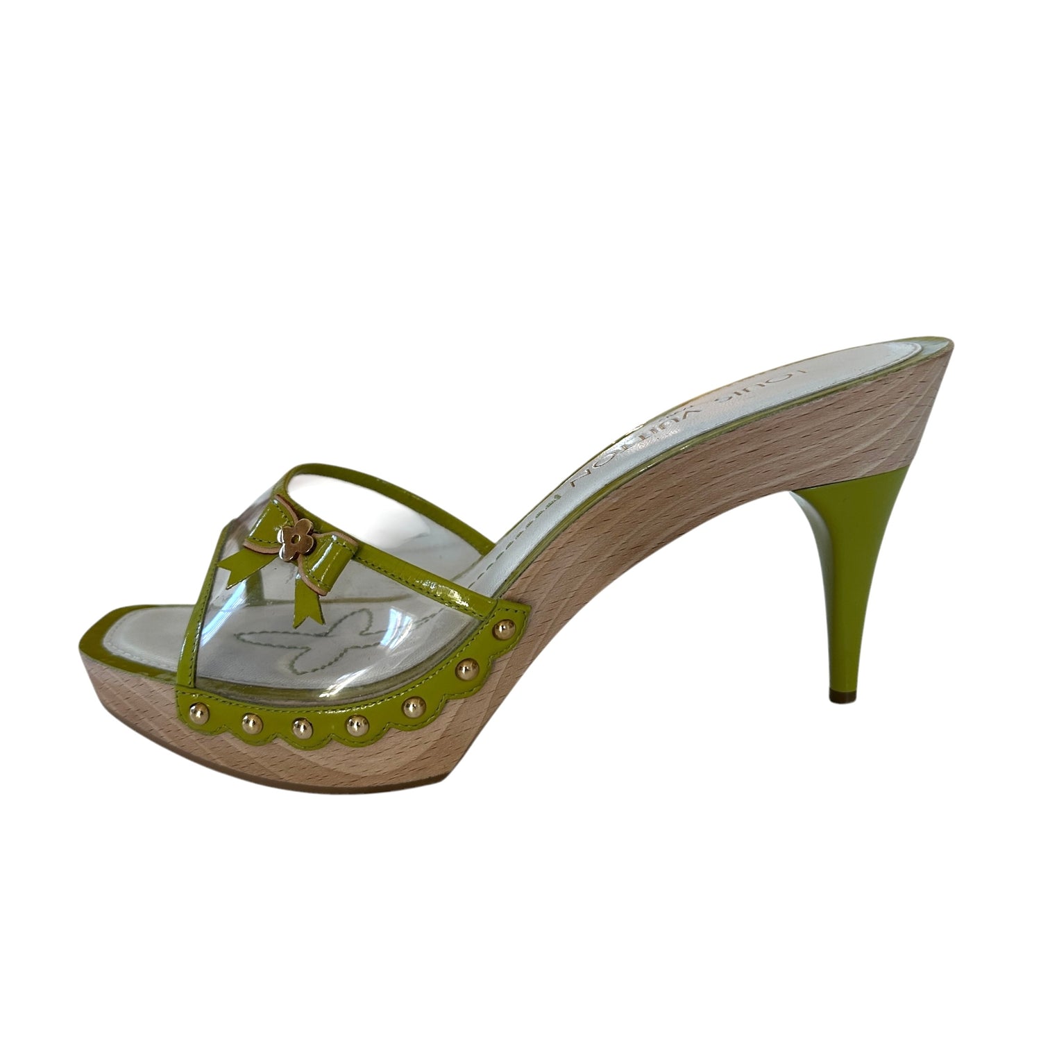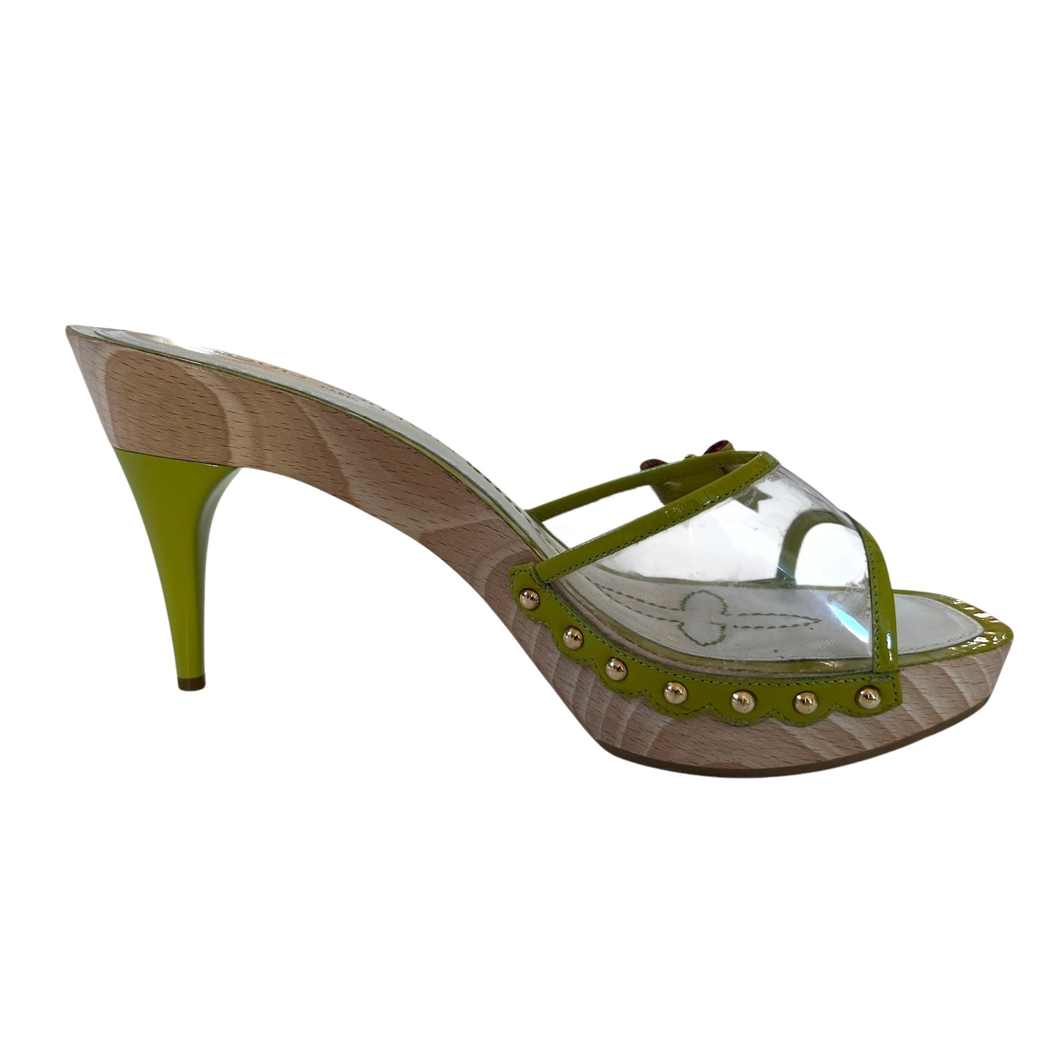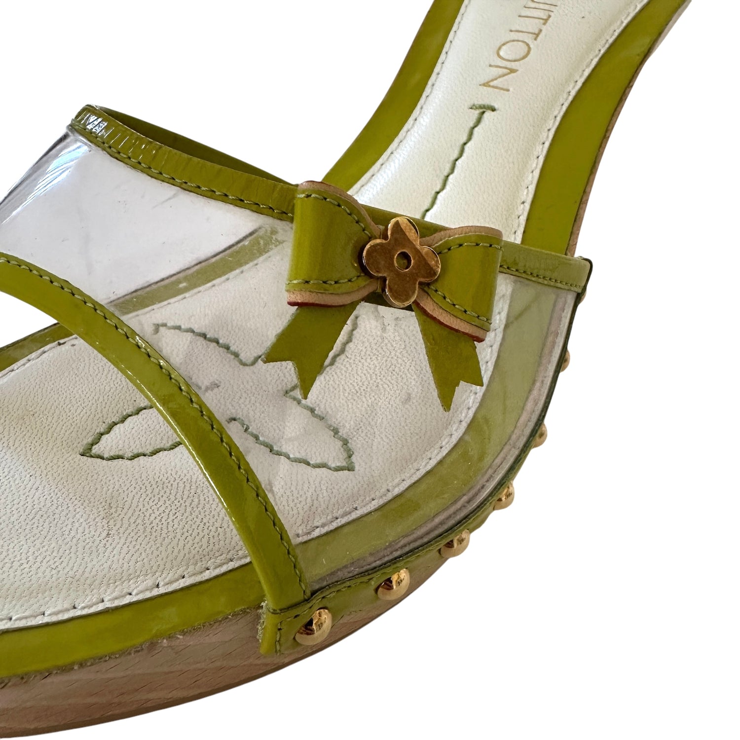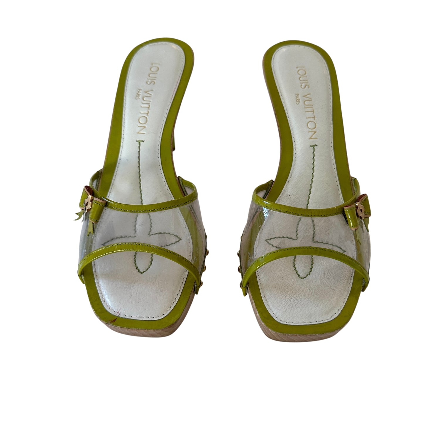 Louis Vuitton plexi and wood sandals. Green patent leather trims. Monogram logo in gold-tone hardware. Rubber outer soles. Designer size 37.5