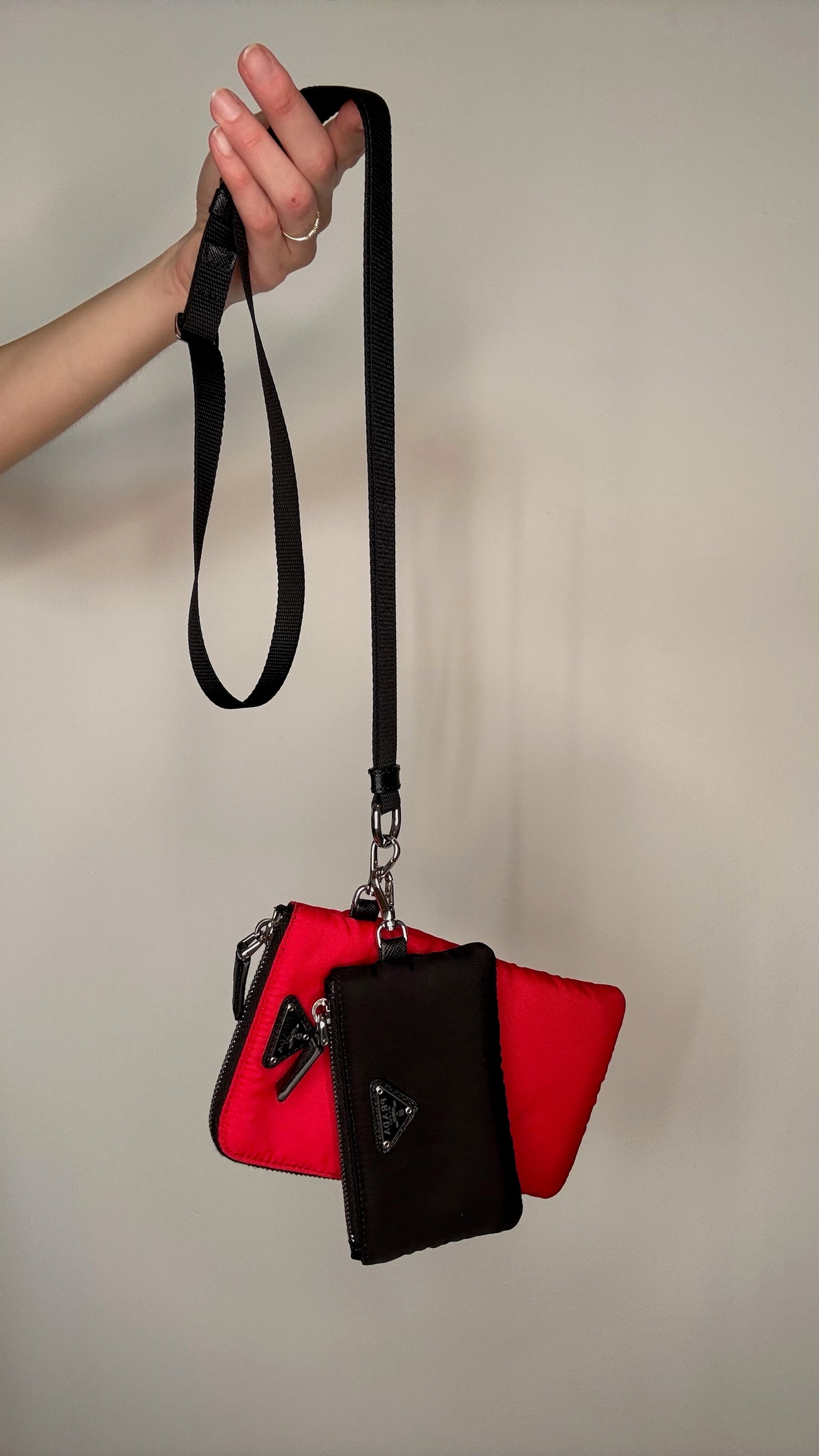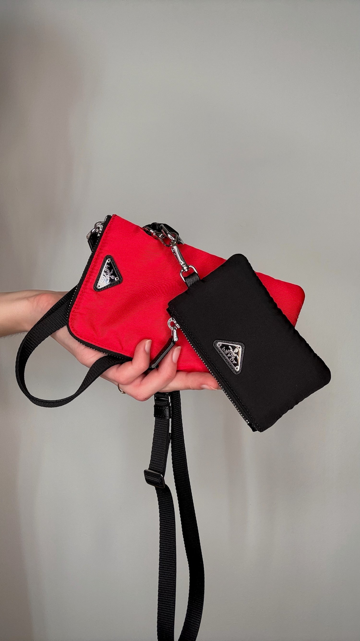Discover the elegance of Prada with this striking clutch set, featuring a sleek black and vibrant red design. Crafted from durable nylon, these clutches offer a perfect blend of style and practicality. Ideal for any occasion, they add a touch of sophistication to your ensemble.