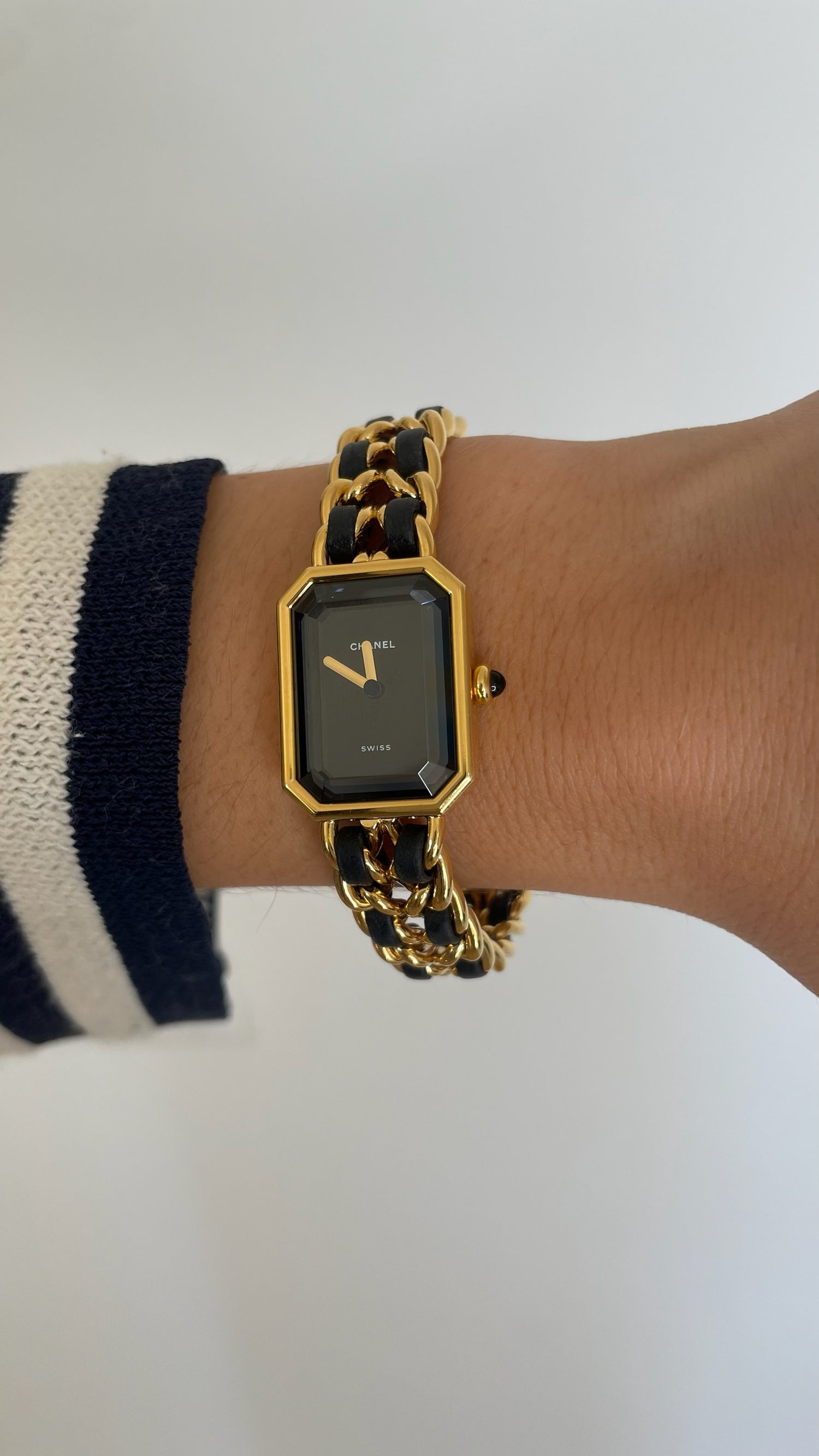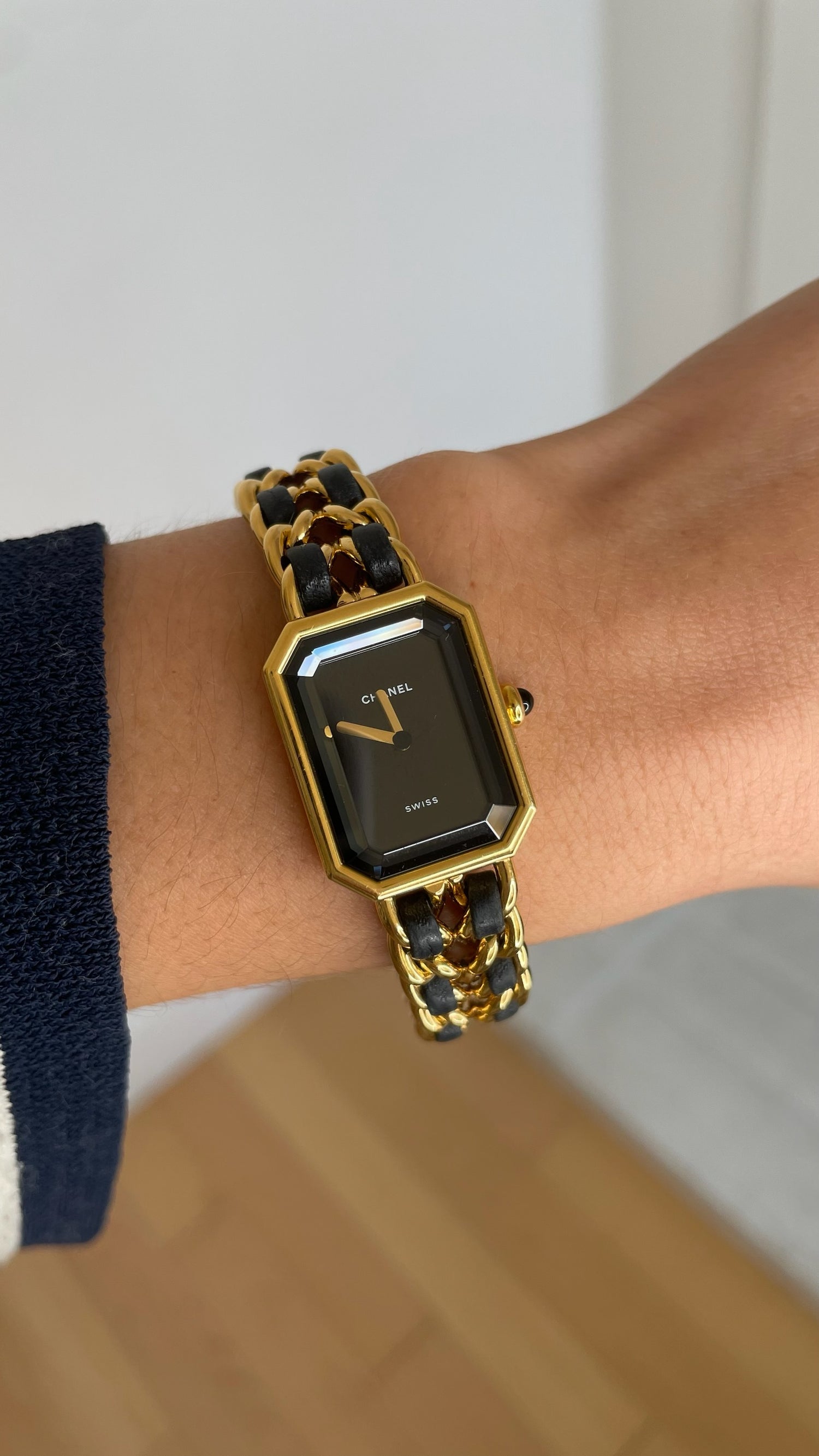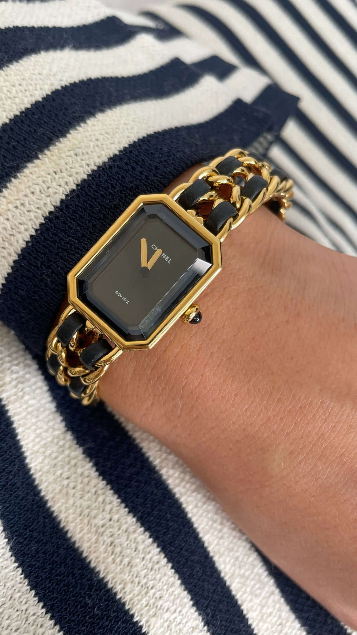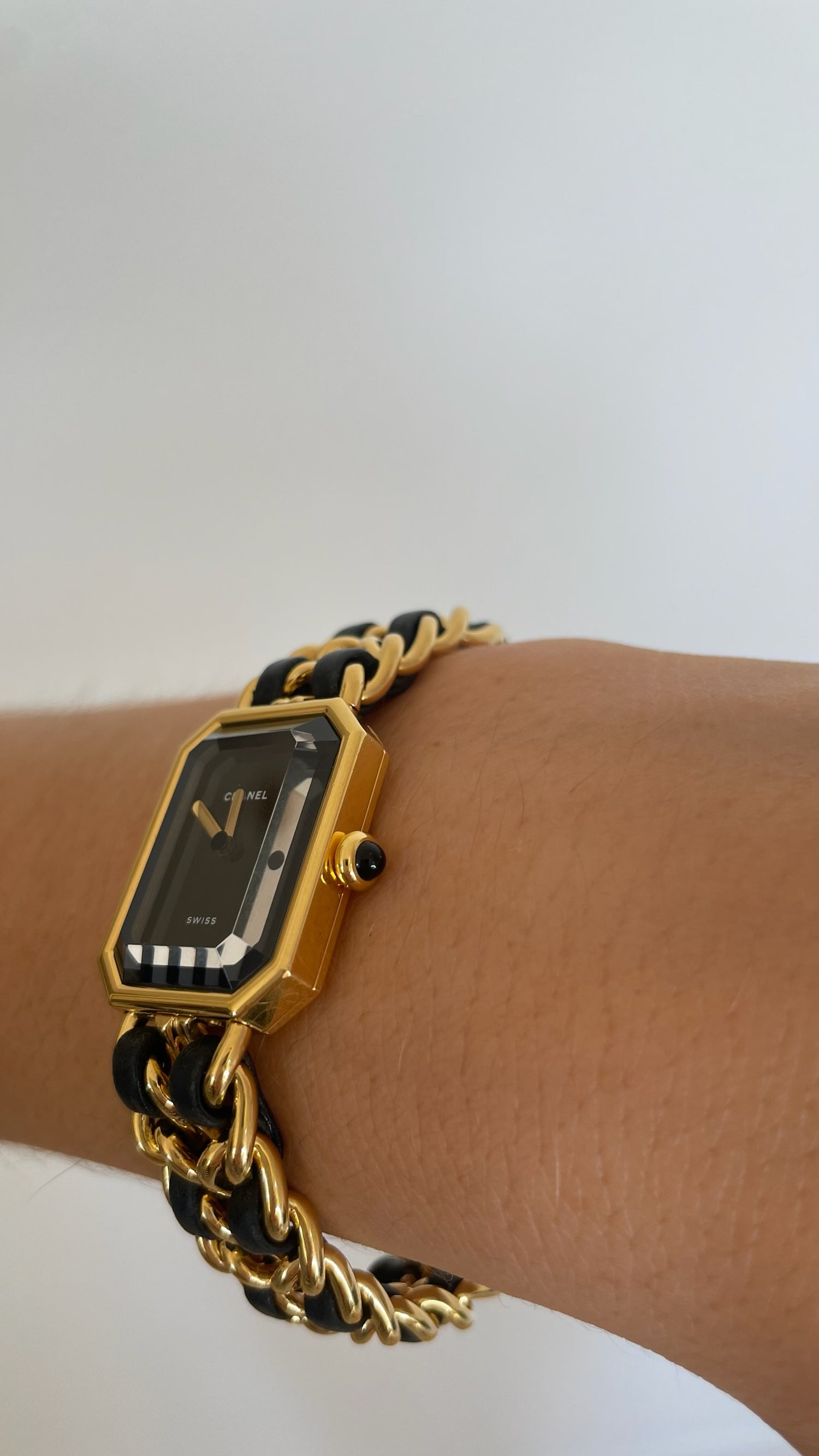 Chanel Premiere watch. Black dial. Black lambskin leather with 18K yellow gold-plated hardware. Stainless steel and 18K vermeil. Quartz movement. Smooth bazel.