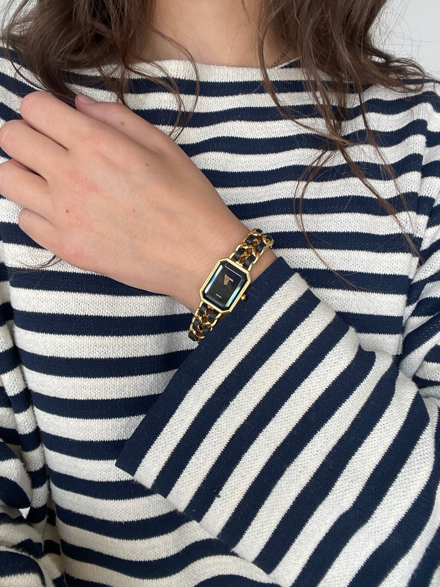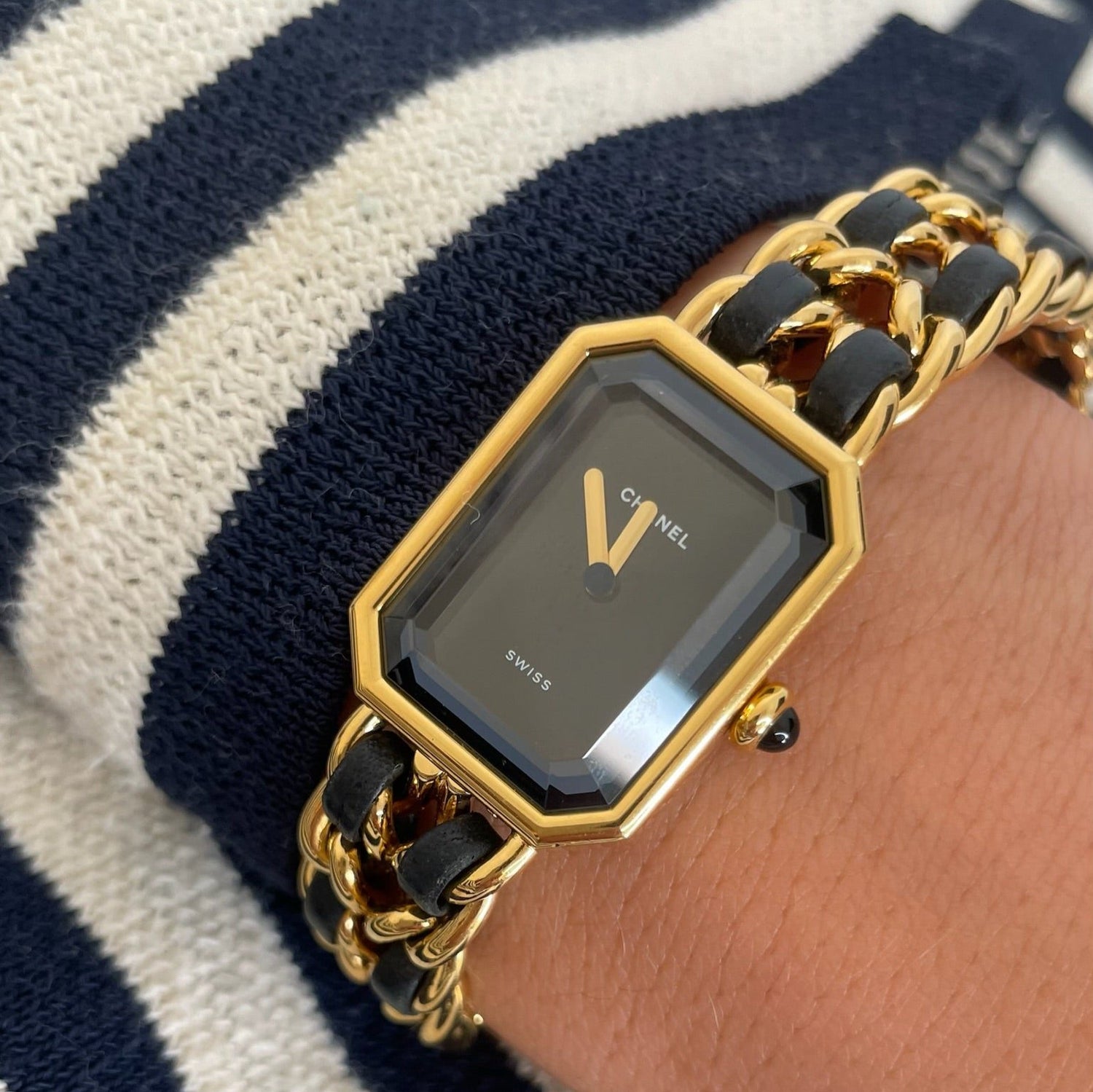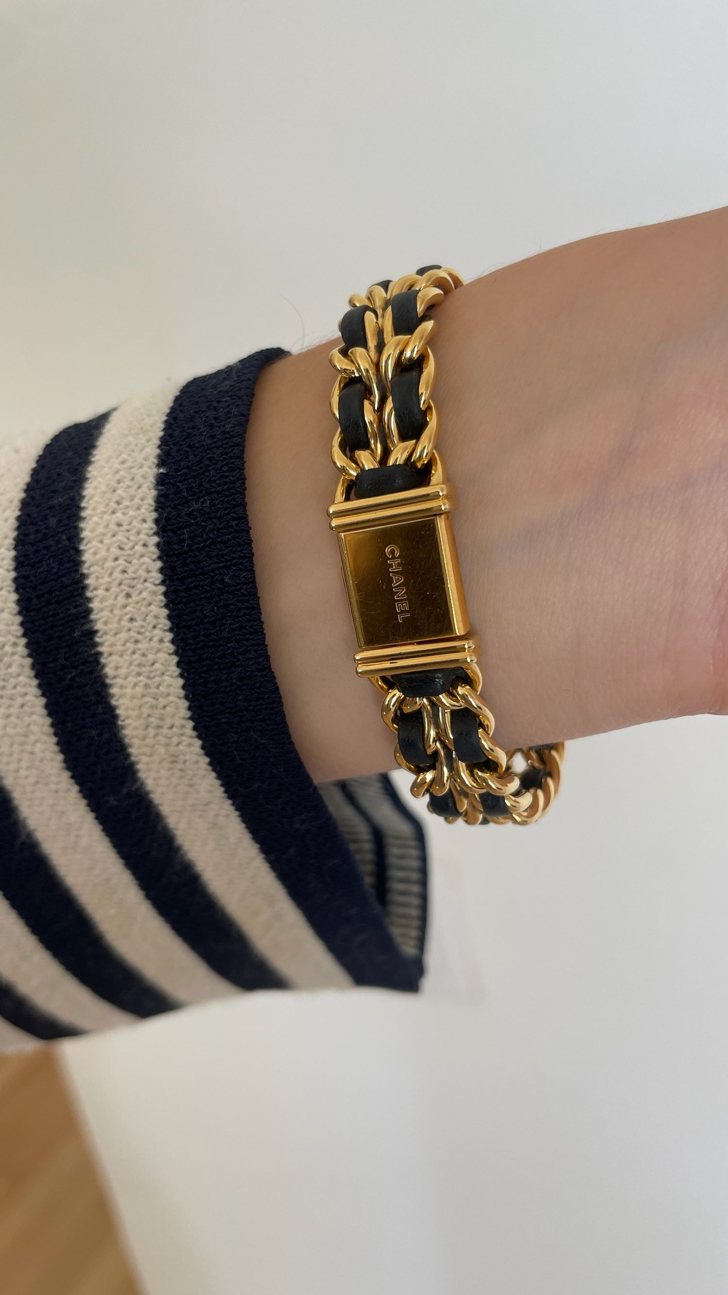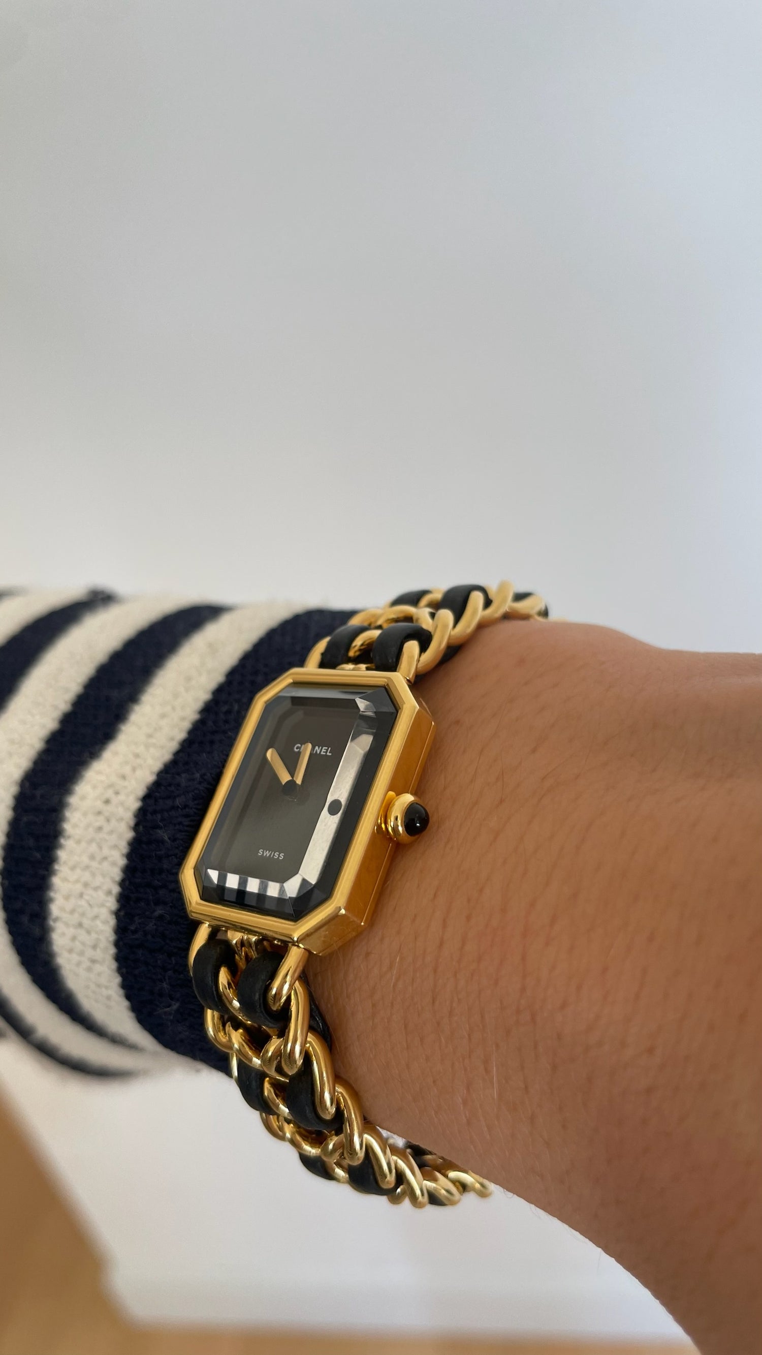 Chanel Premiere watch. Black dial. Black lambskin leather with 18K yellow gold-plated hardware. Stainless steel and 18K vermeil. Quartz movement. Smooth bazel.