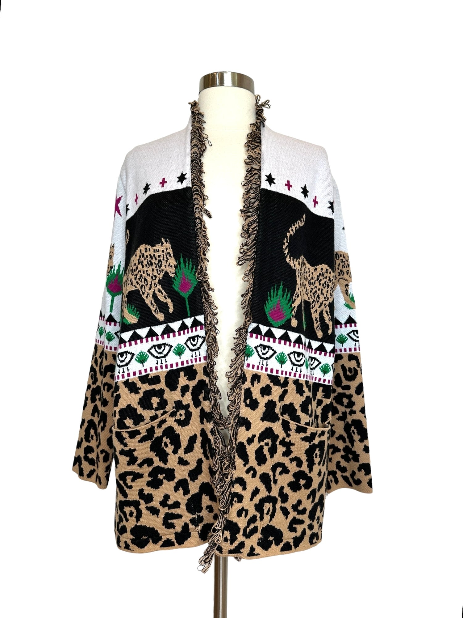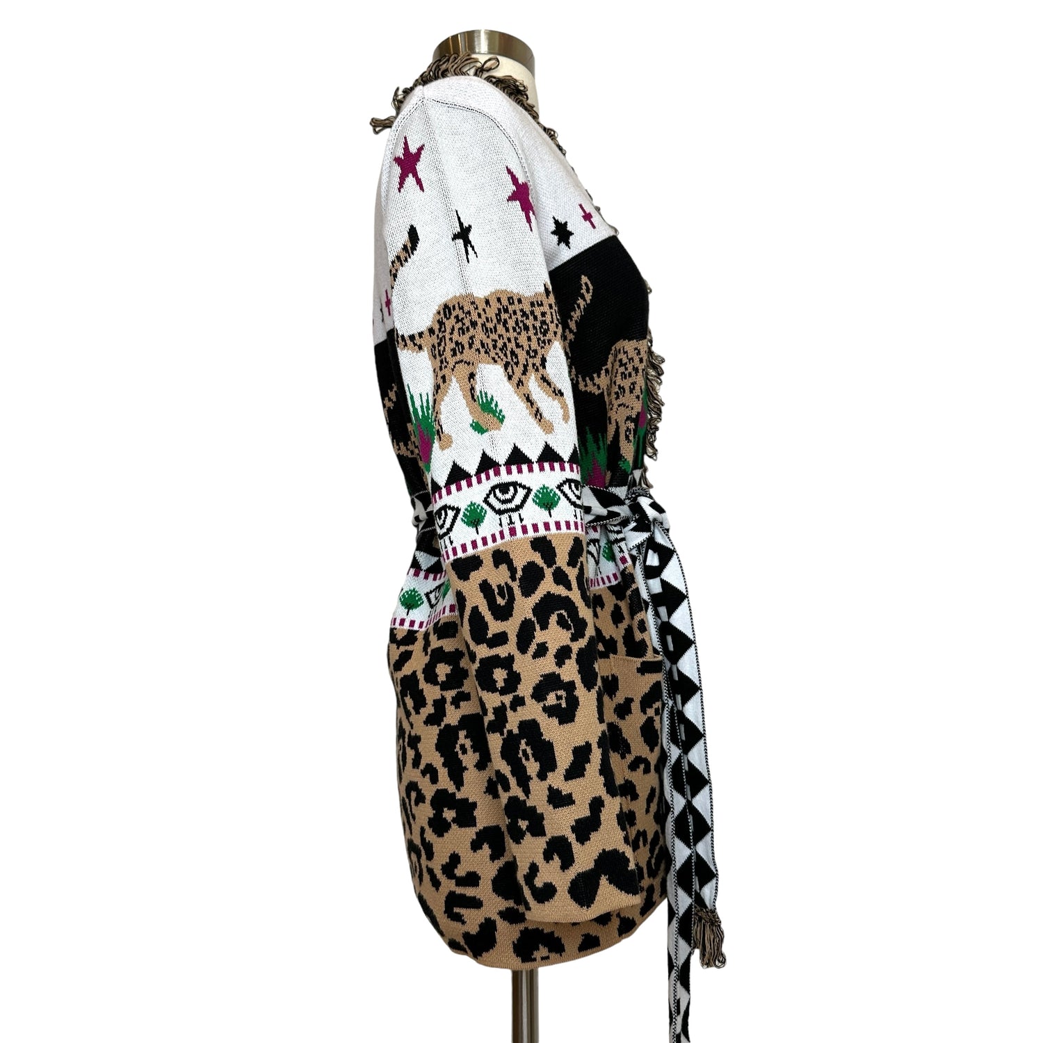 Hayley Menzies printed cotton jacket. Open cardigan style with removable belt. Pockets. Designer size XS.