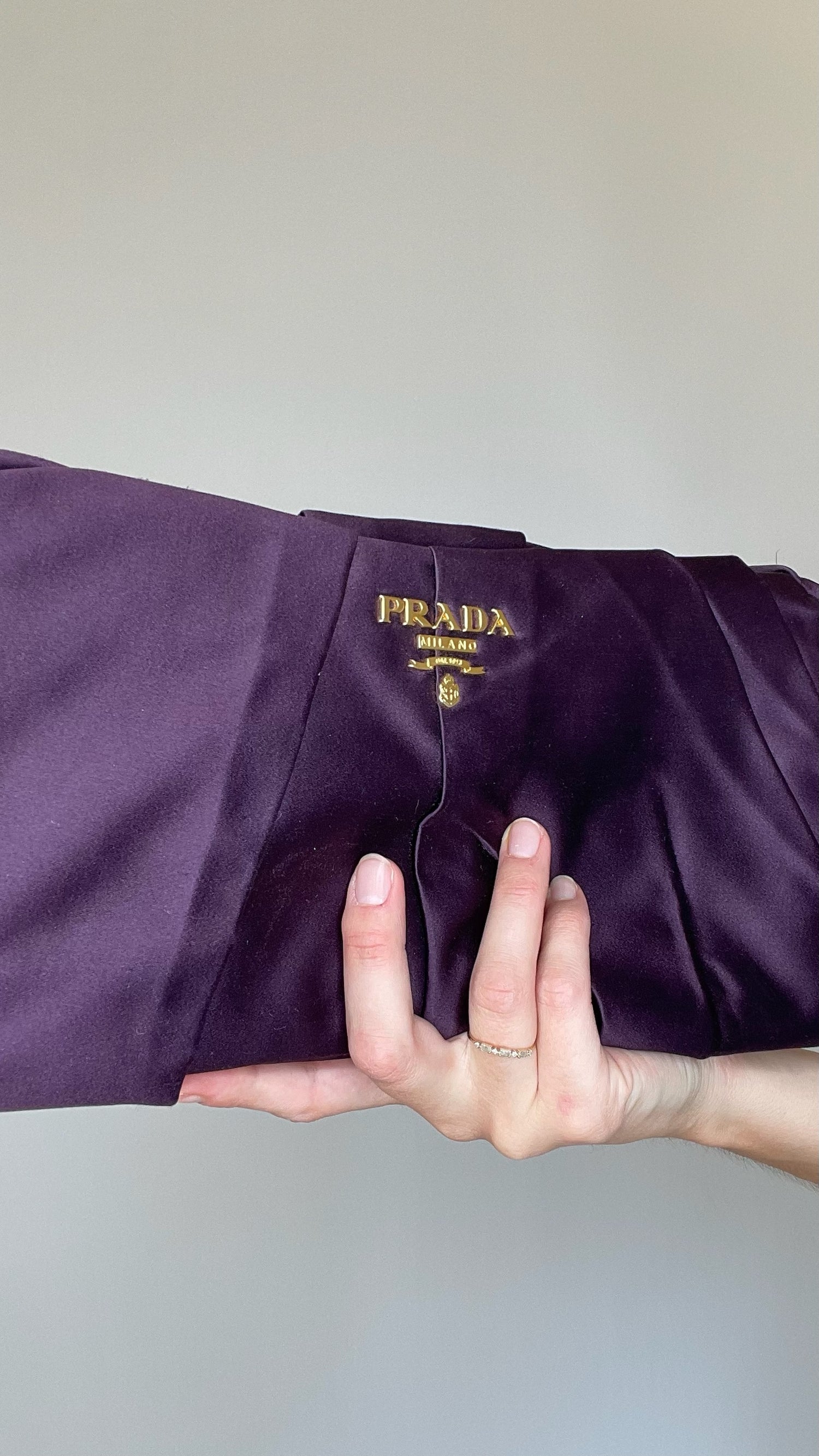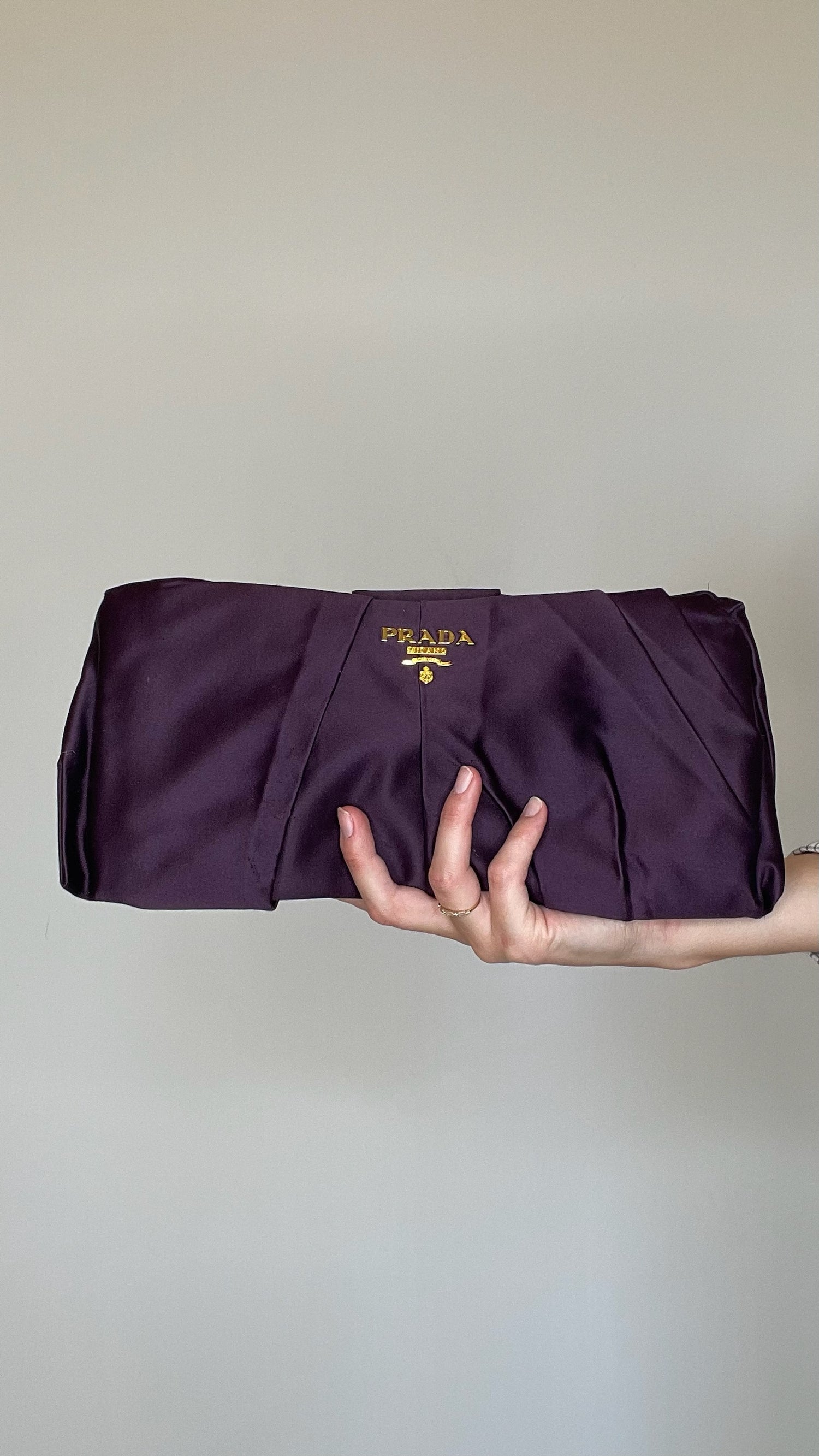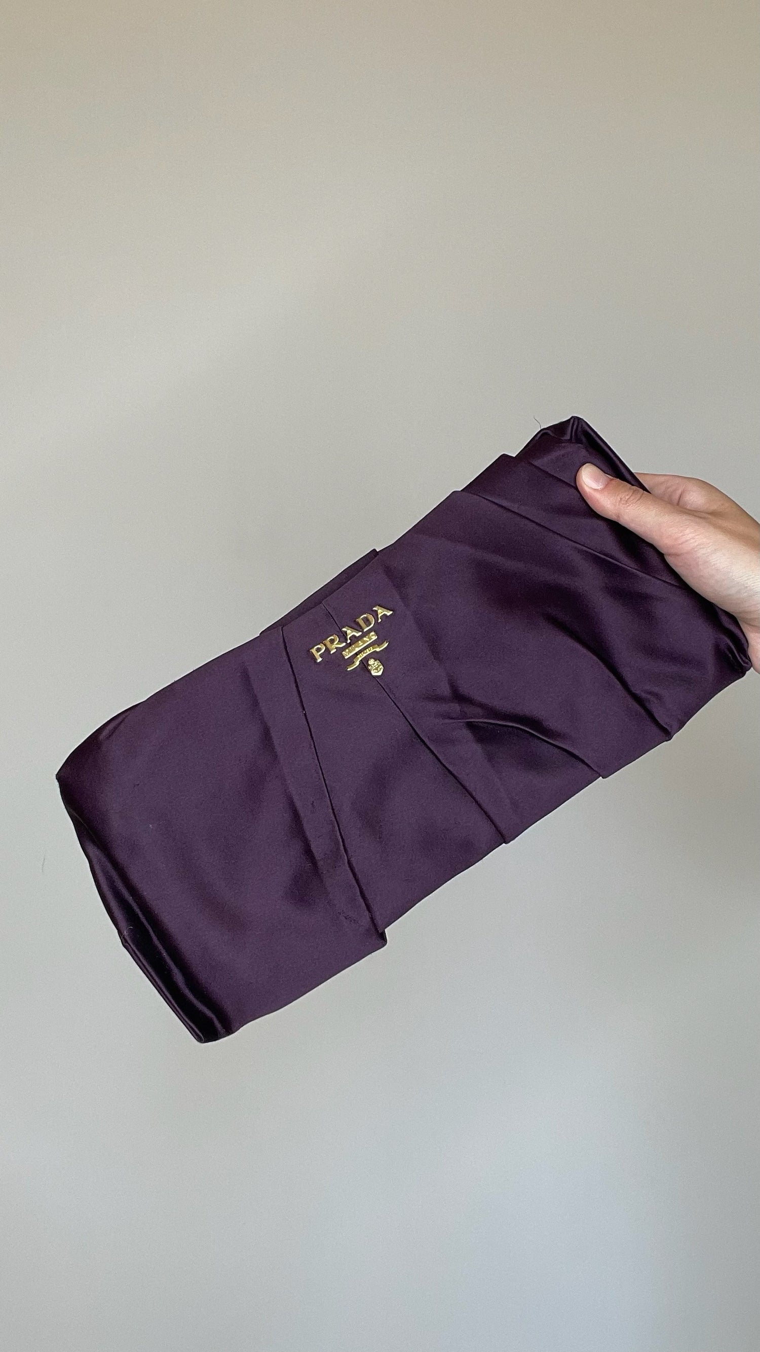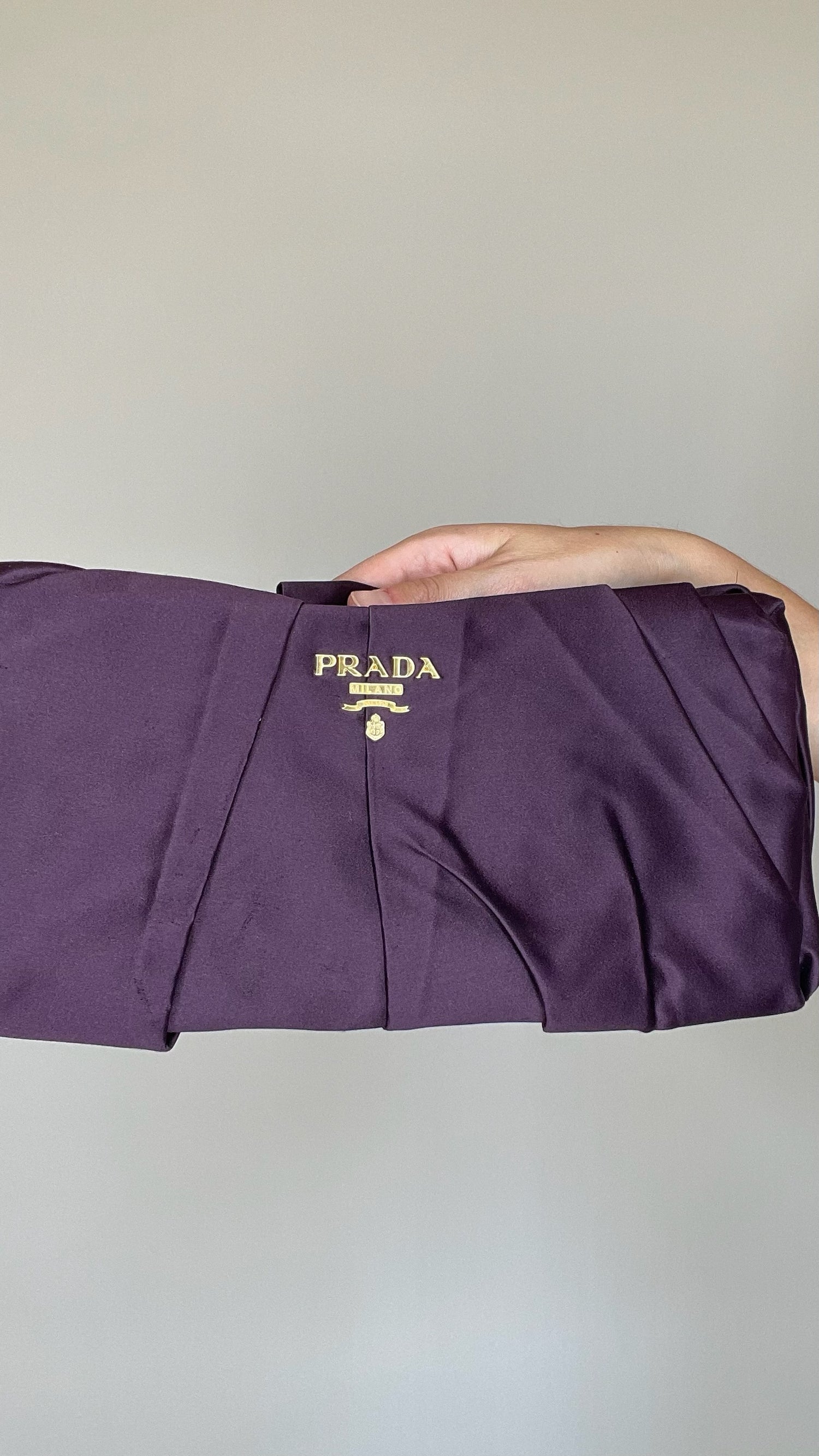 Prada purple satin bag. Gold-tone logo at front.