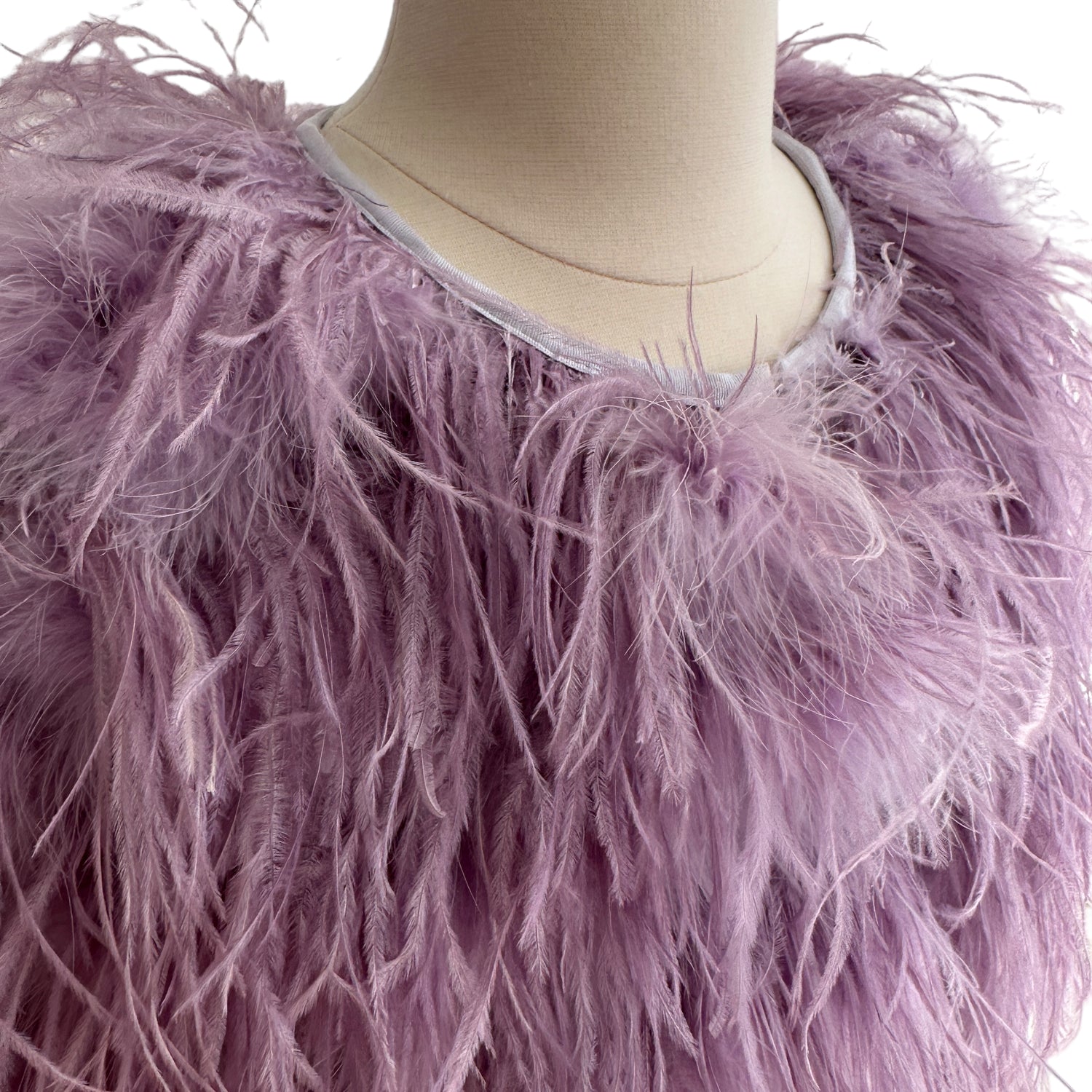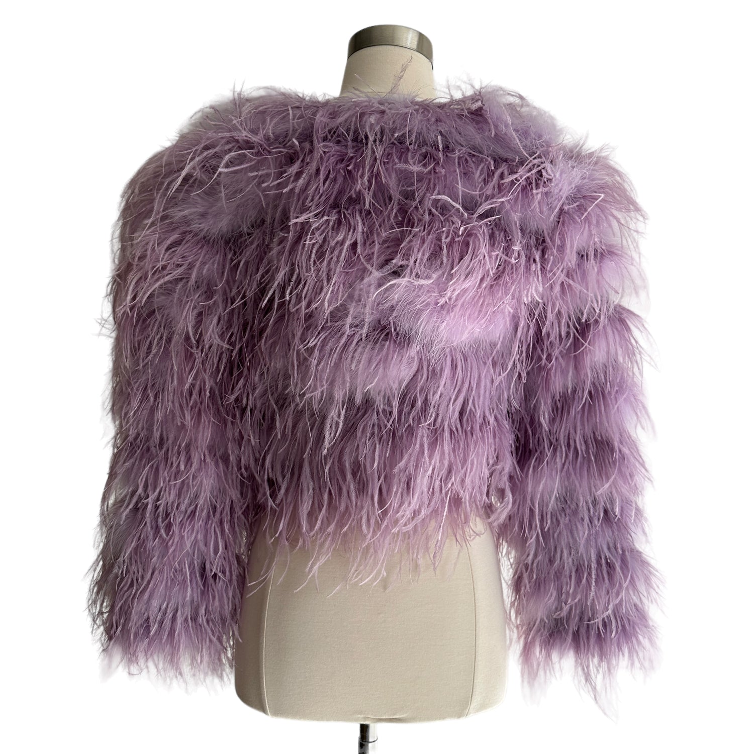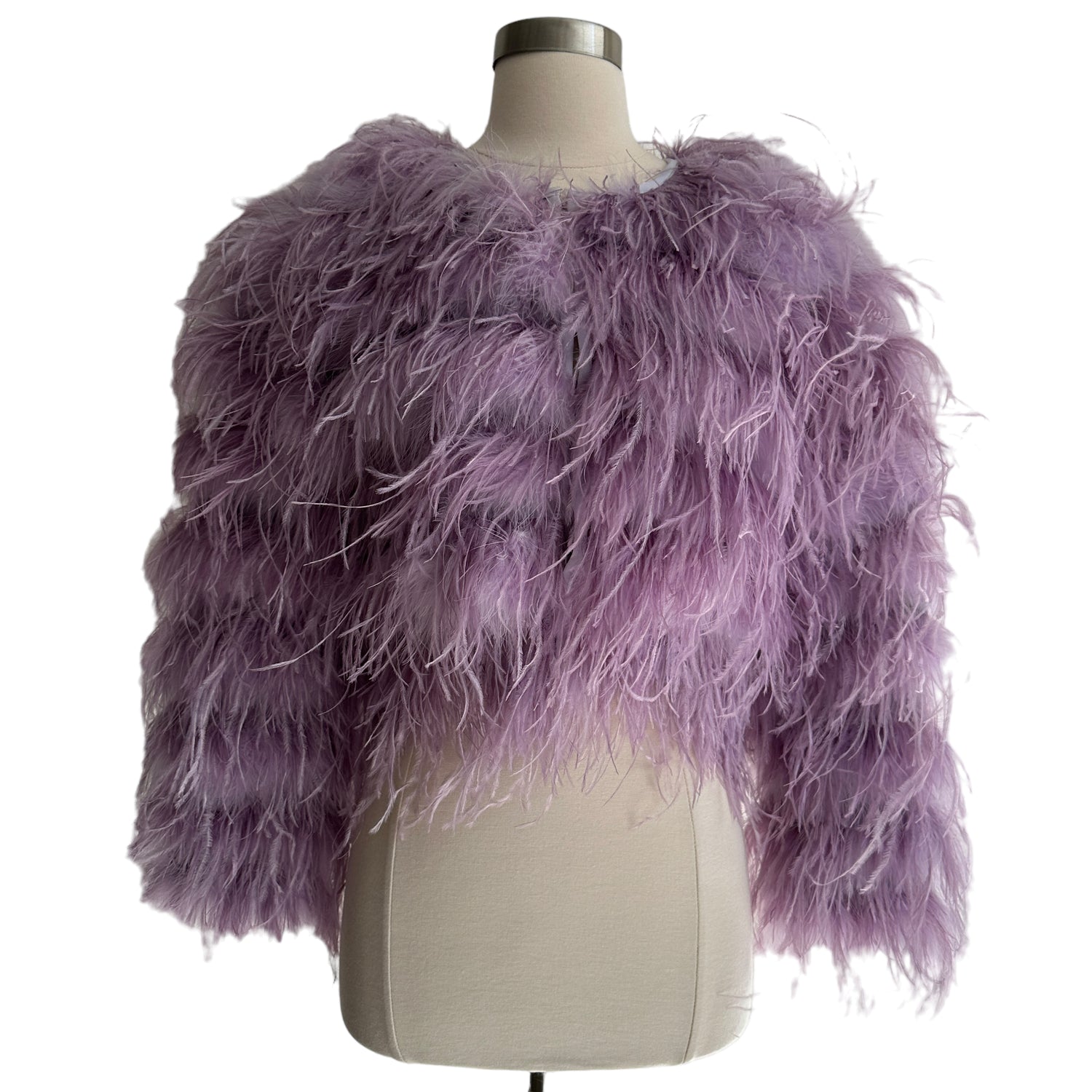 Cinq a Sept purple feather jacket. Concealed front hook closures. Trim around collar. Mesh lining. Layered feather look. Designer size XS/S.