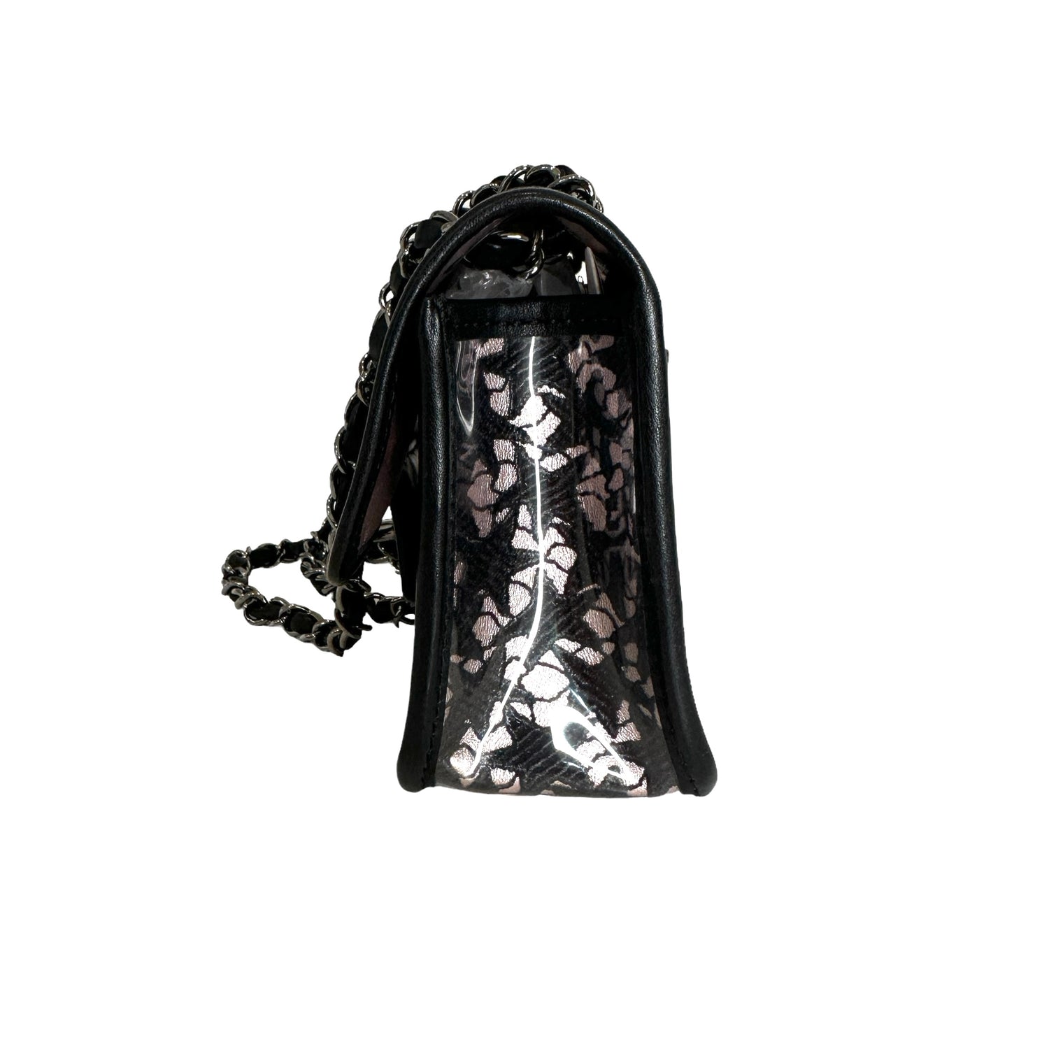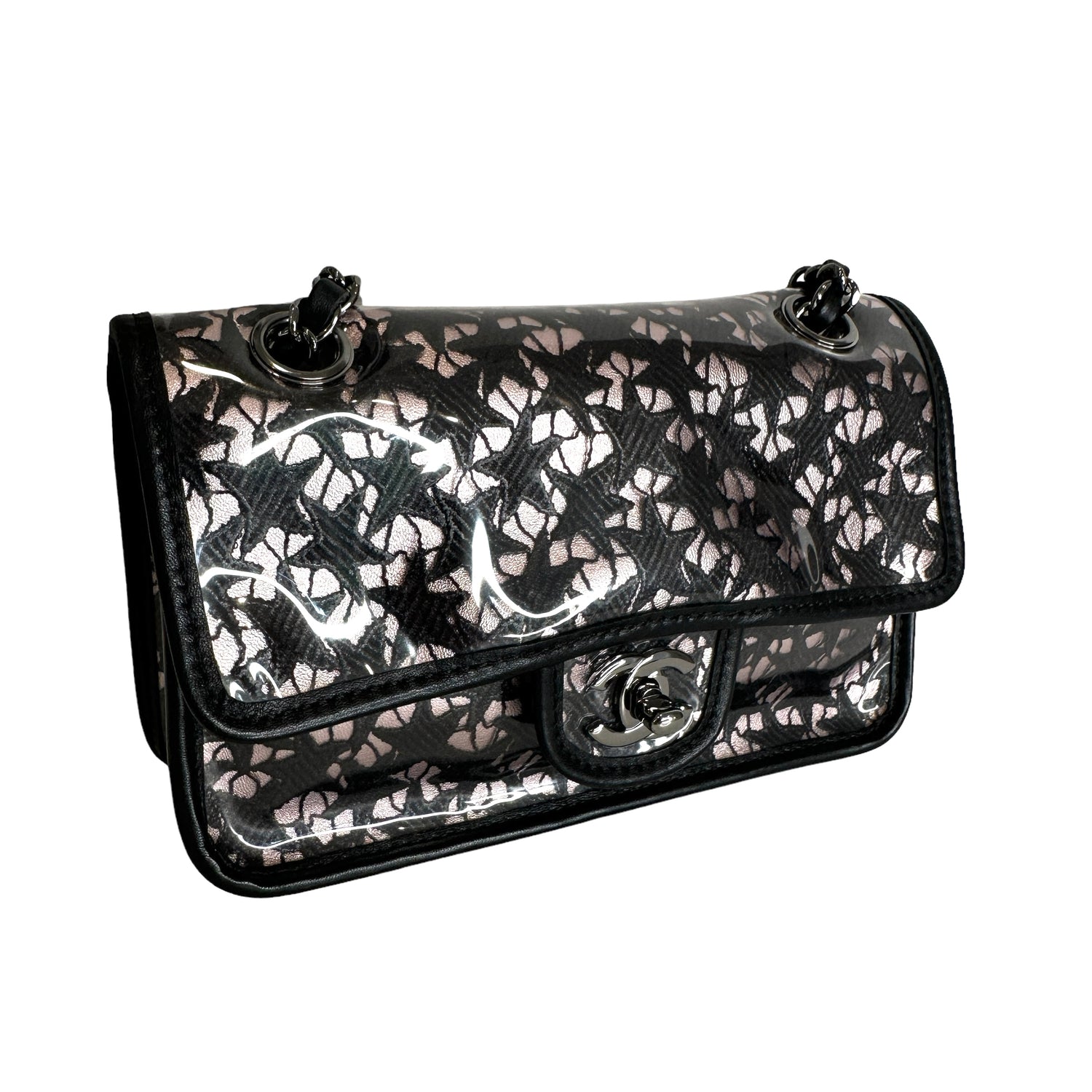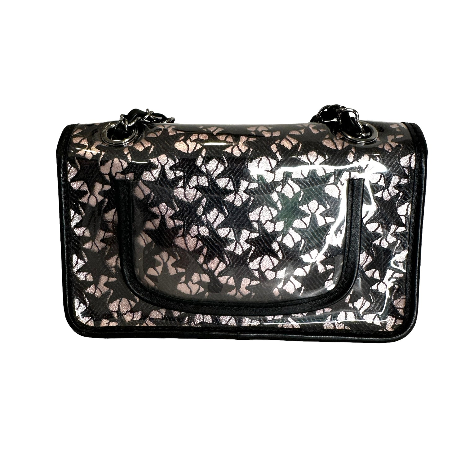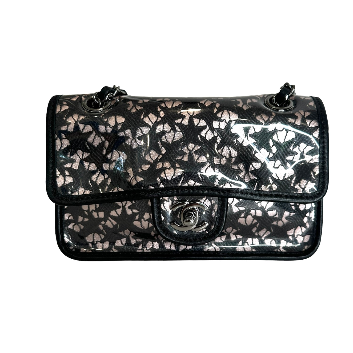 Chanel PCV and stars small single flap. 2006-2008 collection by Karl Lagerfeld. Transparent PVC on pink lambskin leather with stars. Gunmetal CC turn-lock and hardware. Black lambskin leather trims. One interior slit pocket. One exterior back pocket.