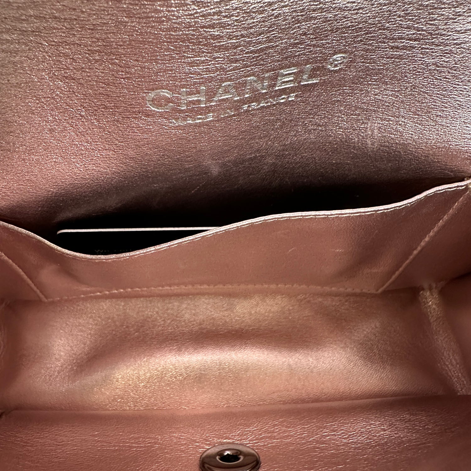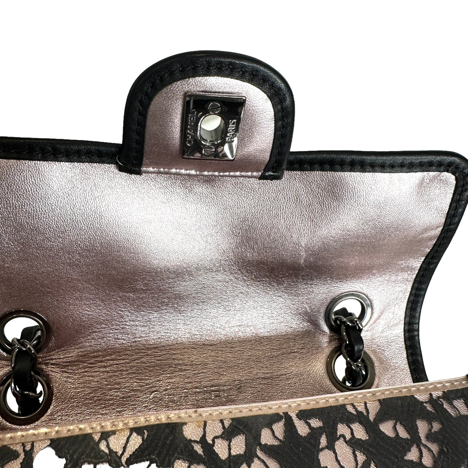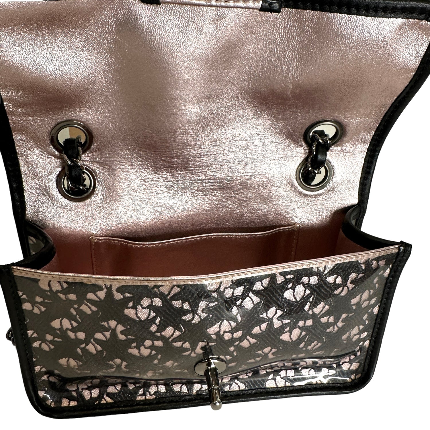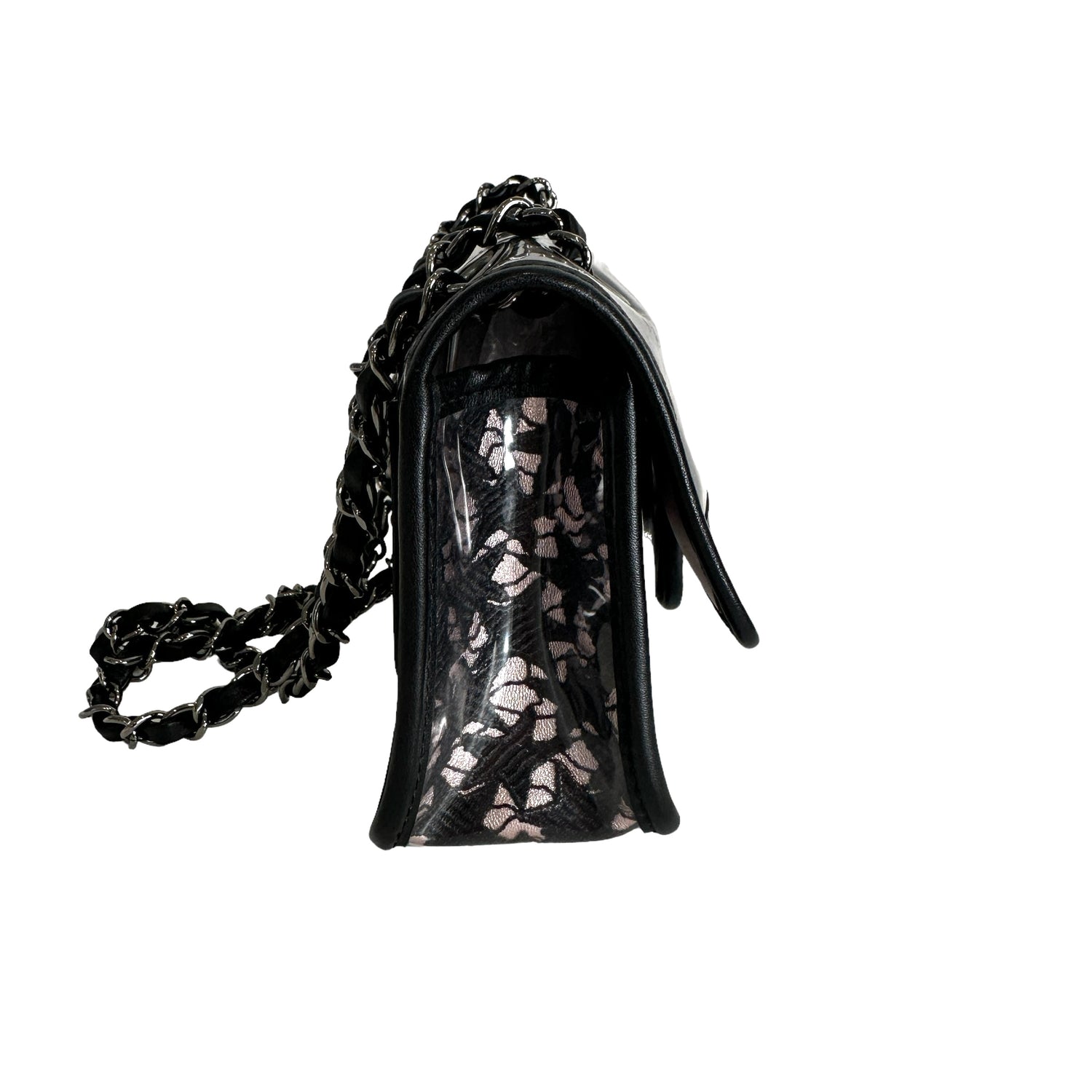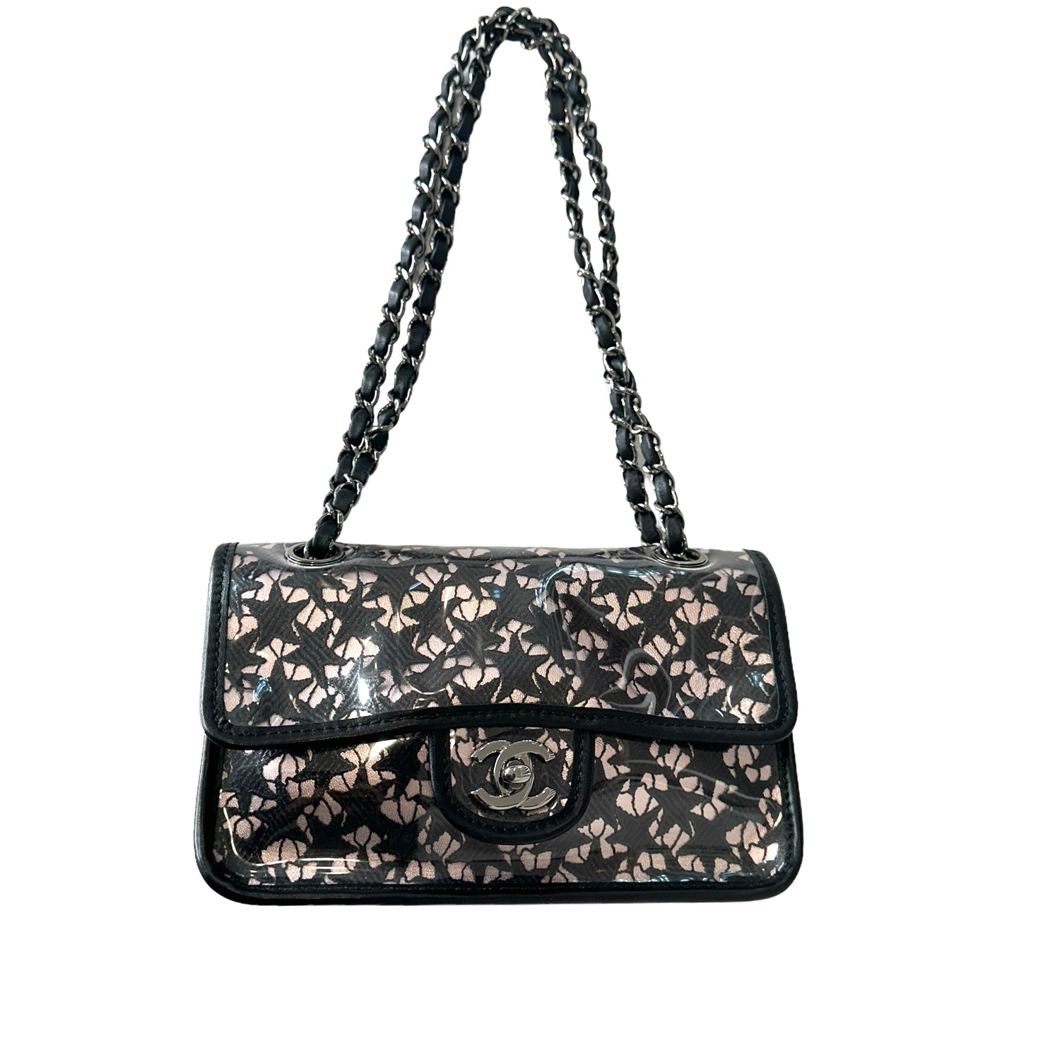 Chanel PCV and stars small single flap. 2006-2008 collection by Karl Lagerfeld. Transparent PVC on pink lambskin leather with stars. Gunmetal CC turn-lock and hardware. Black lambskin leather trims. One interior slit pocket. One exterior back pocket.