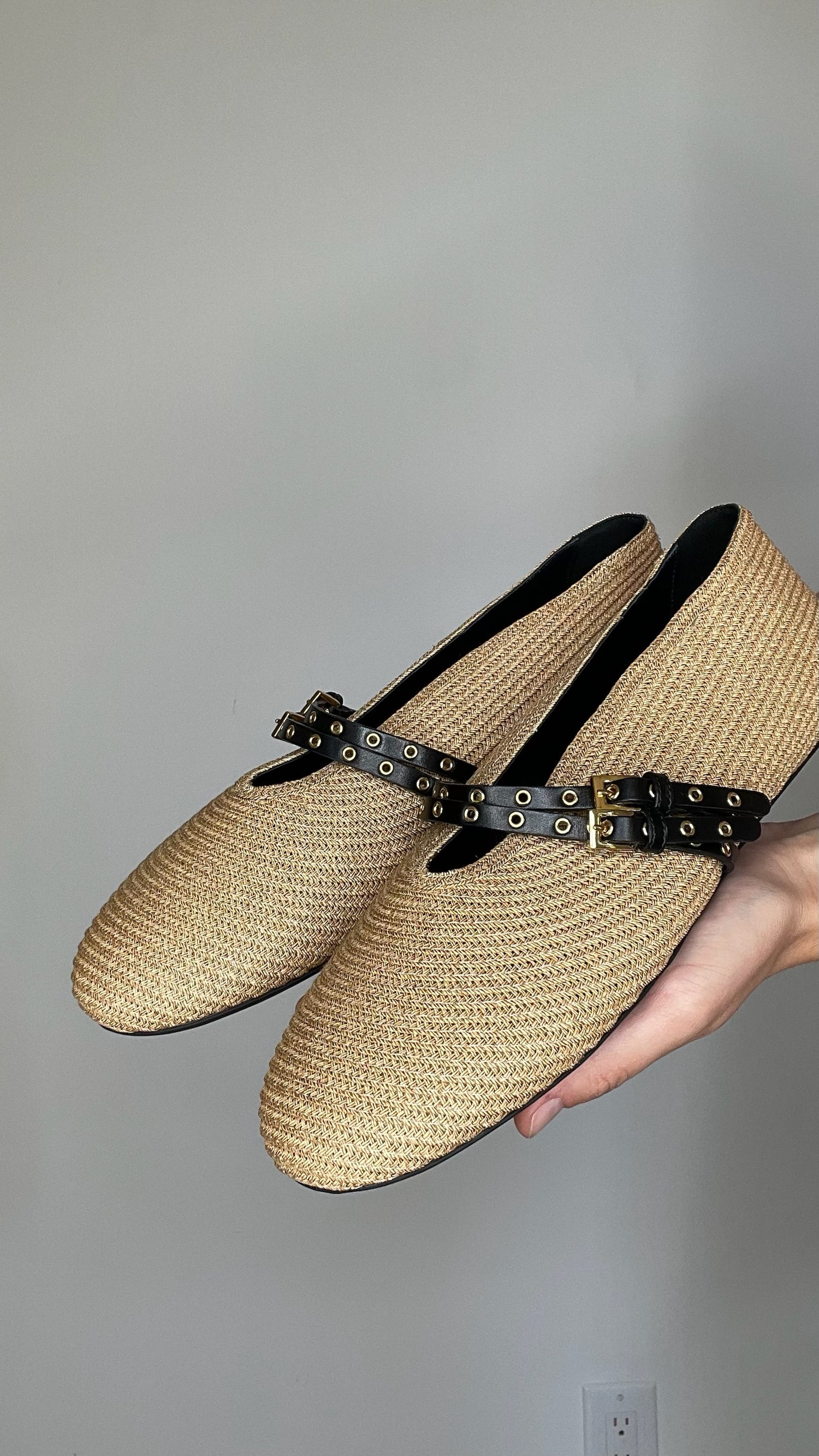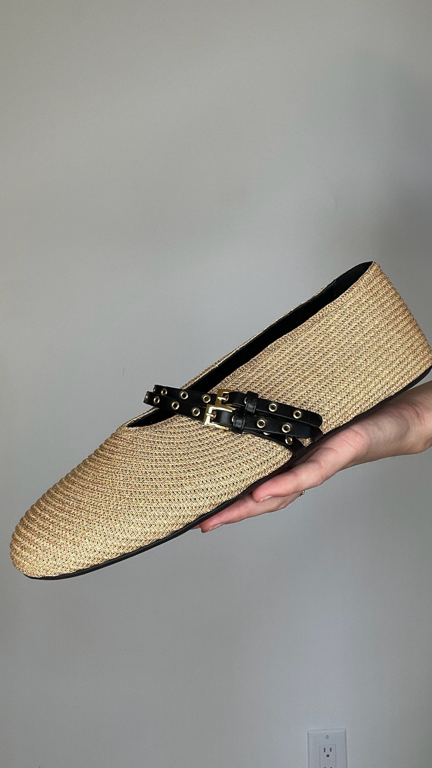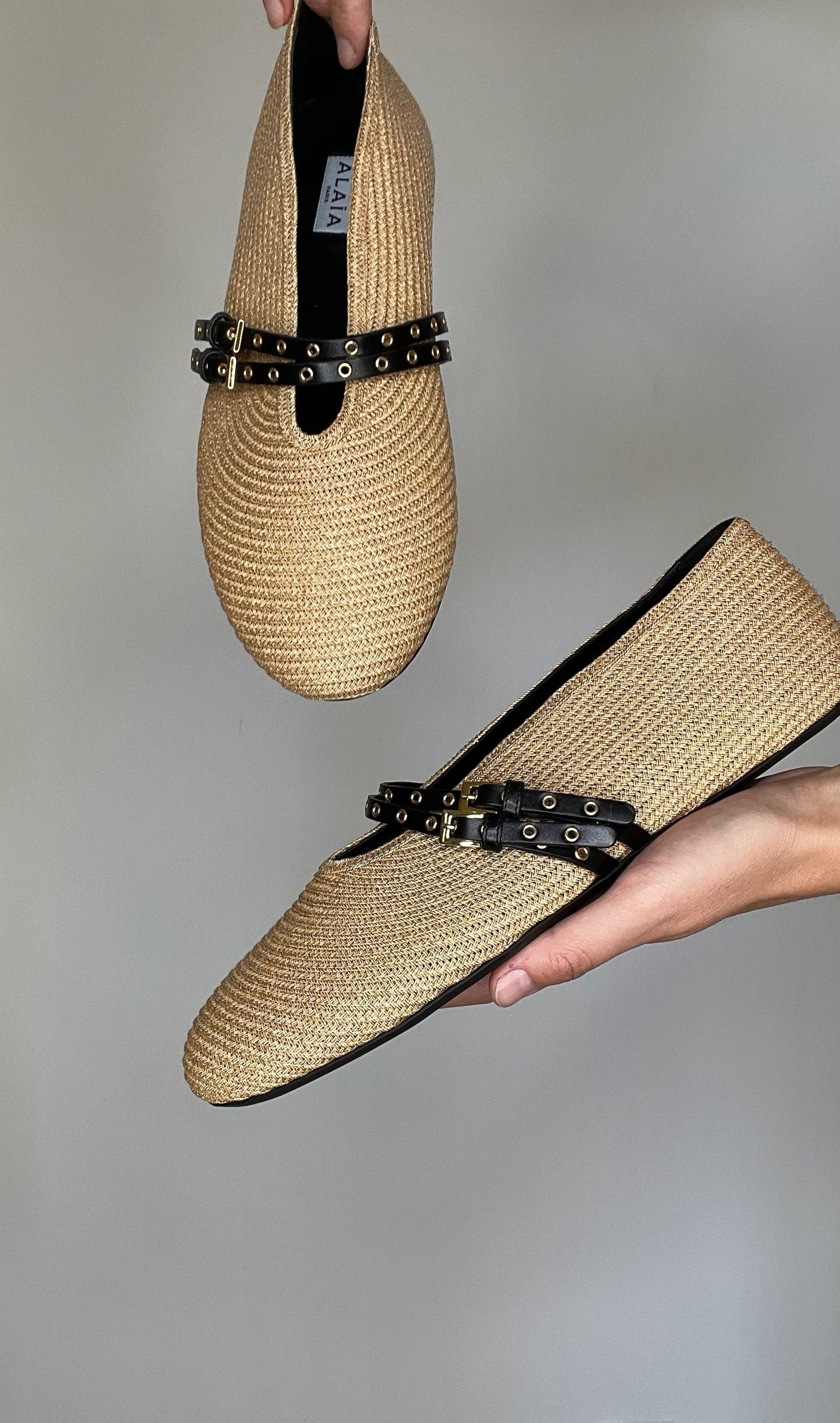Alaia raffia ballerina flats. Double leather straps at top. Round toe. Designer size 41.