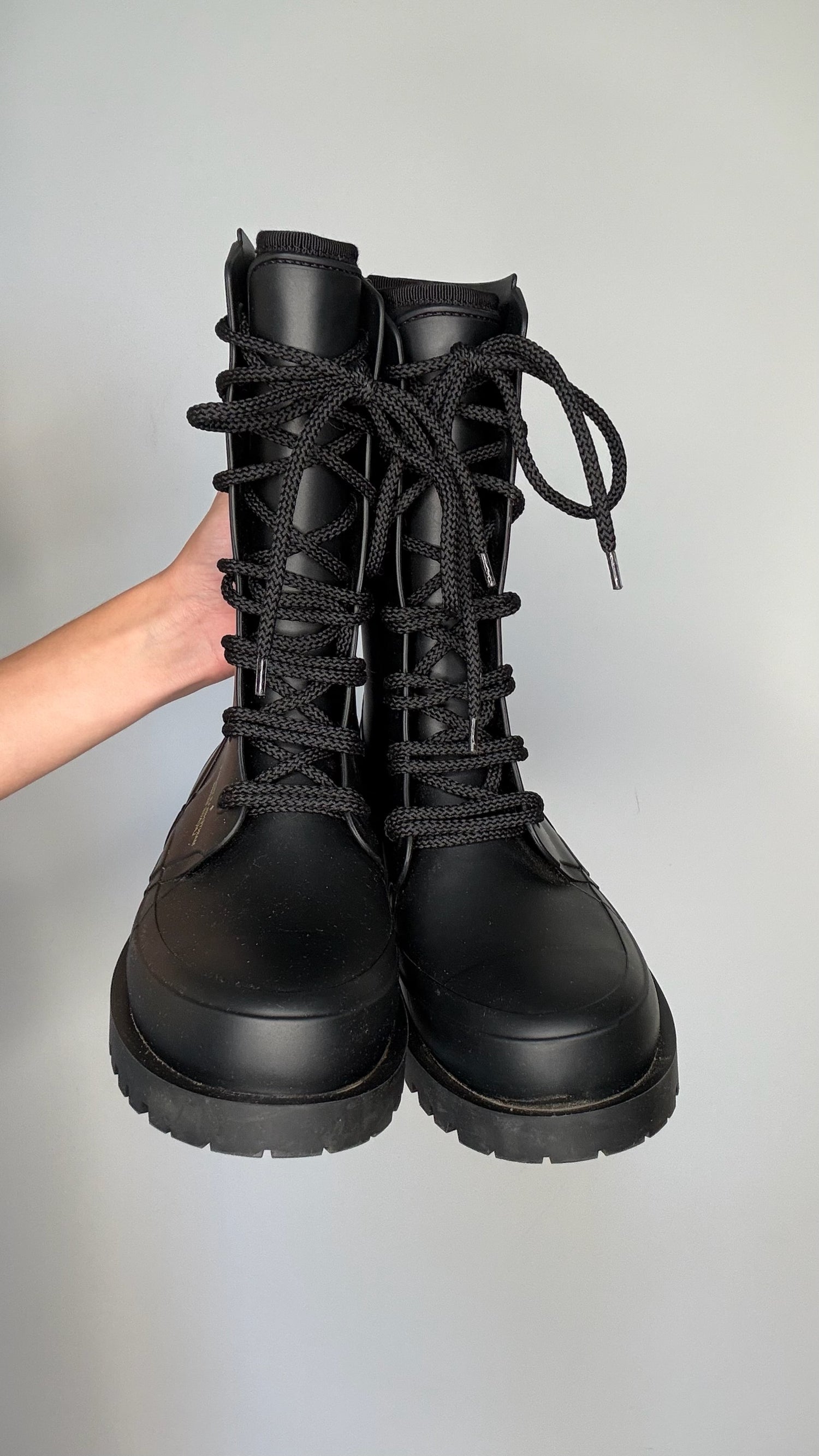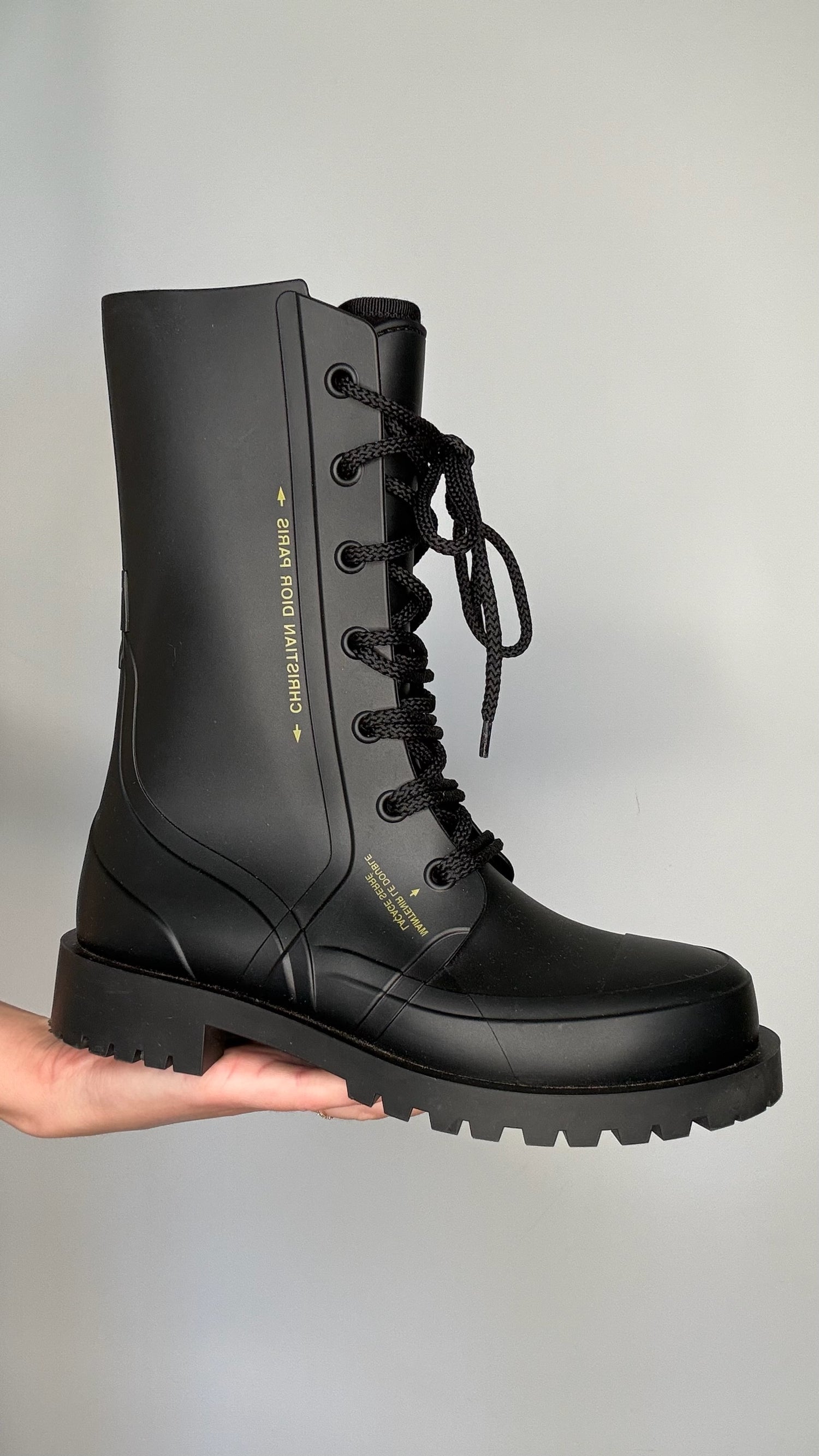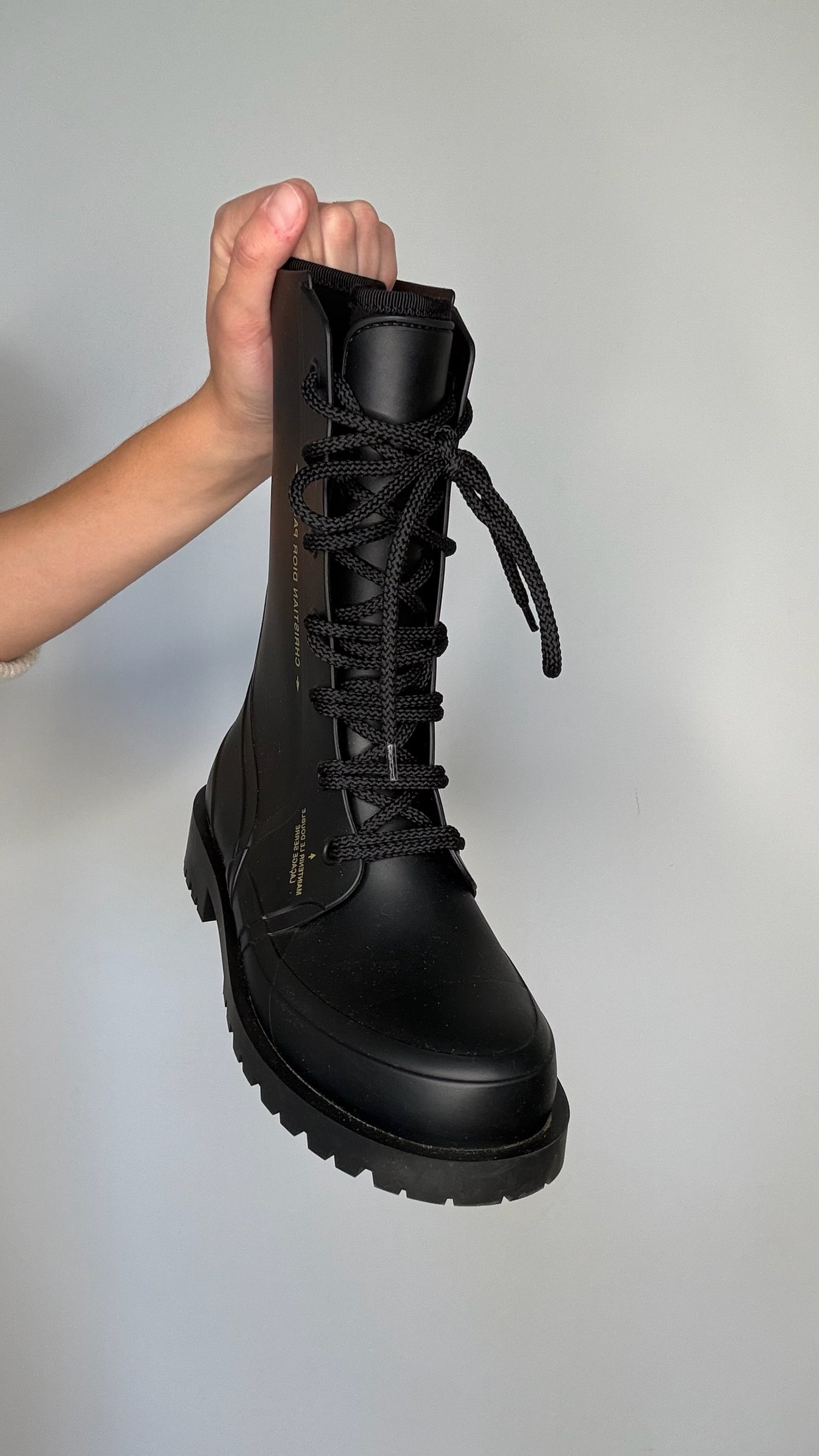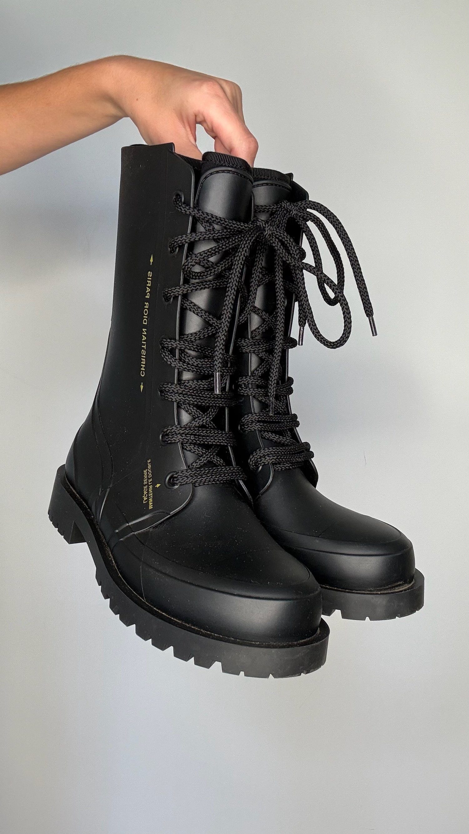 Christian Dior logo rubber boots. Rain/combat boots. Neoprene lining. Laces at front. Designer size 38.