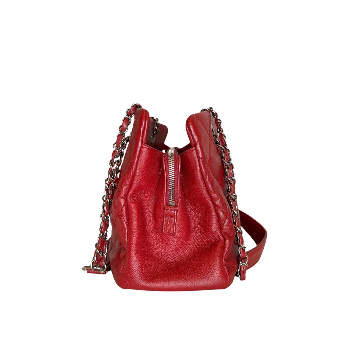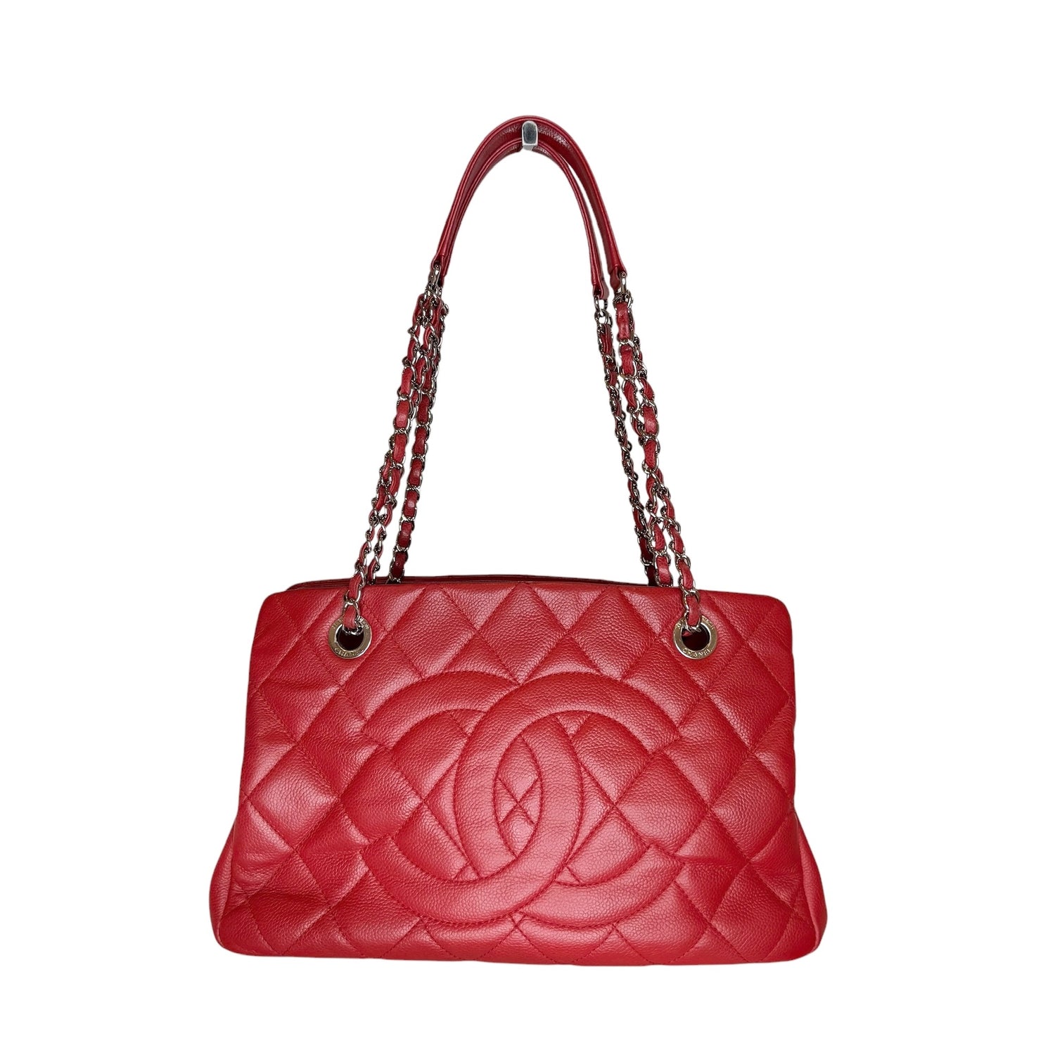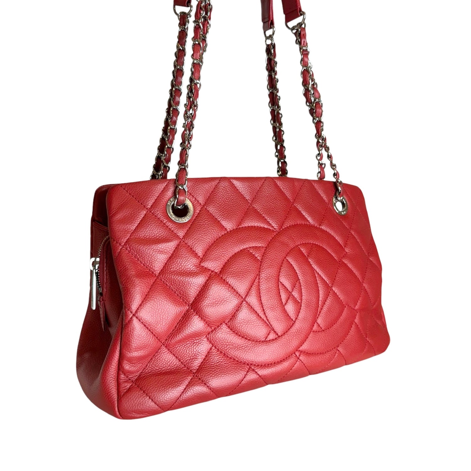 Chanel red caviar tote. CC logo at front. Silver hardware. Three compartments. One zipper pocket at middle. One interior zipper pocket. Cream grosgrain lining. Protective feet at base.
