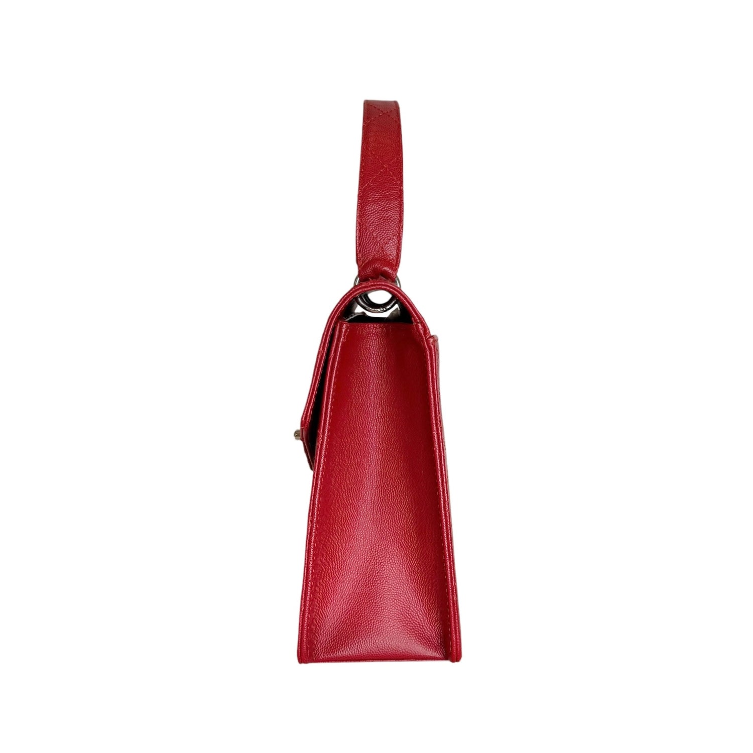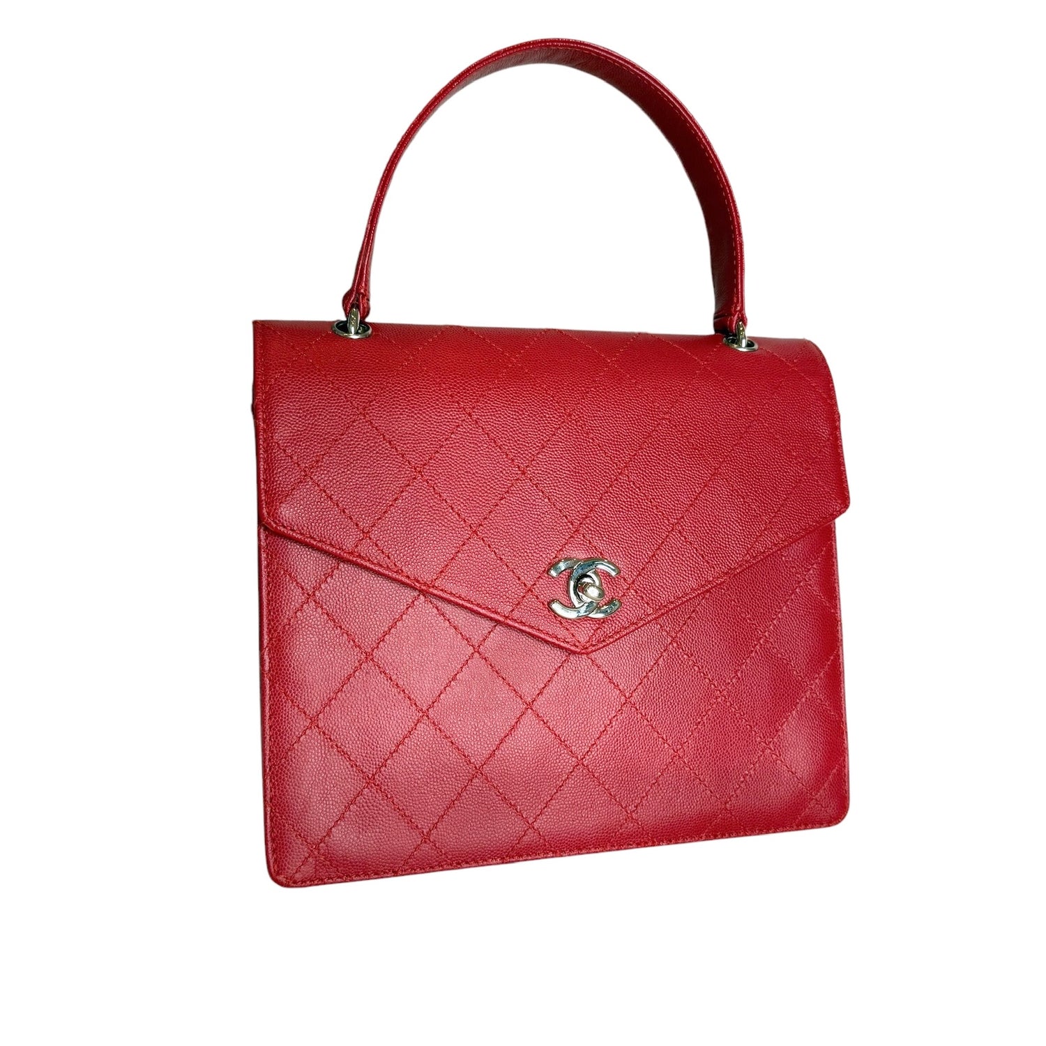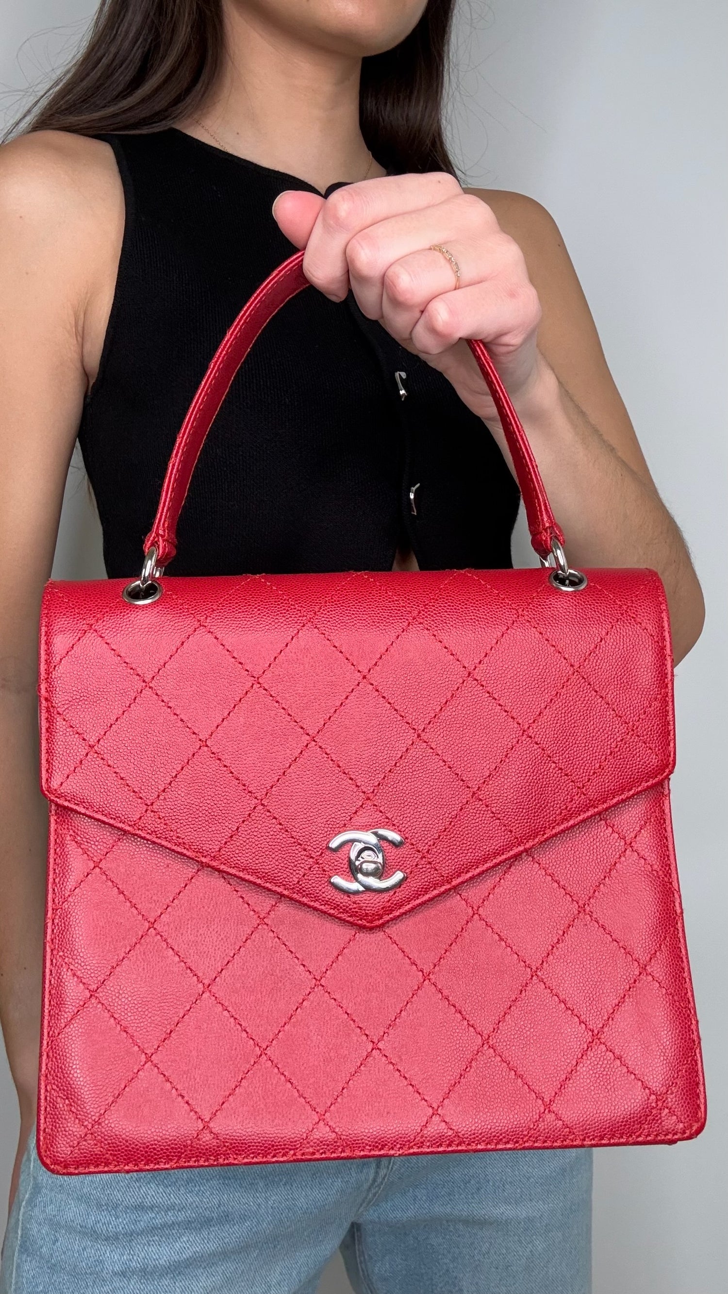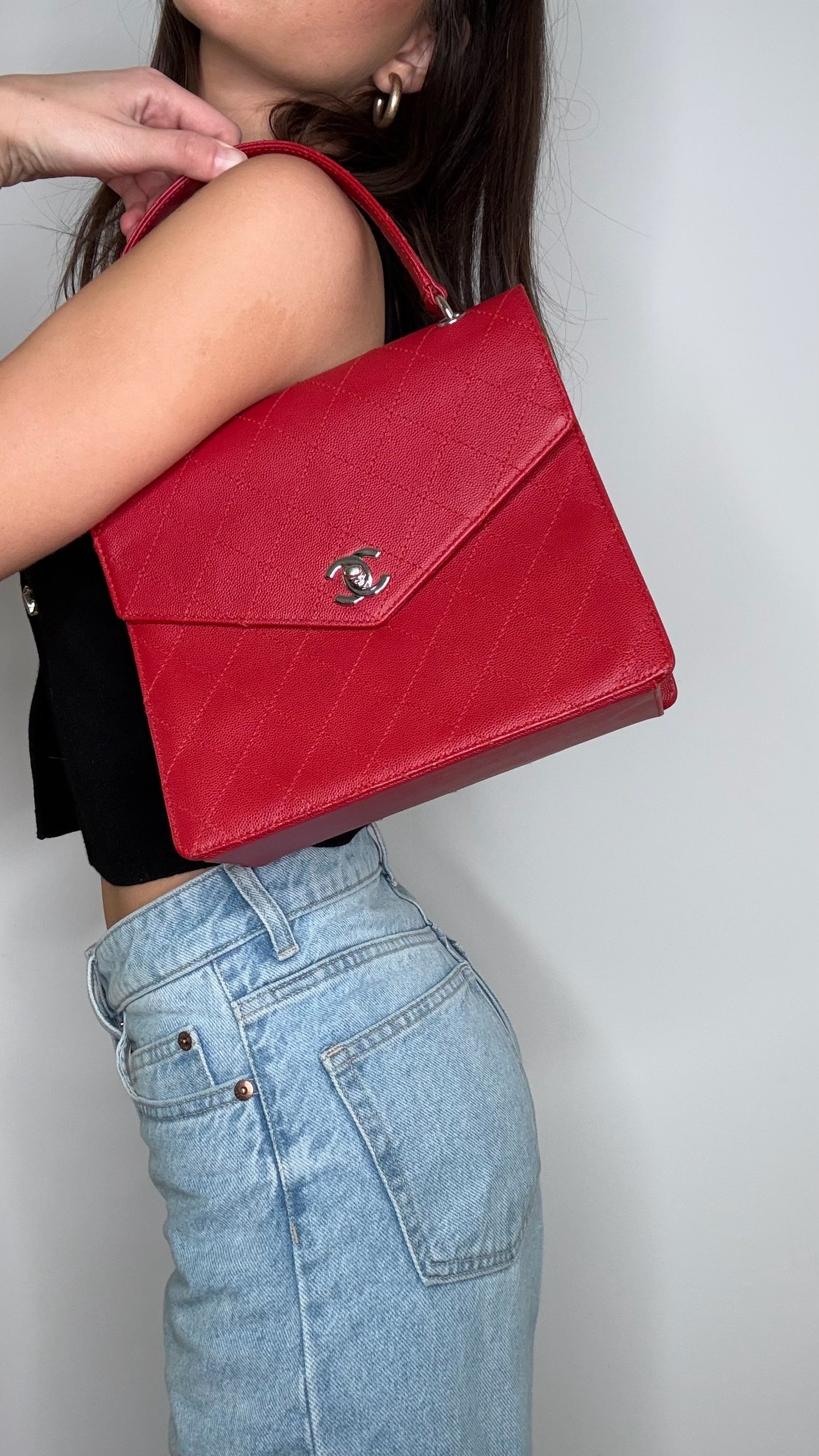 Chanel red caviar leather top handle bag. Silver hardware. One interior zipper pocket.