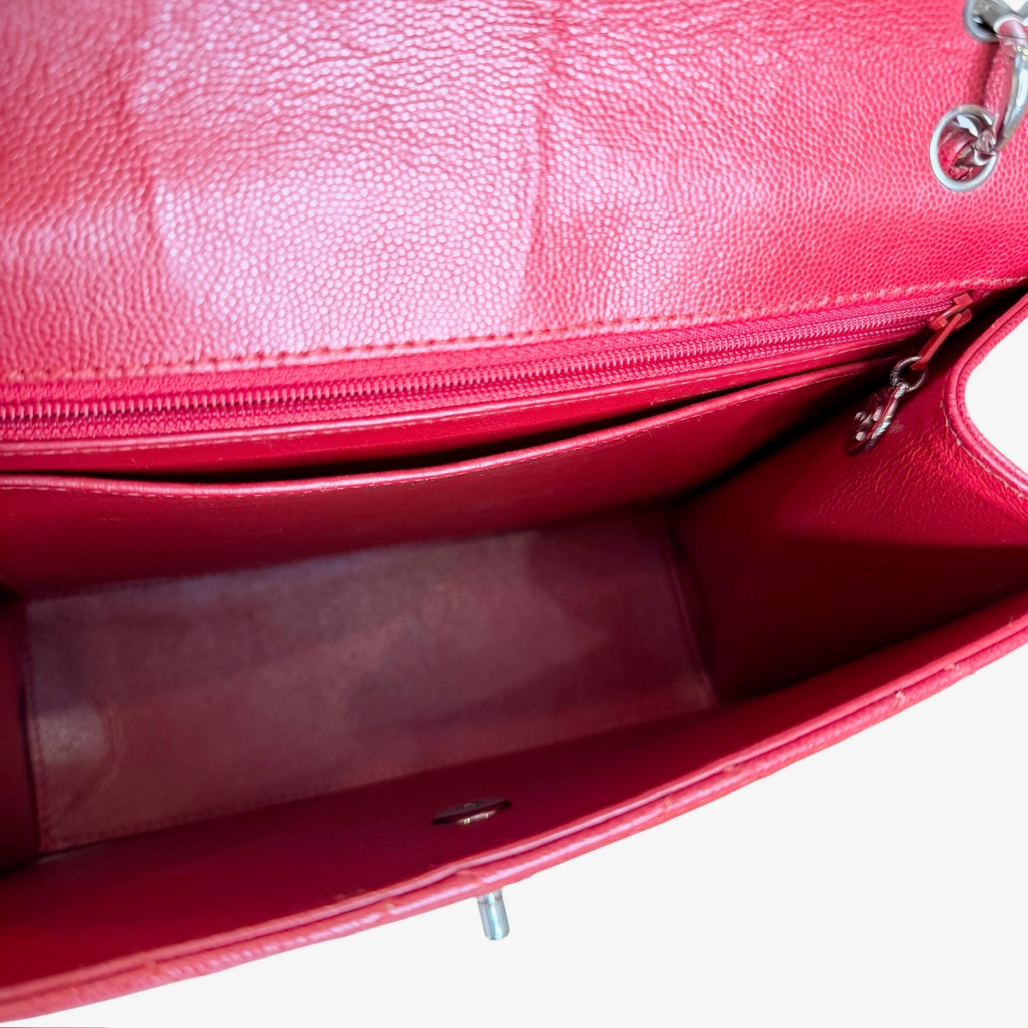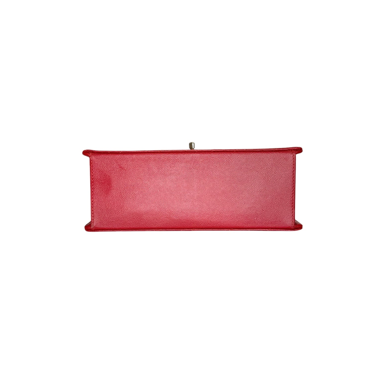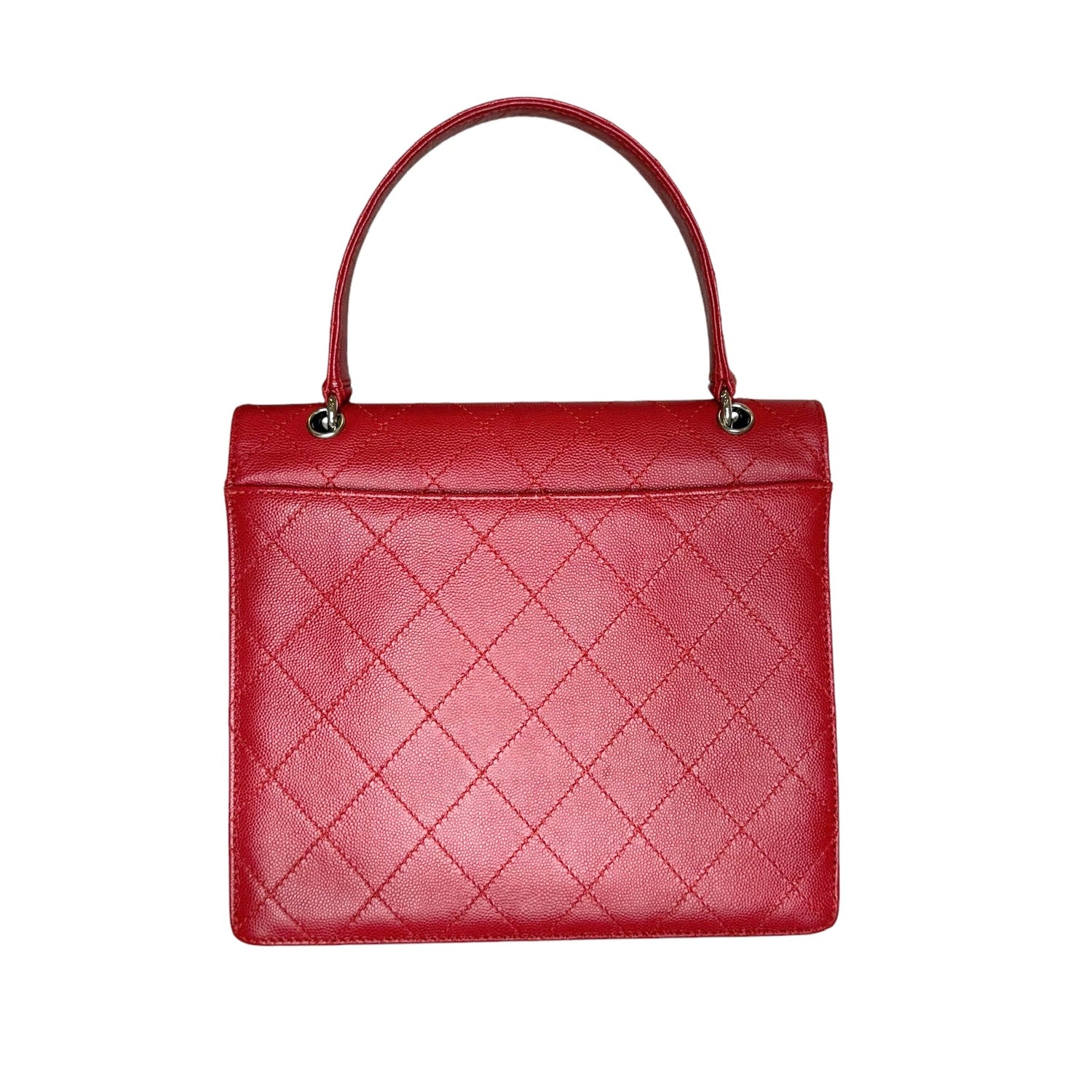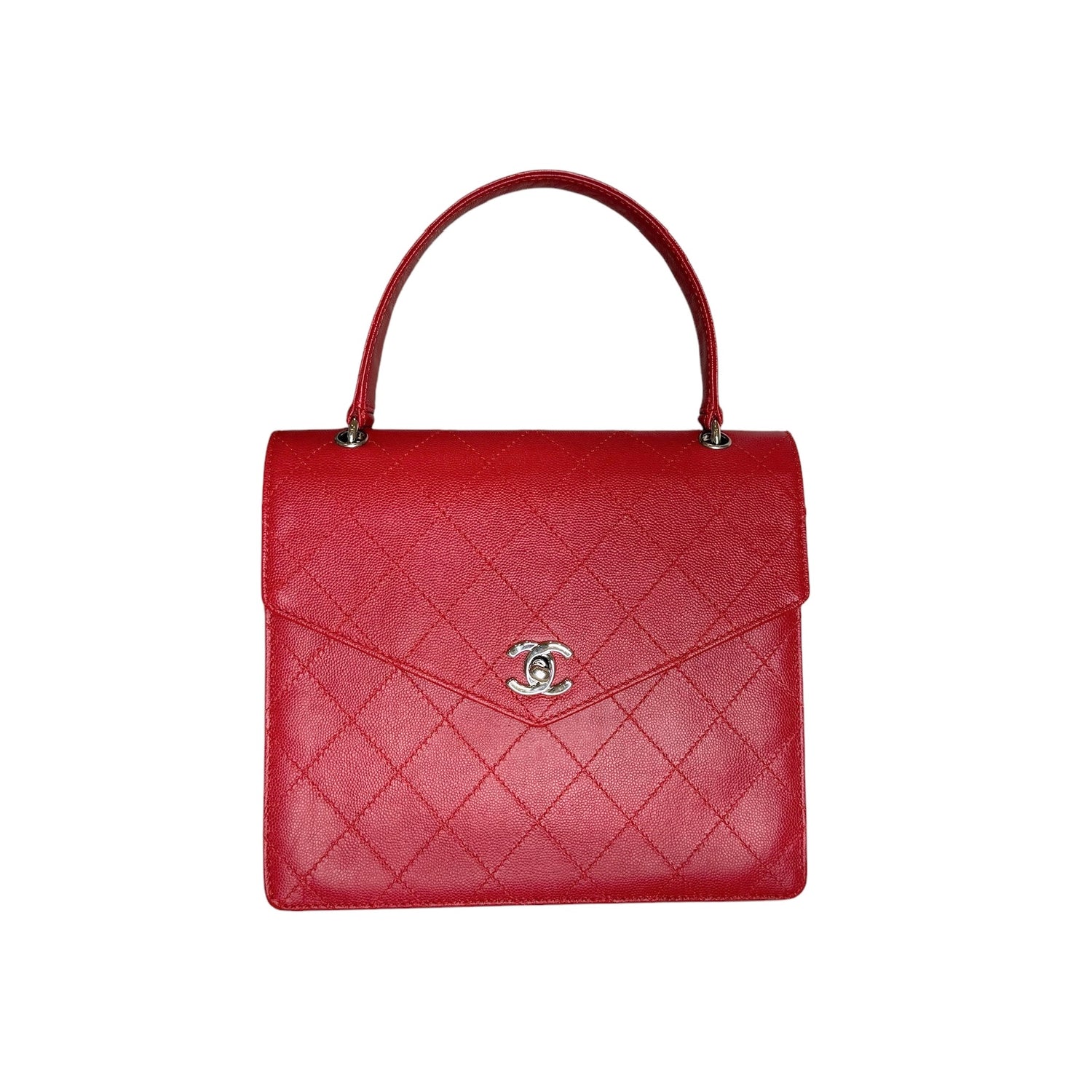 Chanel red caviar leather top handle bag. Silver hardware. One interior zipper pocket.