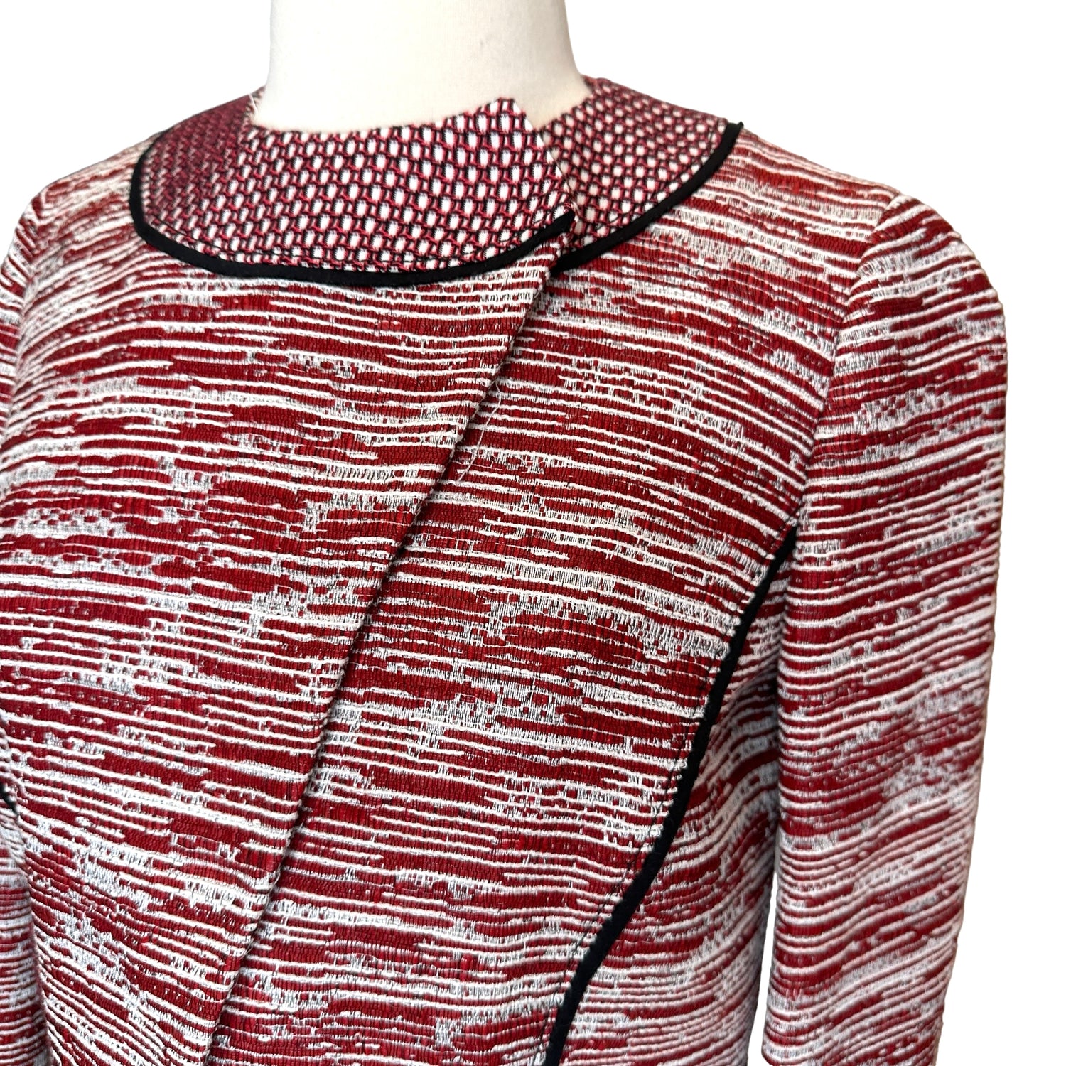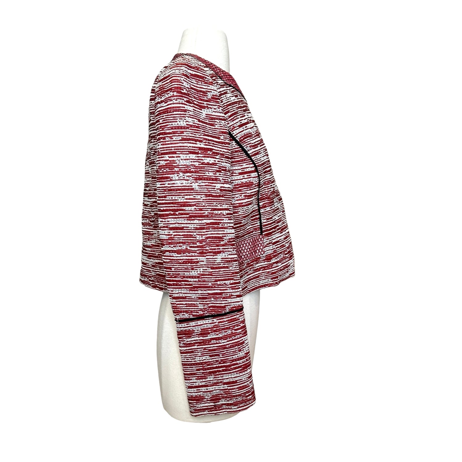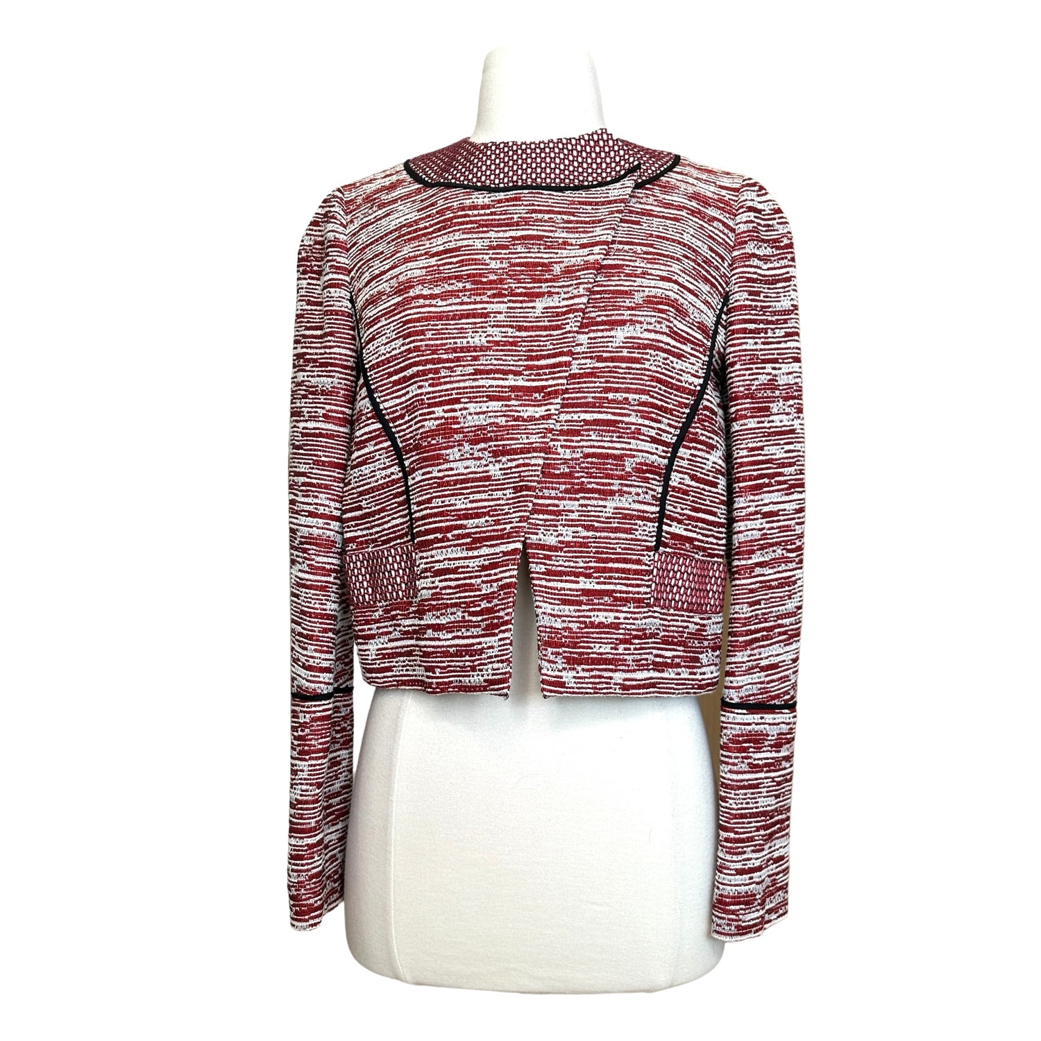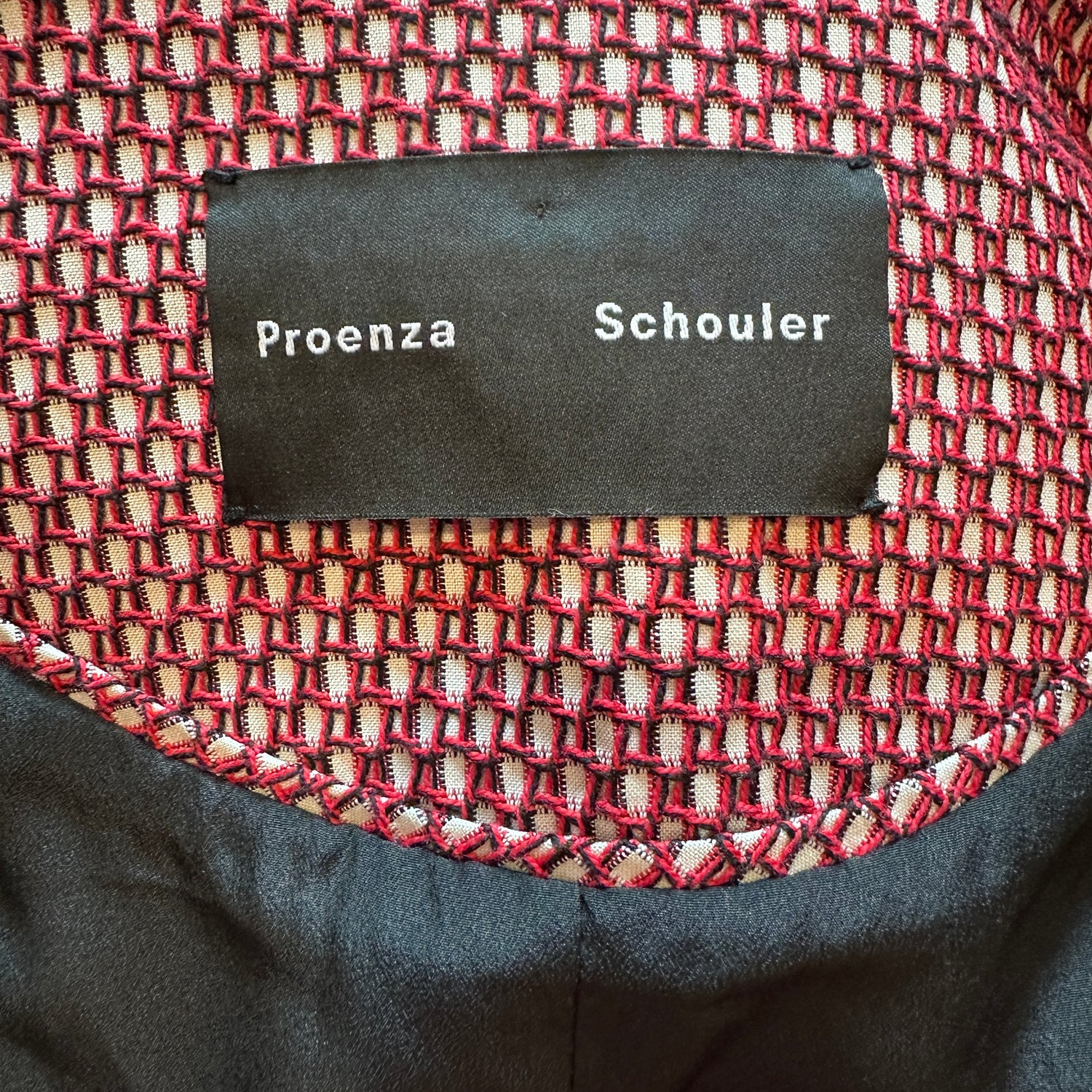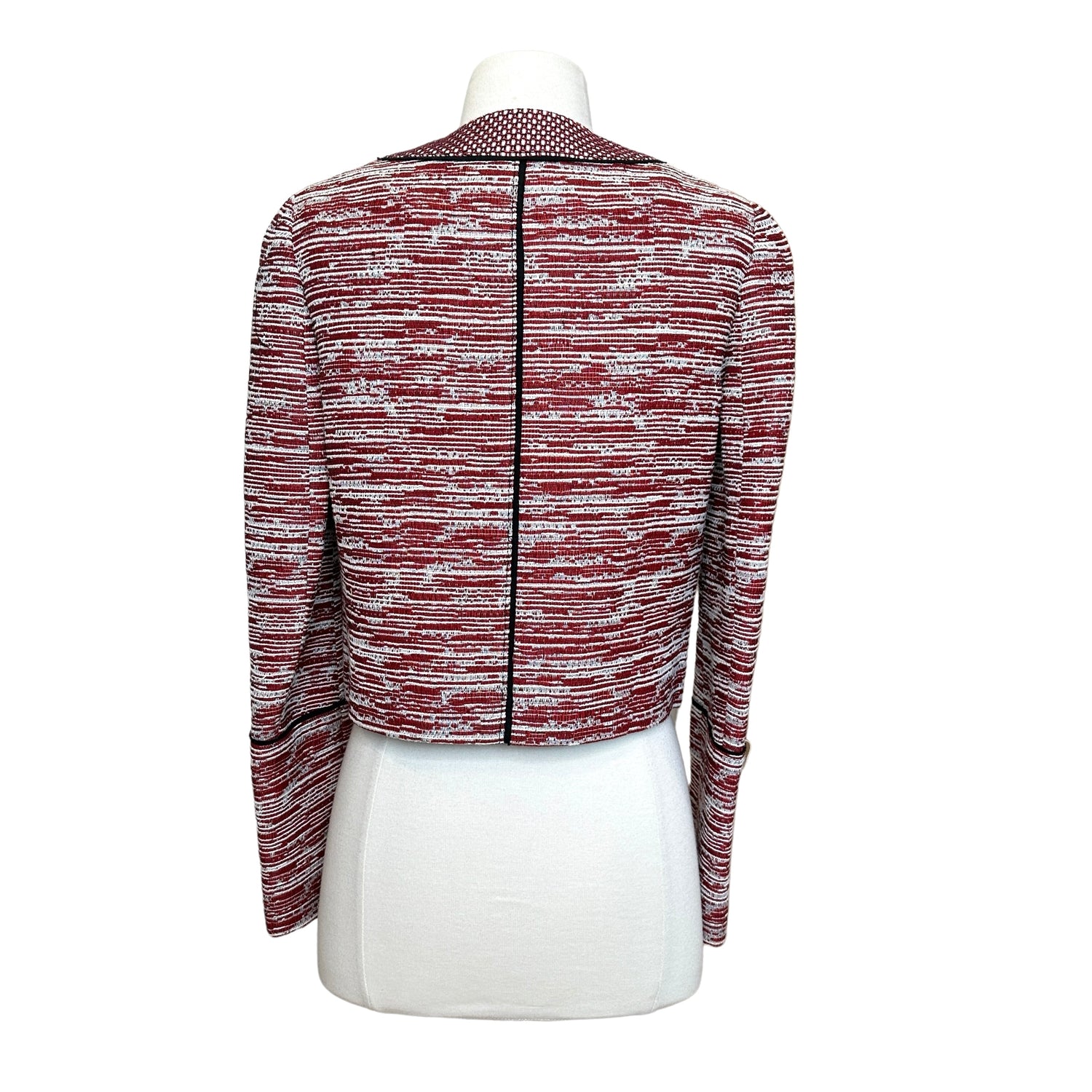 Proenza Schouler red and cream tweed jacket. Collarless. Snap on concealed button closure. Two patch pockets. Designer size 2.