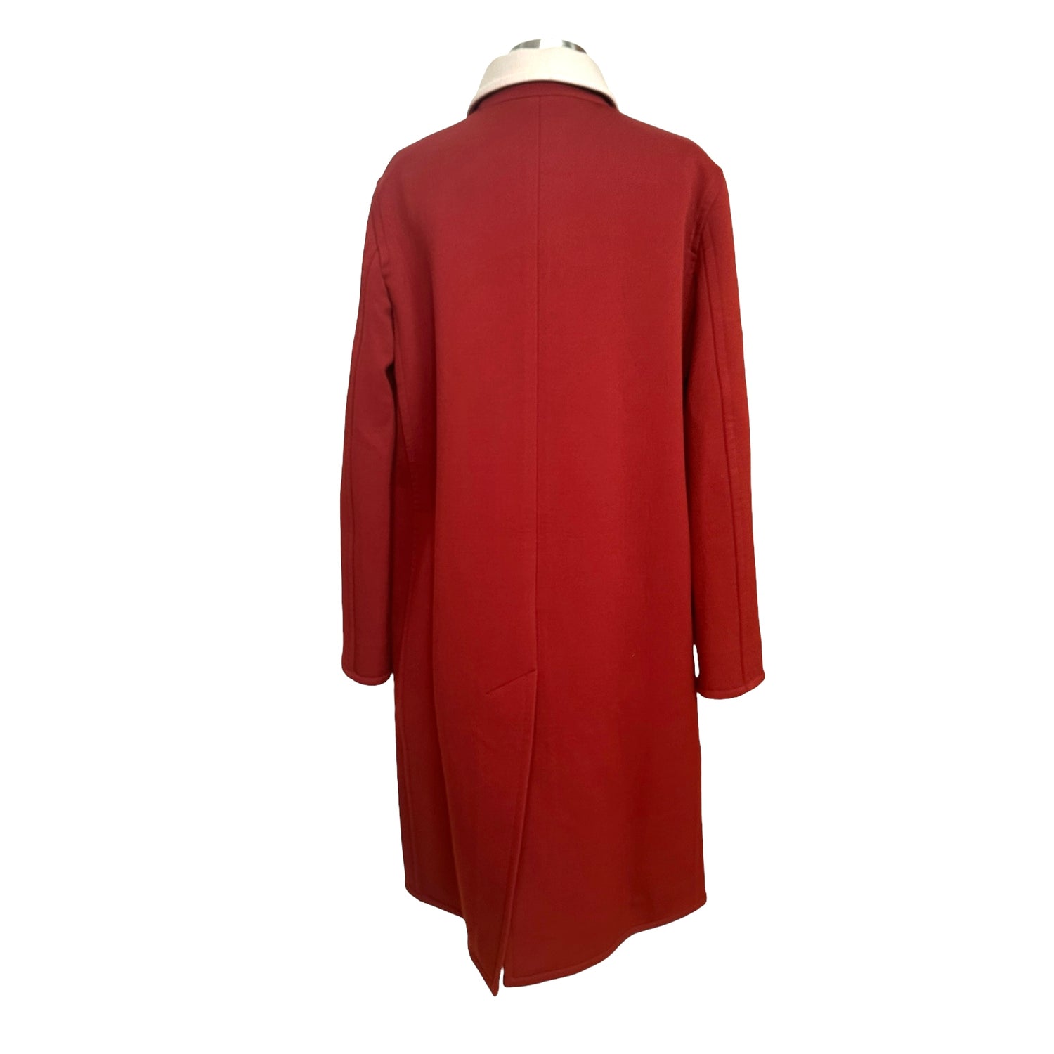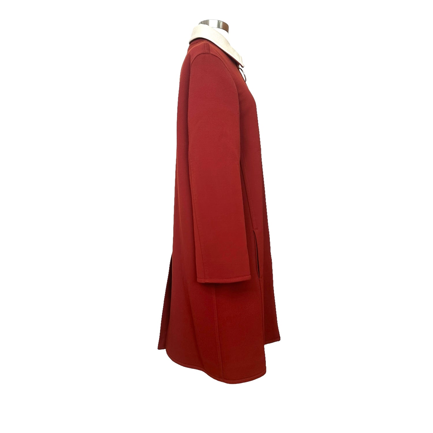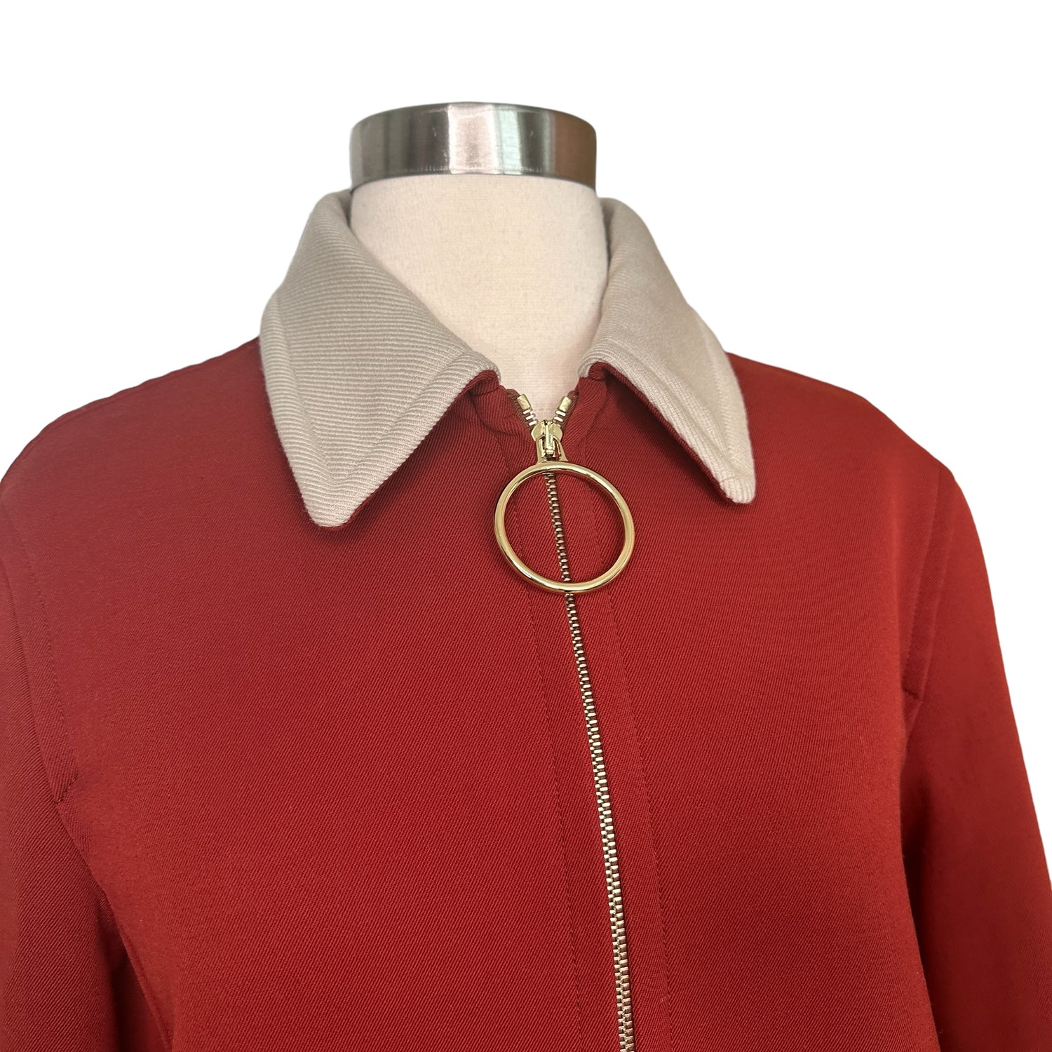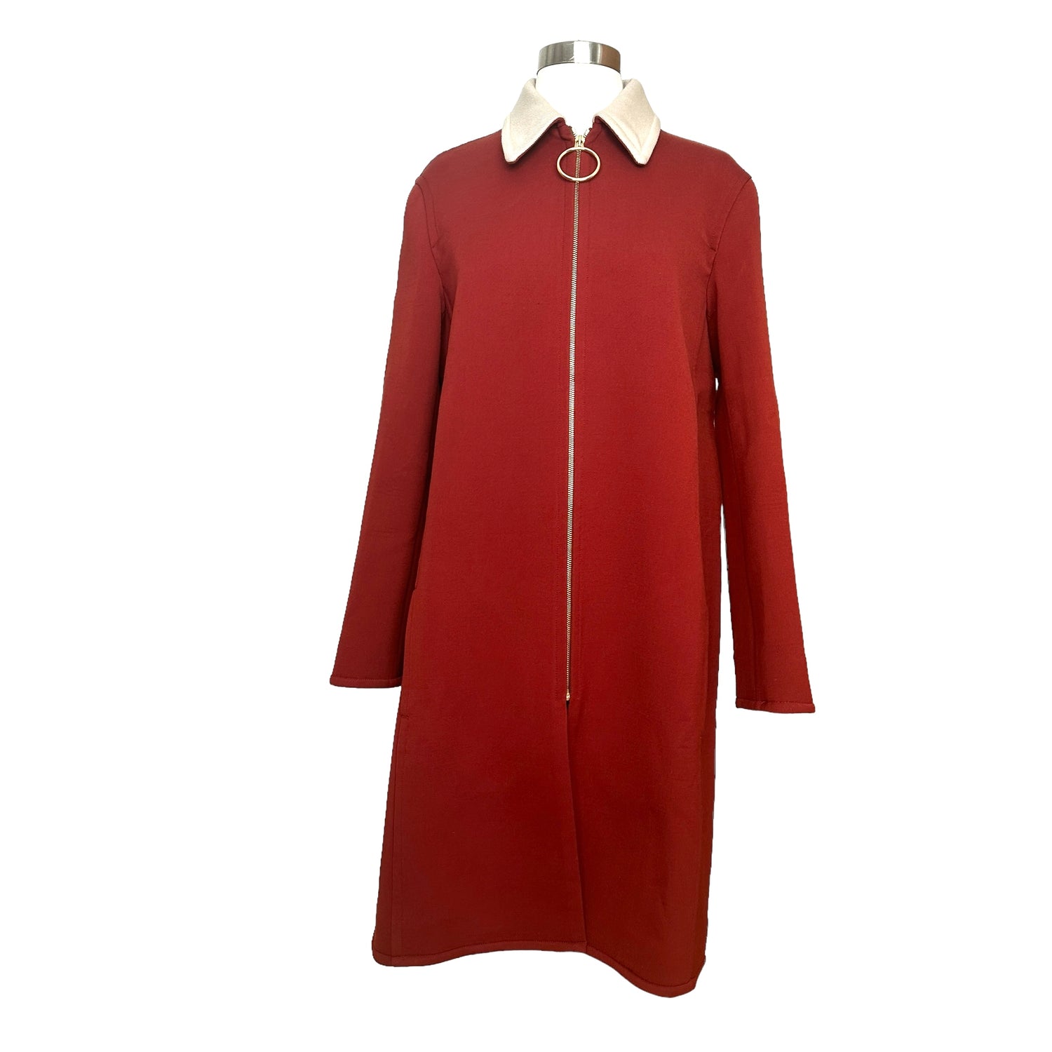 Celine by Phoebe Philo coat. Deep red with cream pointed collar. Slit pockets. Zipper closure at front with large circular detail in gold-tone hardware. Designer size 40.