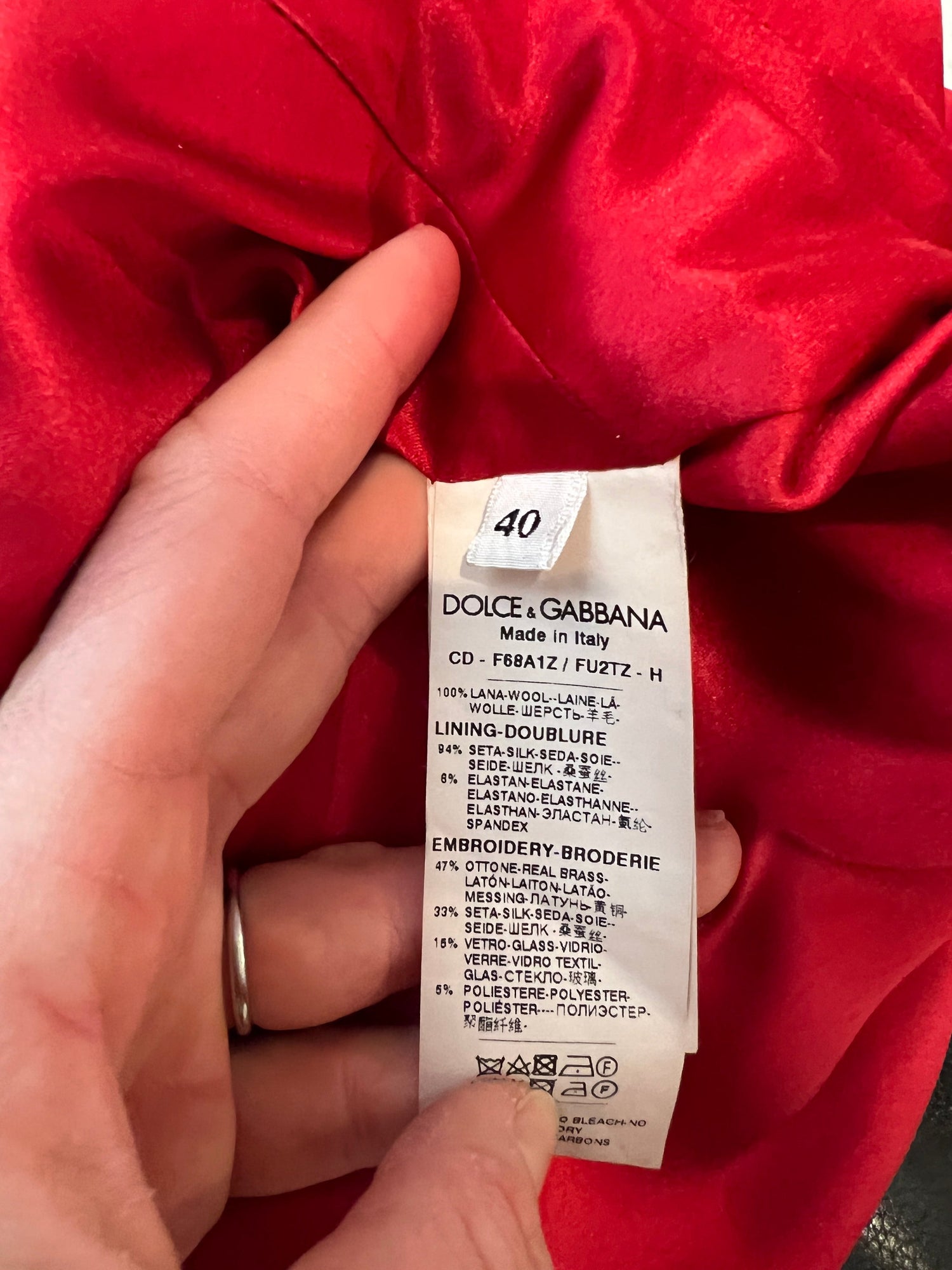 Fabric: 100% Wool; Lining 94% Silk, 6% Elastane; Embellishment 47% Brass, 33% Silk, 15% Glass, 5% Polyester