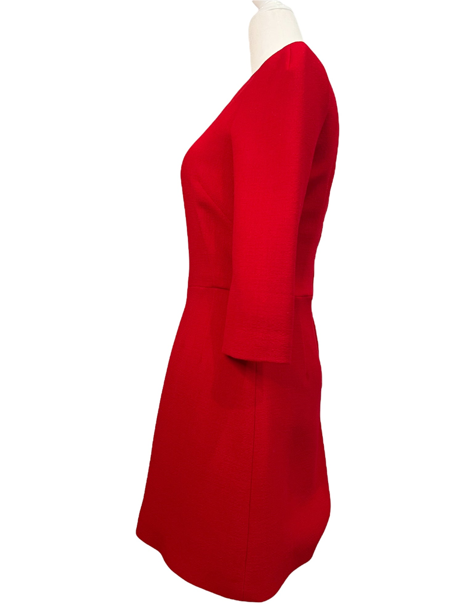 Details: Wool A-Line Dress, Red, Beaded, Embroidered & Crystal Accents, Three-Quarter Sleeve with Crew Neck, Concealed Zip Closure at Back