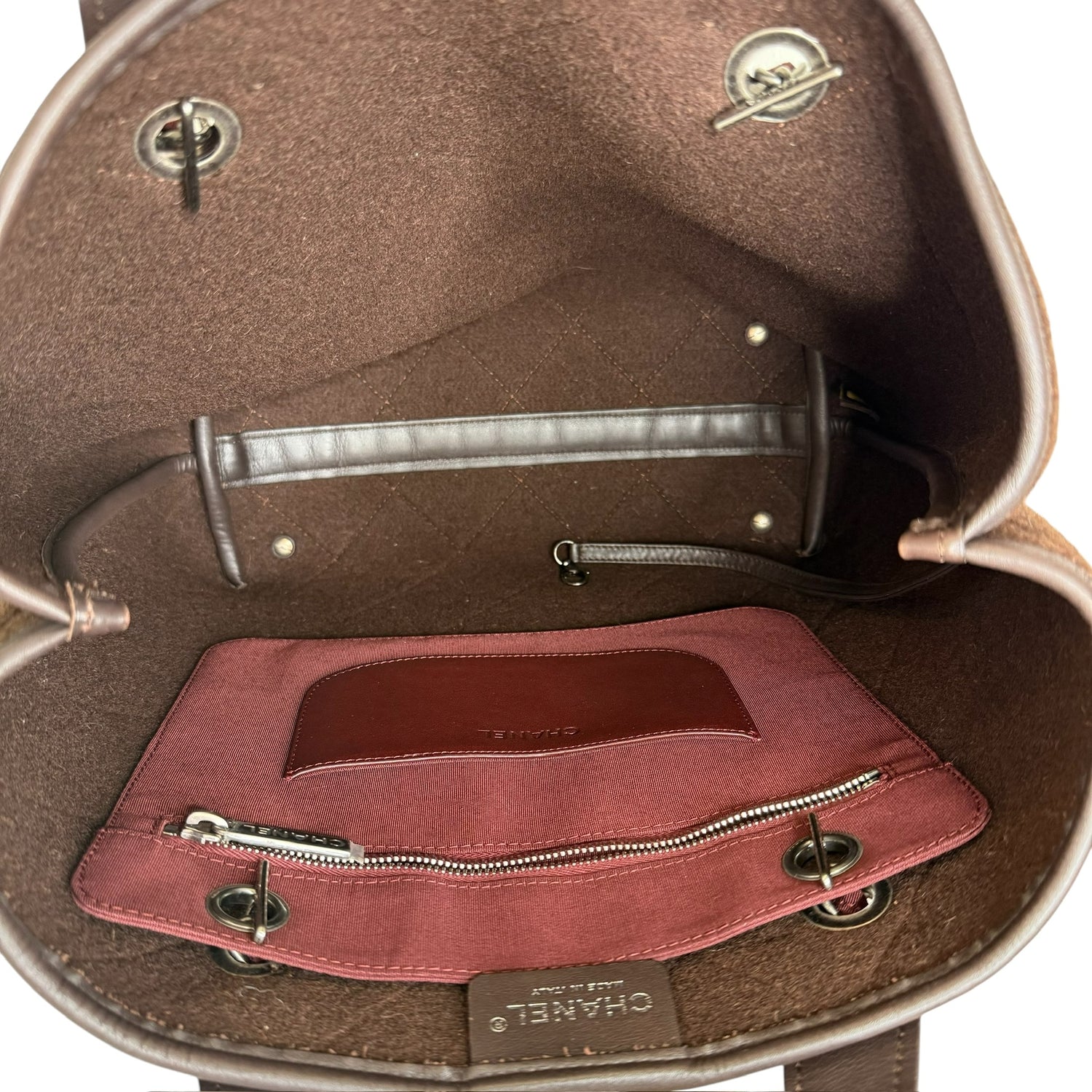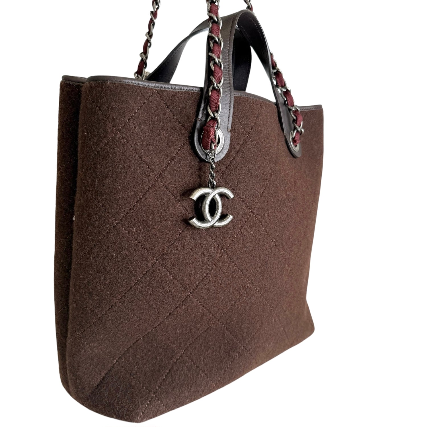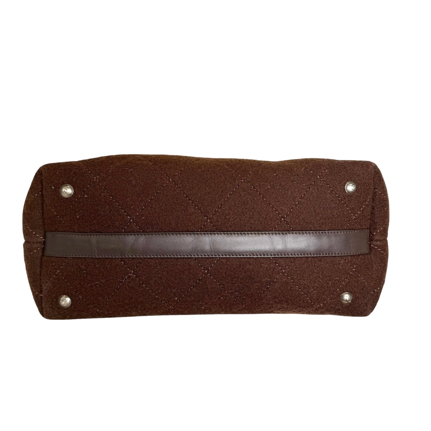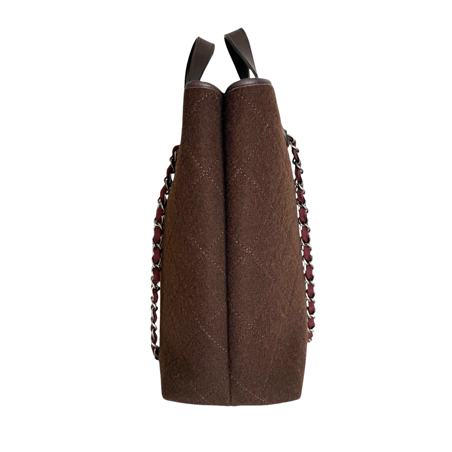 Chanel chocolate brown felt tote. Brown leather handles and trims. Burgundy grosgrain straps. Gunmetal hardware. Unlined. Burgundy grosgrain zipper pochette at interior. Handles and shoulder straps make this bag very functional.