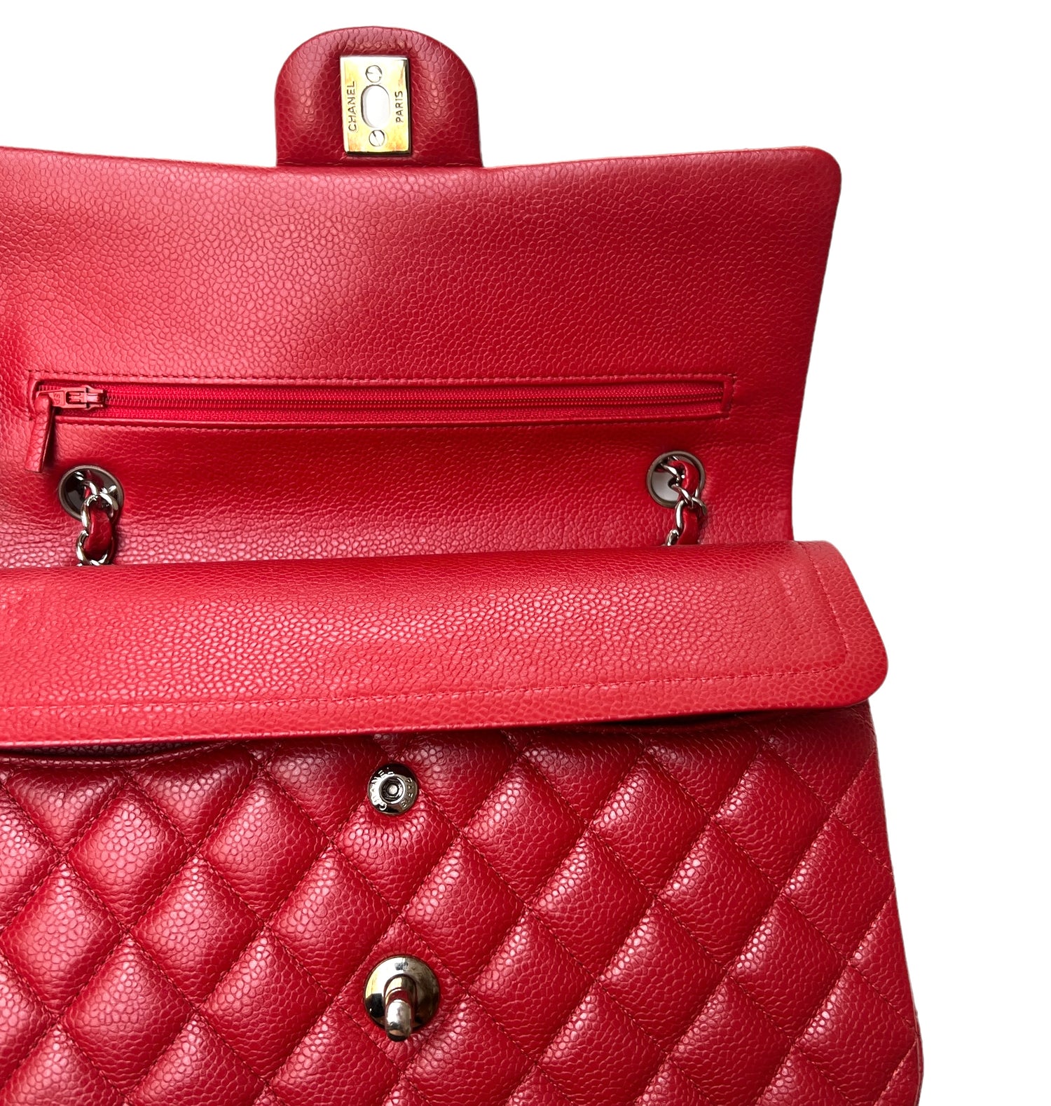 Chanel classic double flap bag By Karl Lagerfeld. Silver-tone hardware. Caviar leather. Chain-link shoulder straps. Dual exterior pockets. Leather lining with three interior pockets. CC turn-lock closure at front.