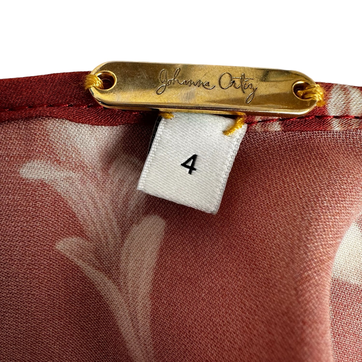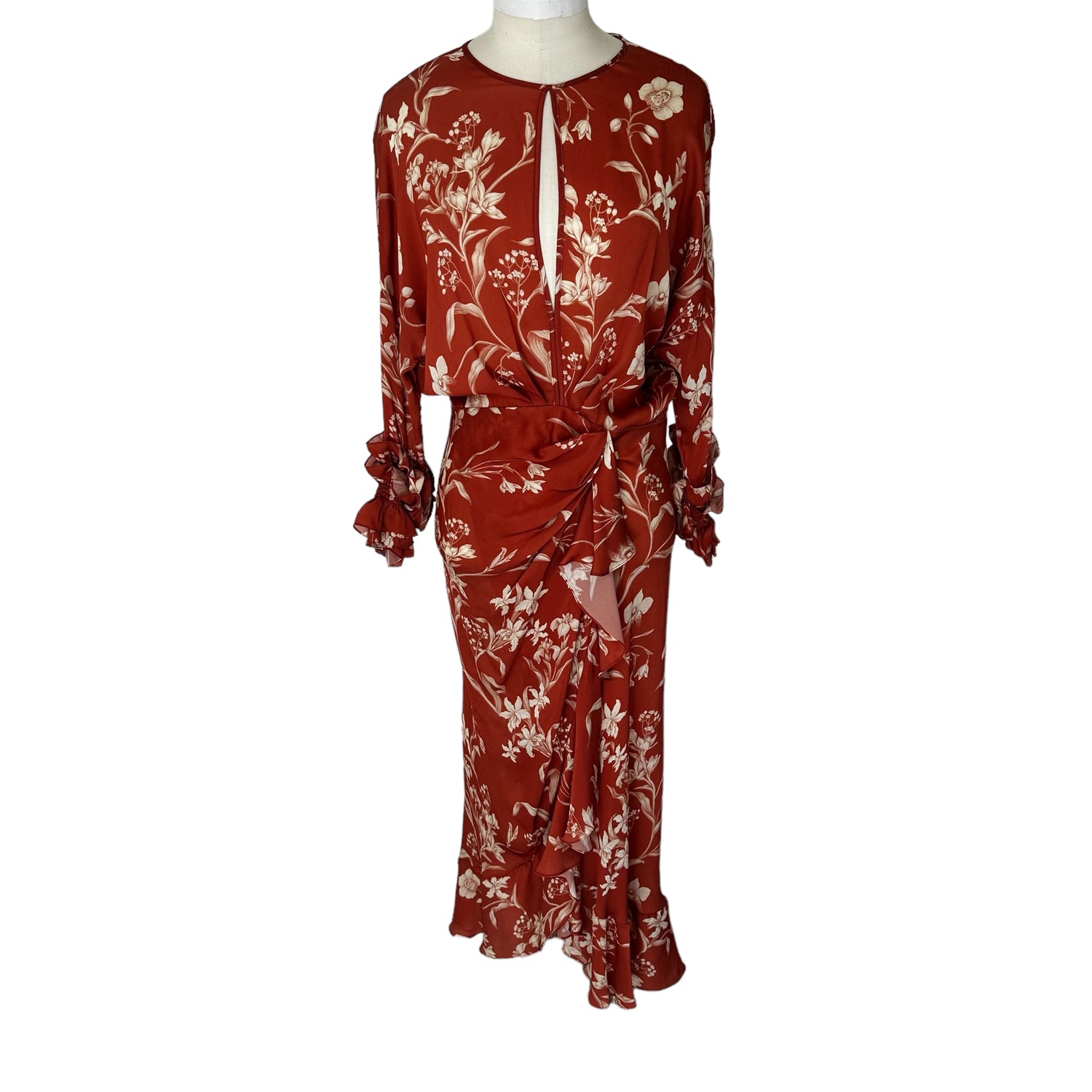 Johanna Ortiz red floral dress. Round neck with cutout detail at front. Long sleeves with ruffle details. Rushed skirt. Designer size 4.