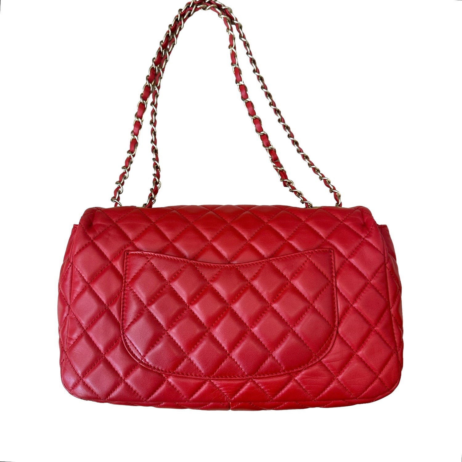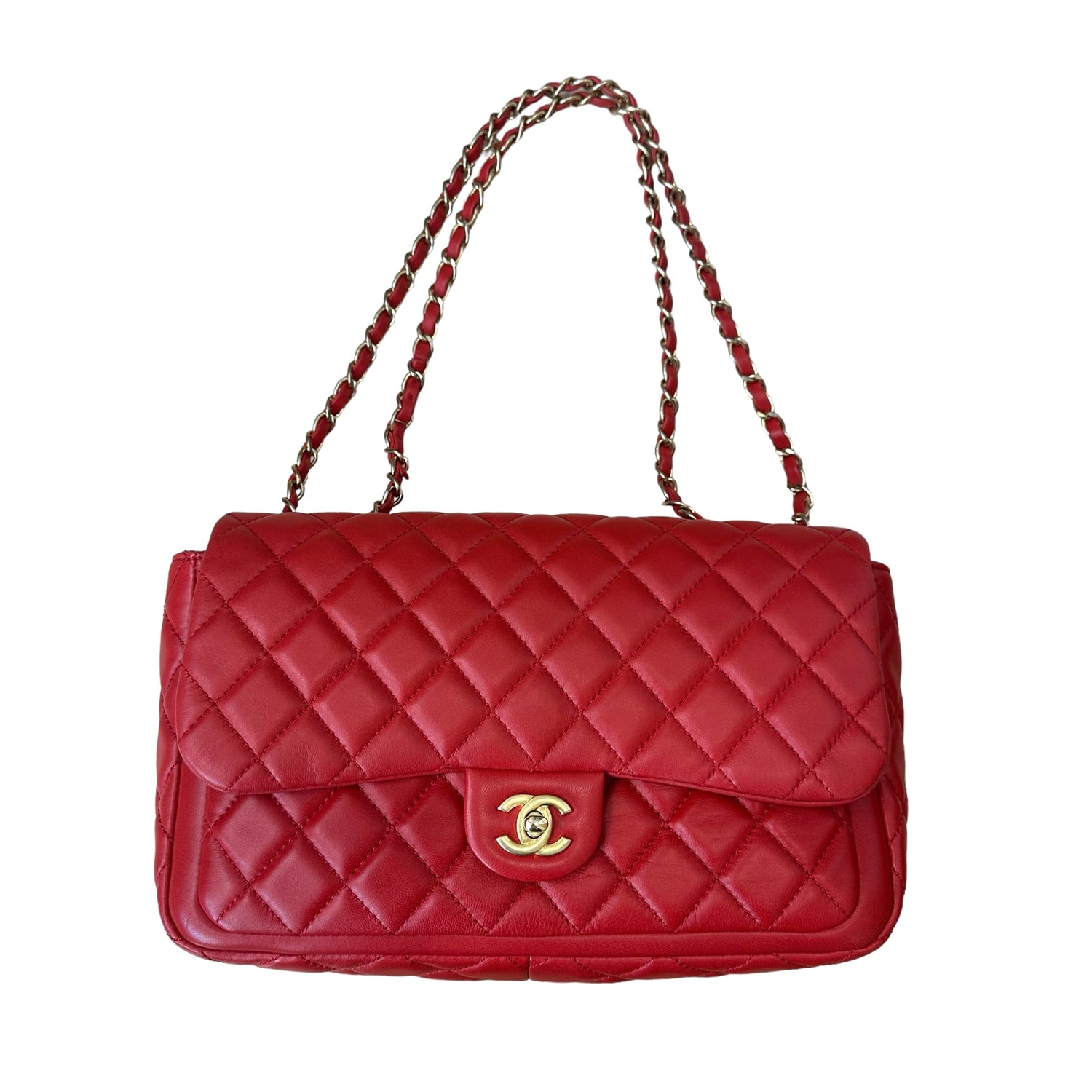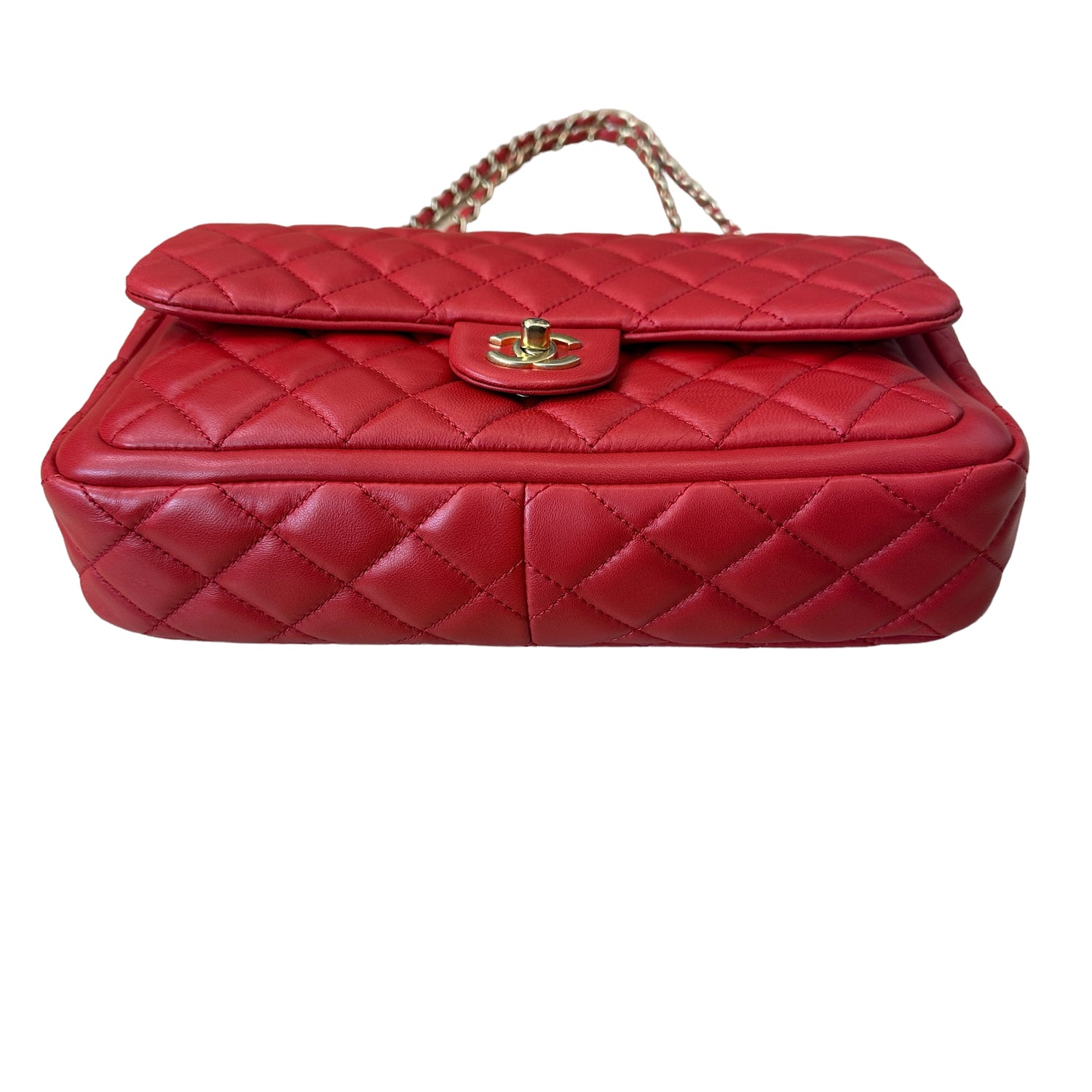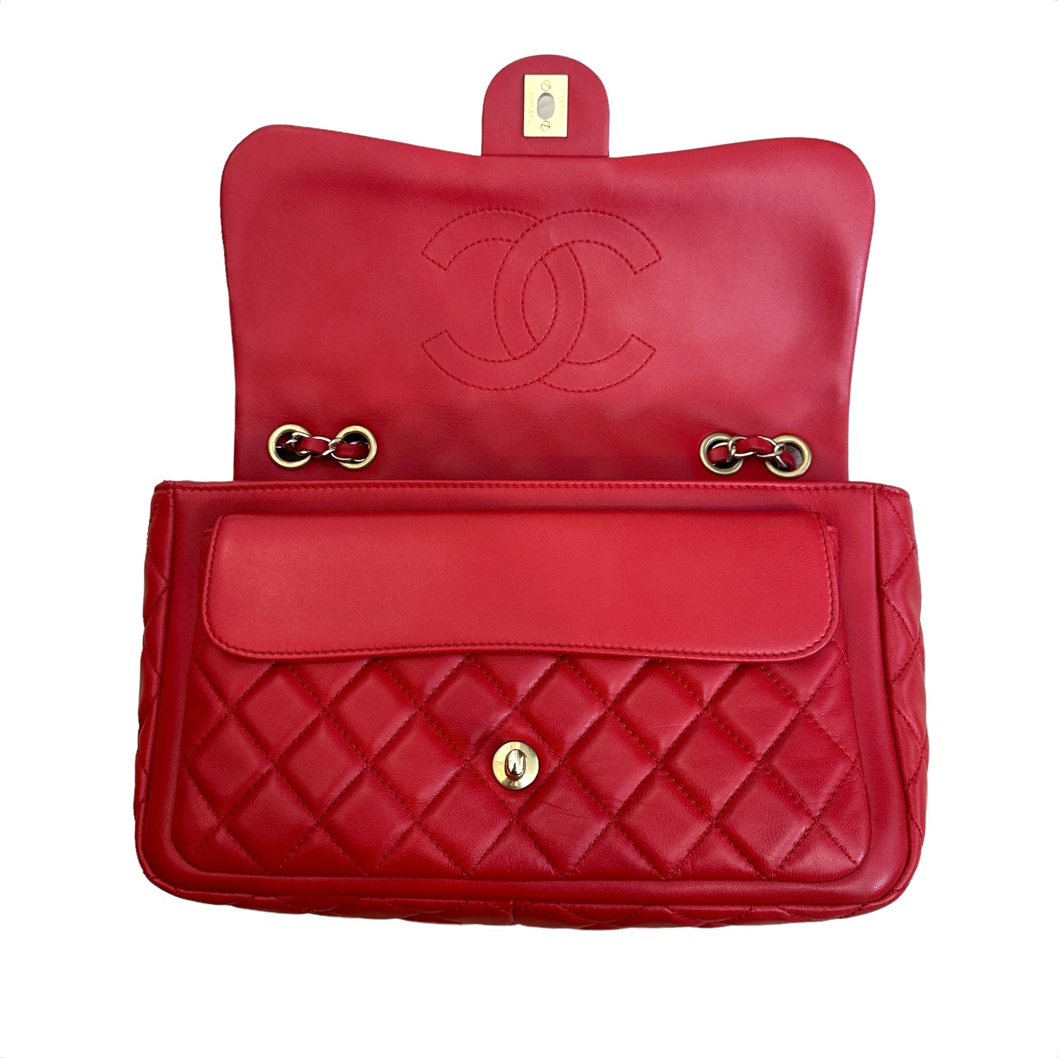 Chanel red lambskin flap. Cruise 2014 collection. Gold-tone hardware. Single flap with underneath flap and extra large pocket.