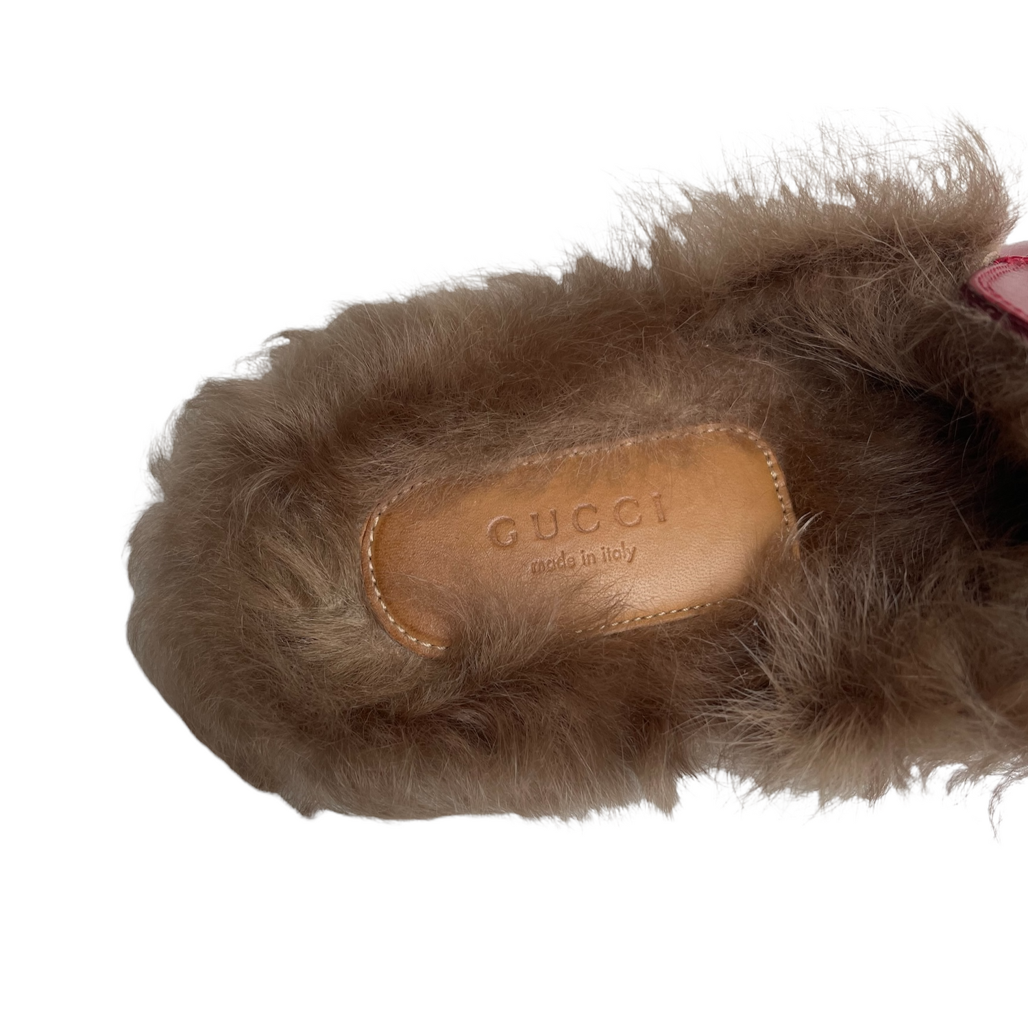 Gucci red leather loafer slides with gold-tone hardware. Fur lining. Must have!