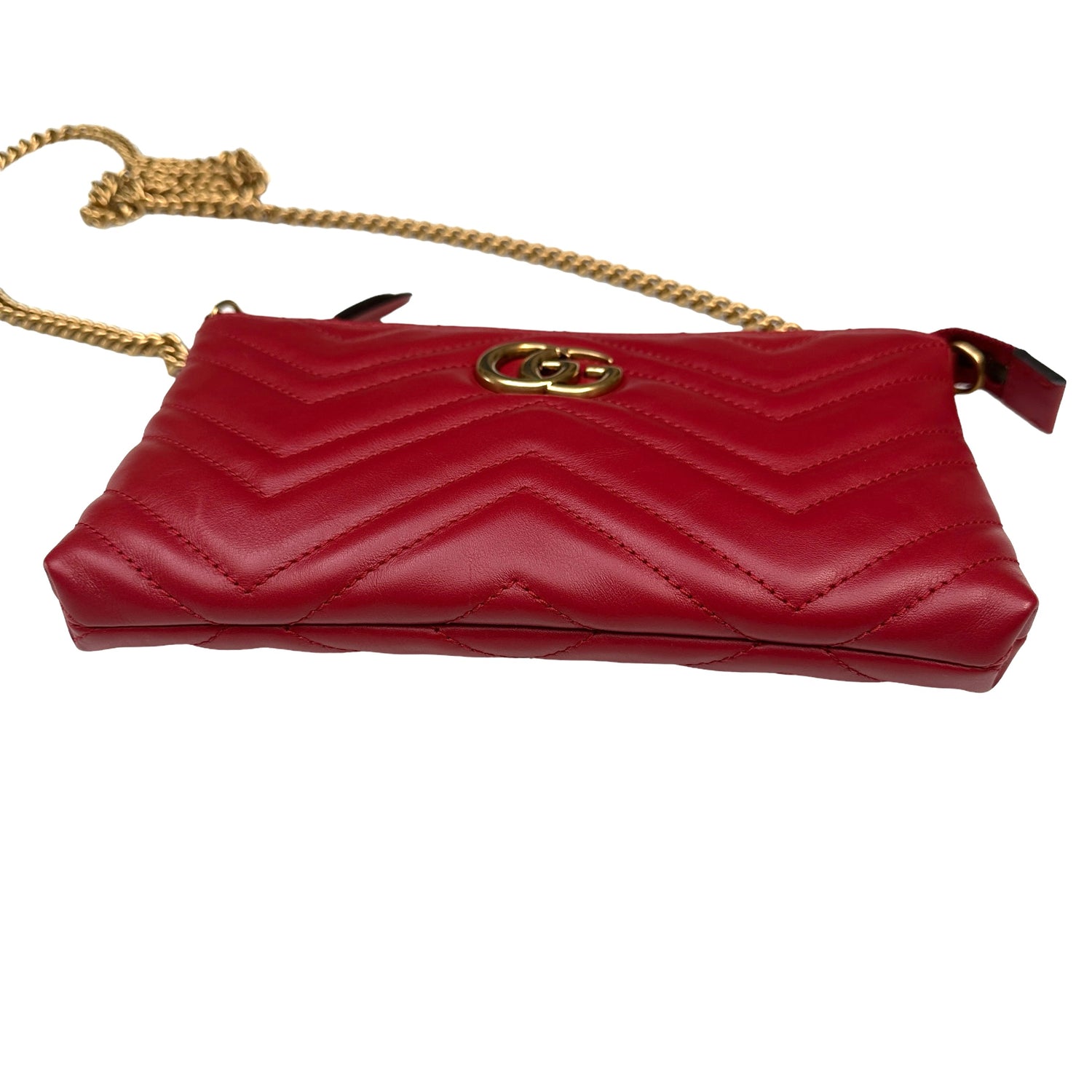 Gucci red crossbody bag with gold-tone chain. Zipper closure at top. GG logo at front. GG stitching at back. One zipper pocket at interior and card slots.