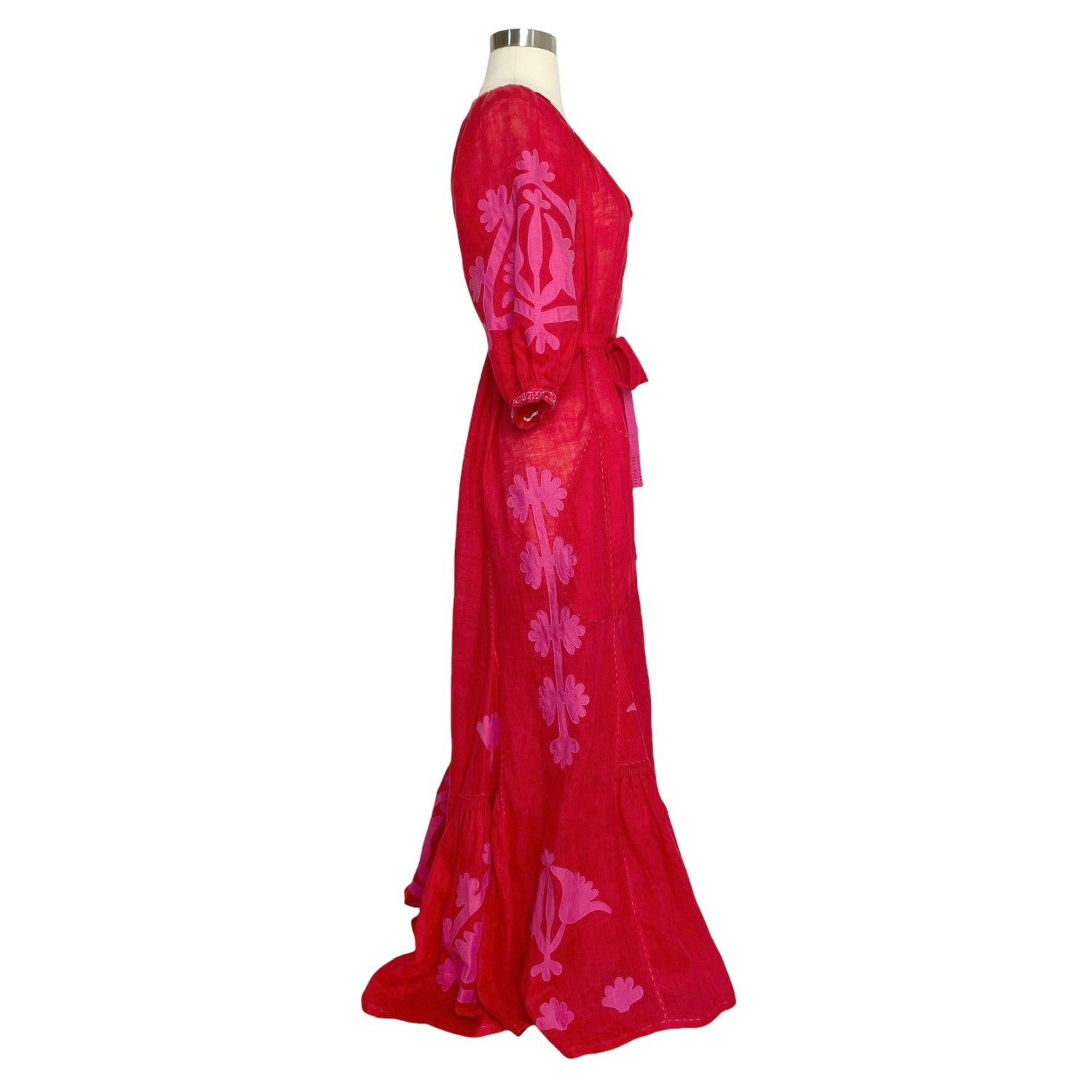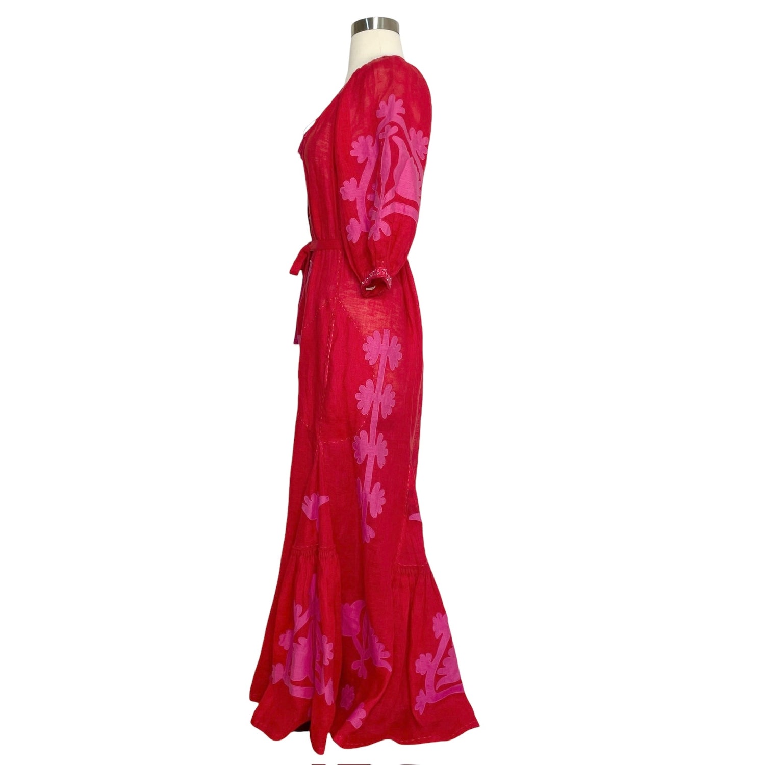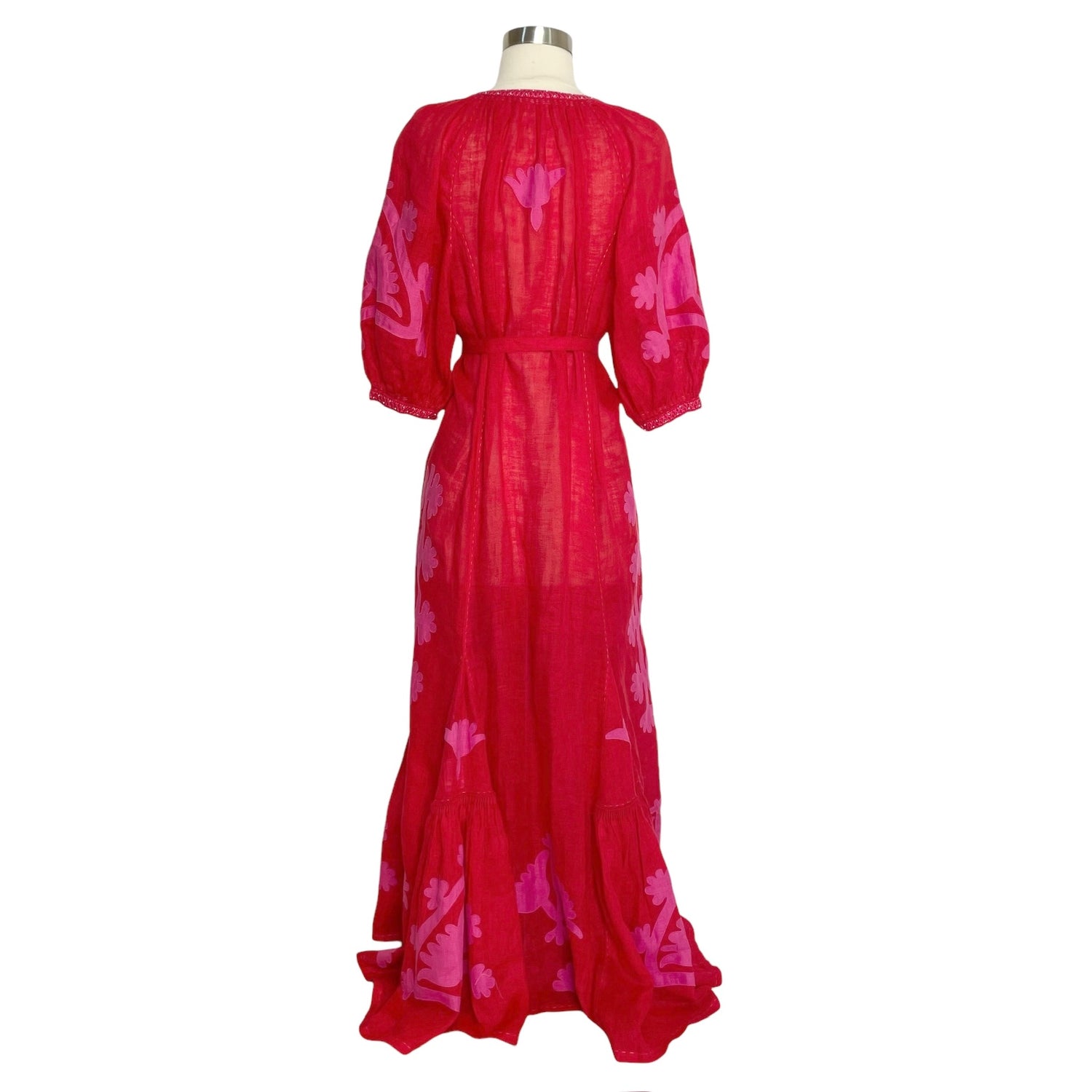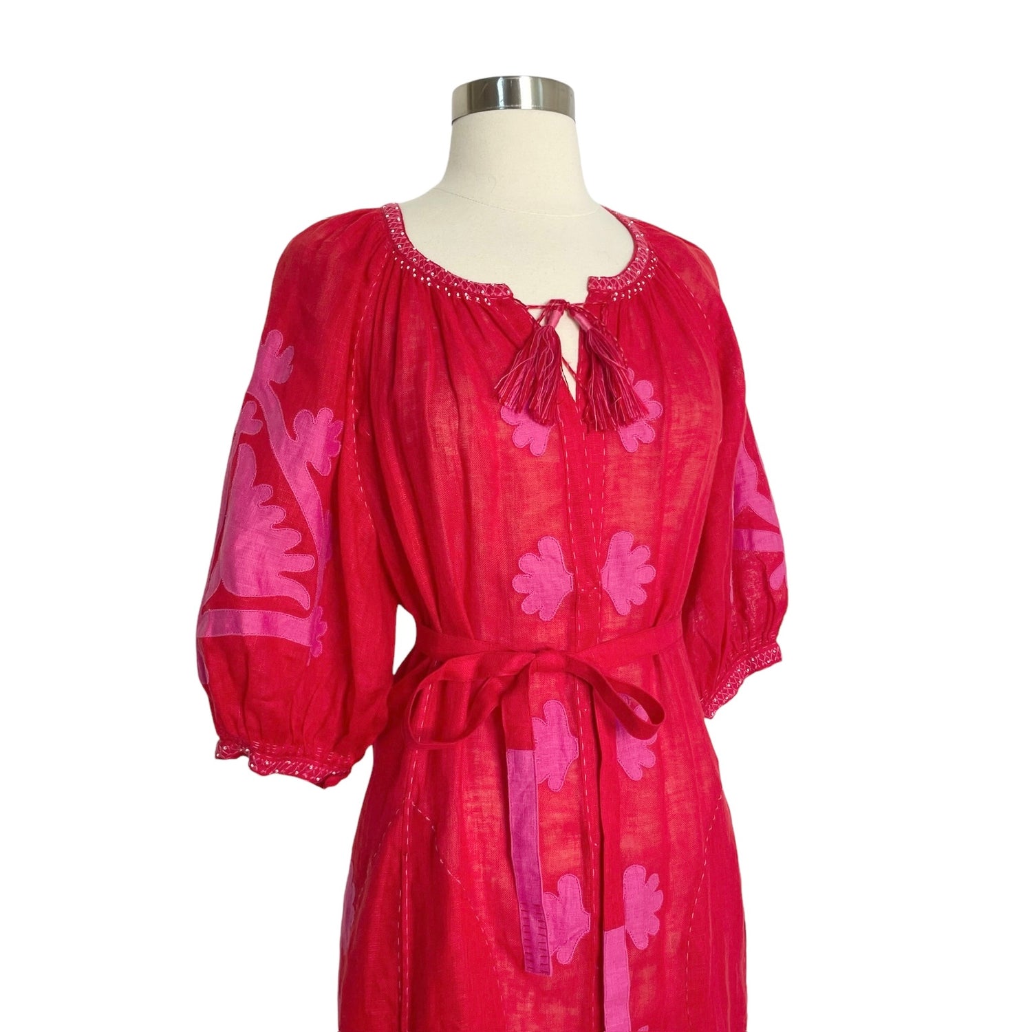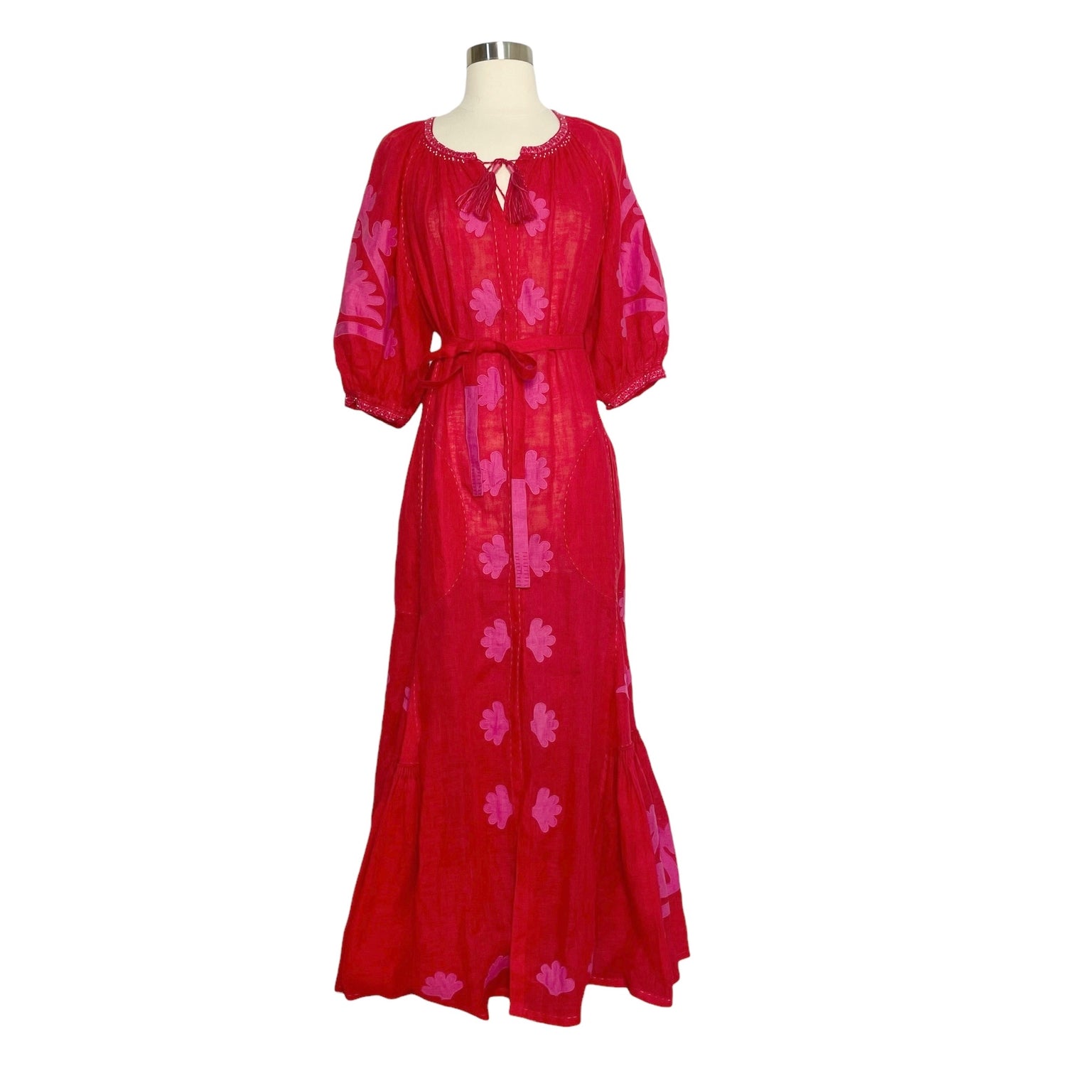 Vita Kin red dress. Maxi dress in linen. Red and pink fabric. Beads and embroideries. Pom pom at collar. Removable belt. Designer size small.
