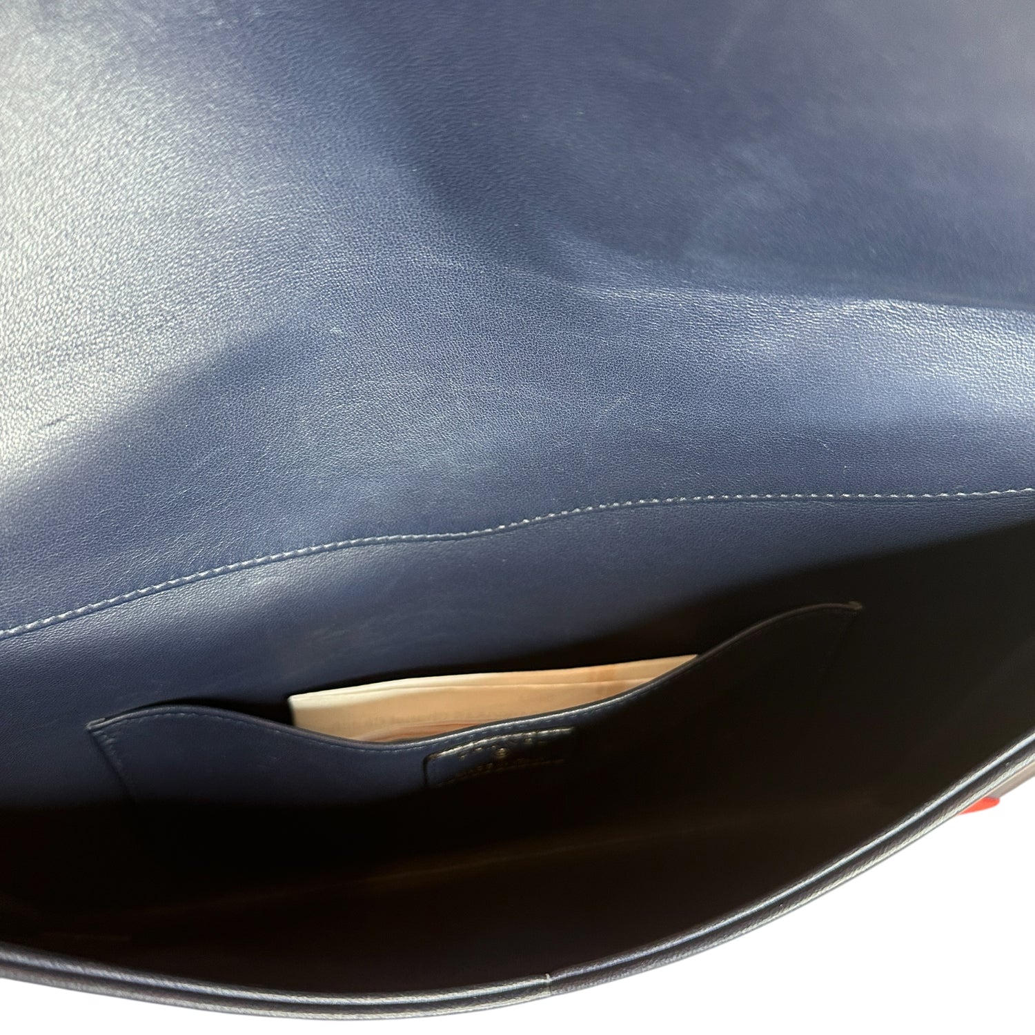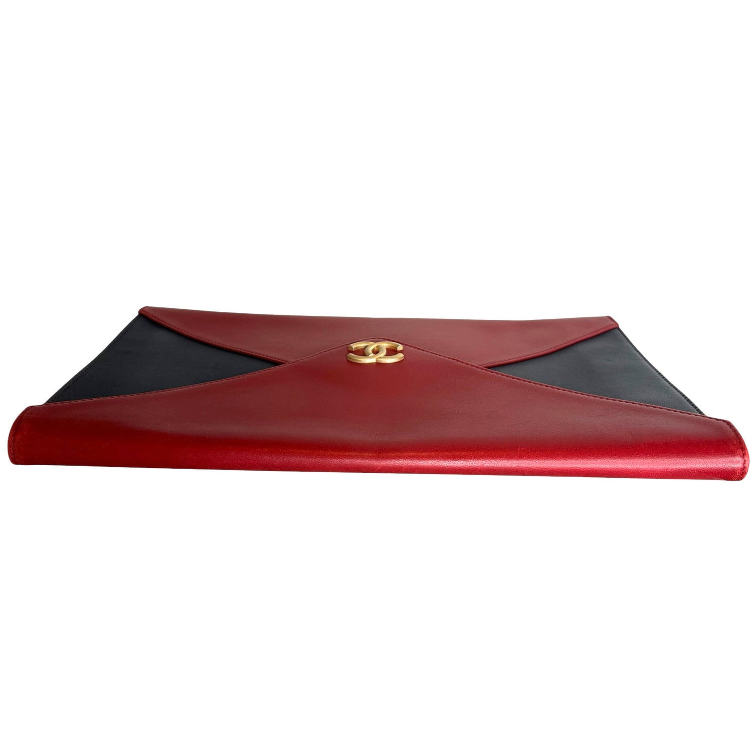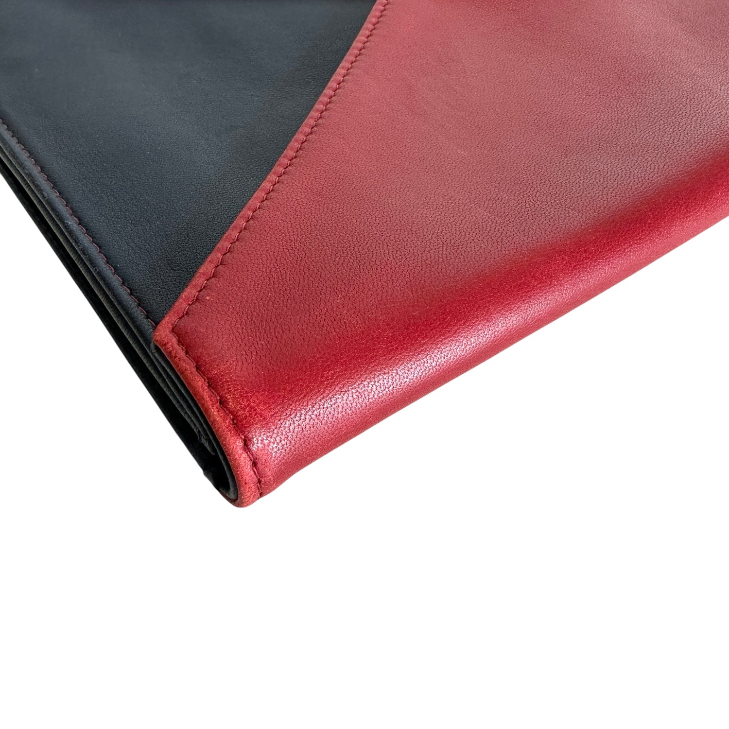 Chanel red and navy lambskin clutch. Gold-tone CC logo at front. Magnetic snap closure.