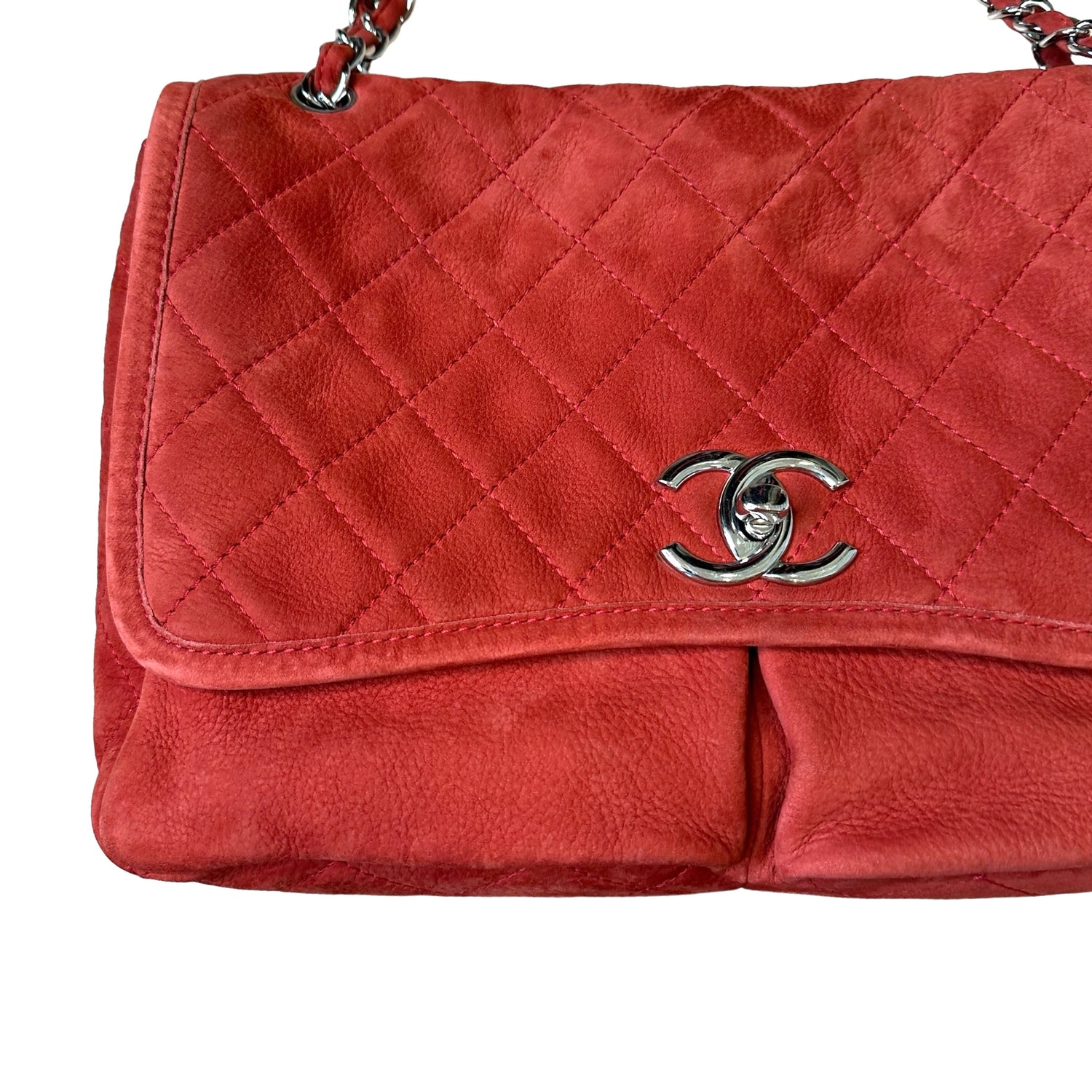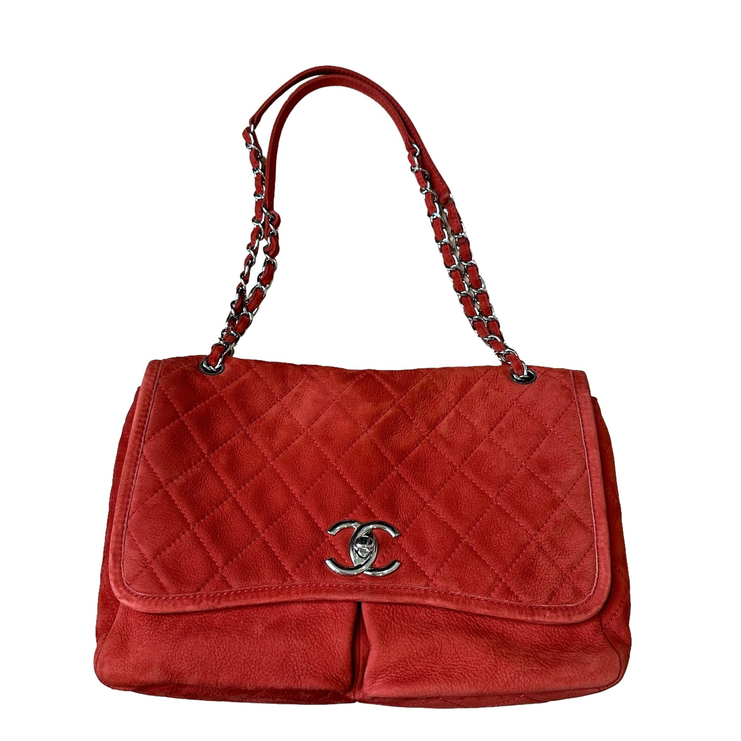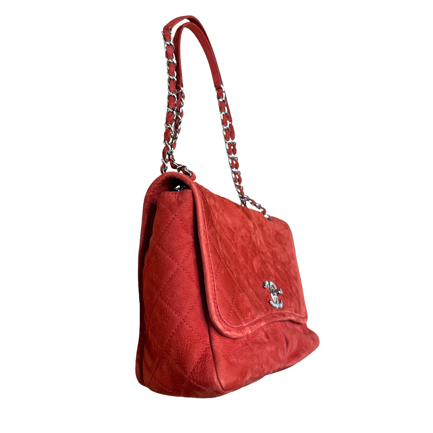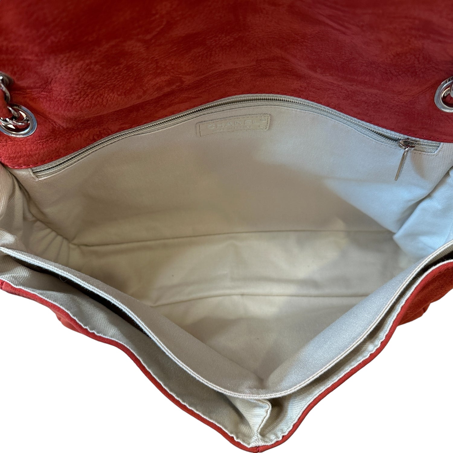 Chanel red nubuck large flap bag. 2012 Collection. Silver-tone hardware. One large exterior pocket at back. Three compartments and one zipper pocket at interior. Beige cotton canvas lining. Double chain strap to be carried as a shoulder bag or crossbody.