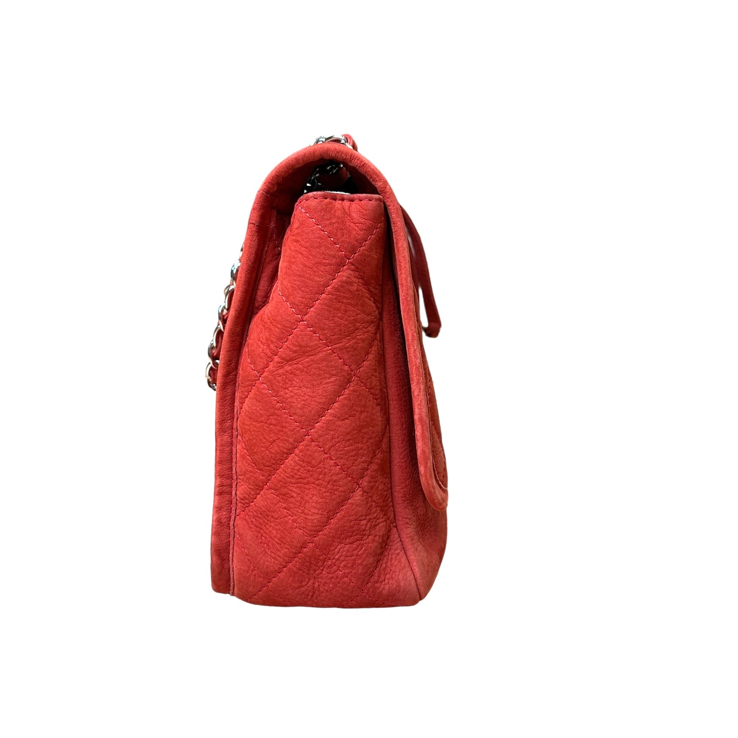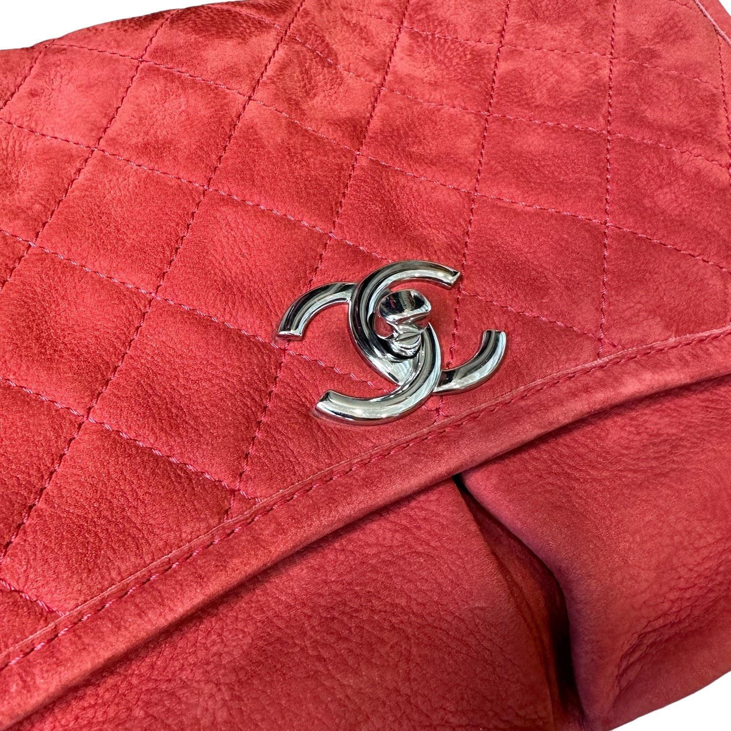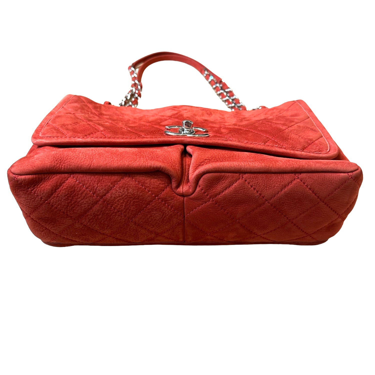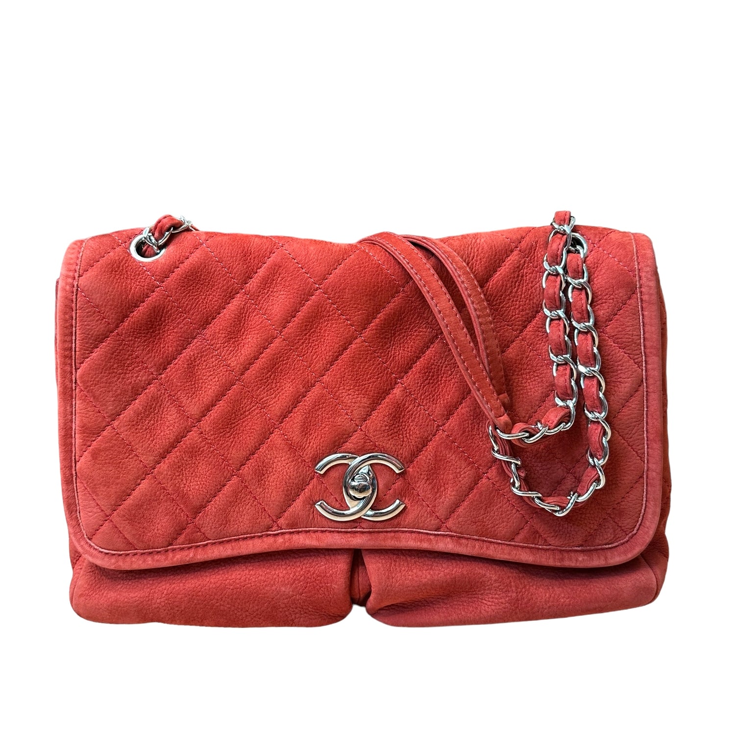 Chanel red nubuck large flap bag. 2012 Collection. Silver-tone hardware. One large exterior pocket at back. Three compartments and one zipper pocket at interior. Beige cotton canvas lining. Double chain strap to be carried as a shoulder bag or crossbody.