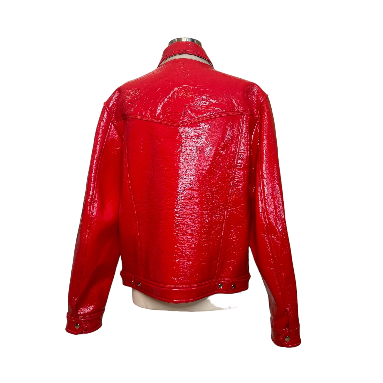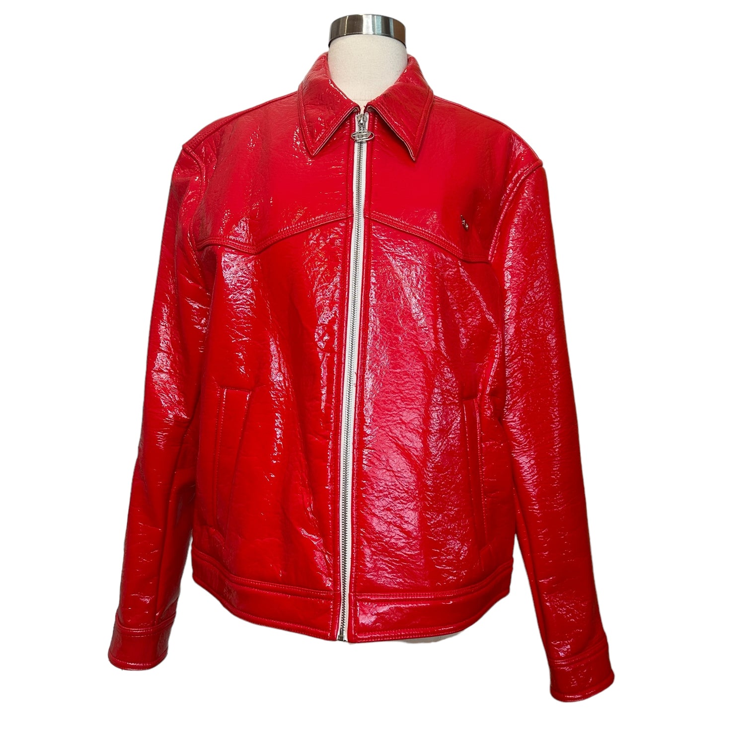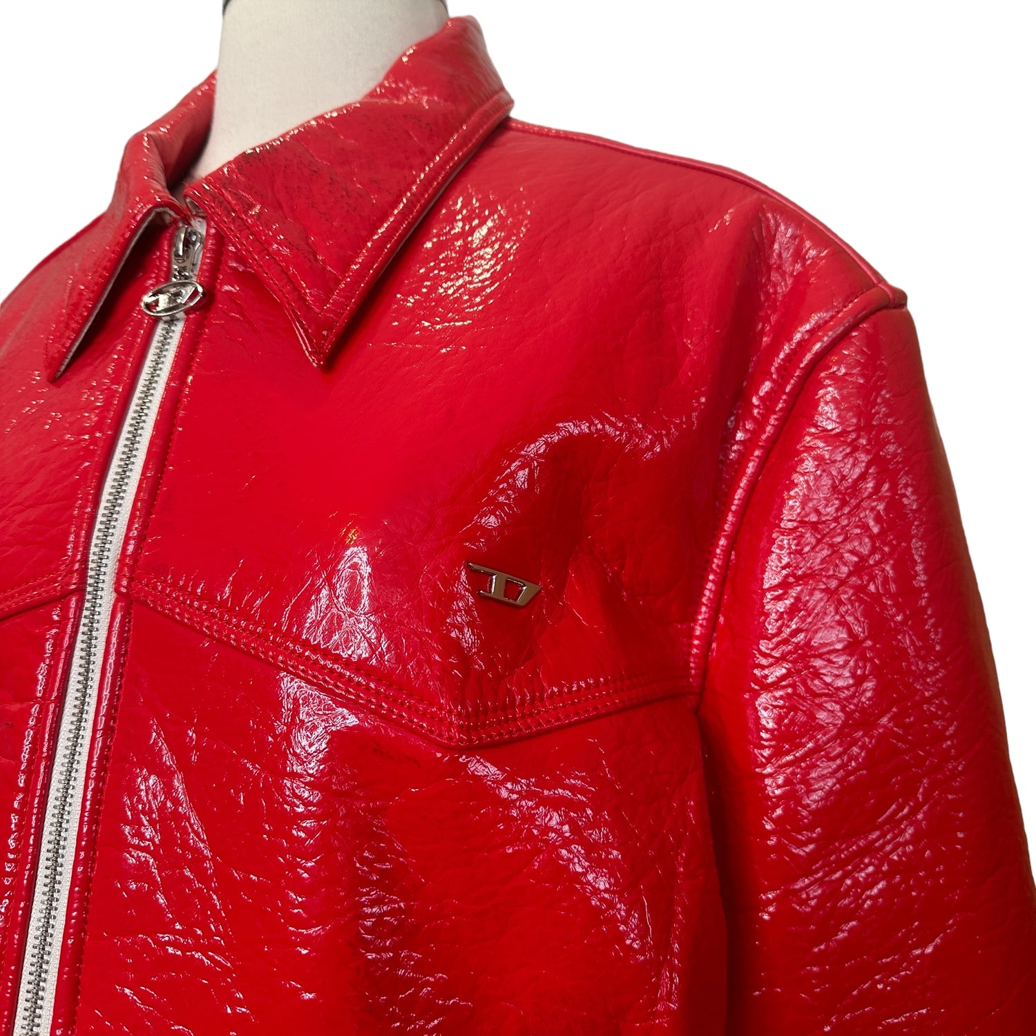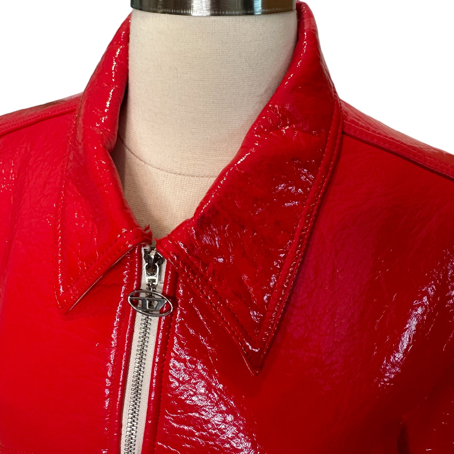 Diesel red patent jacket. Logo at front. Zipper closure at front. Silver-tone hardware. Pockets. One interior pocket. Designer size XL.
