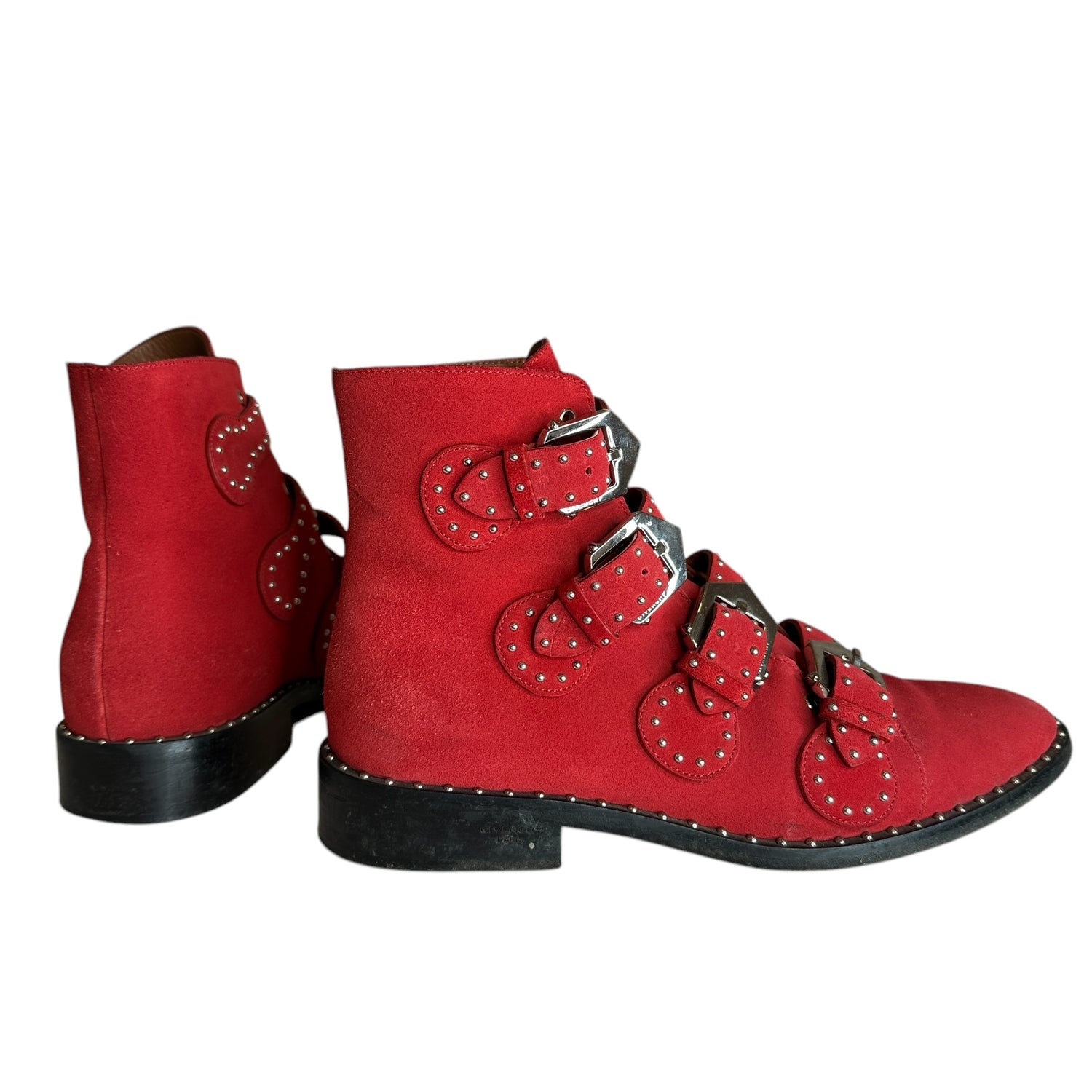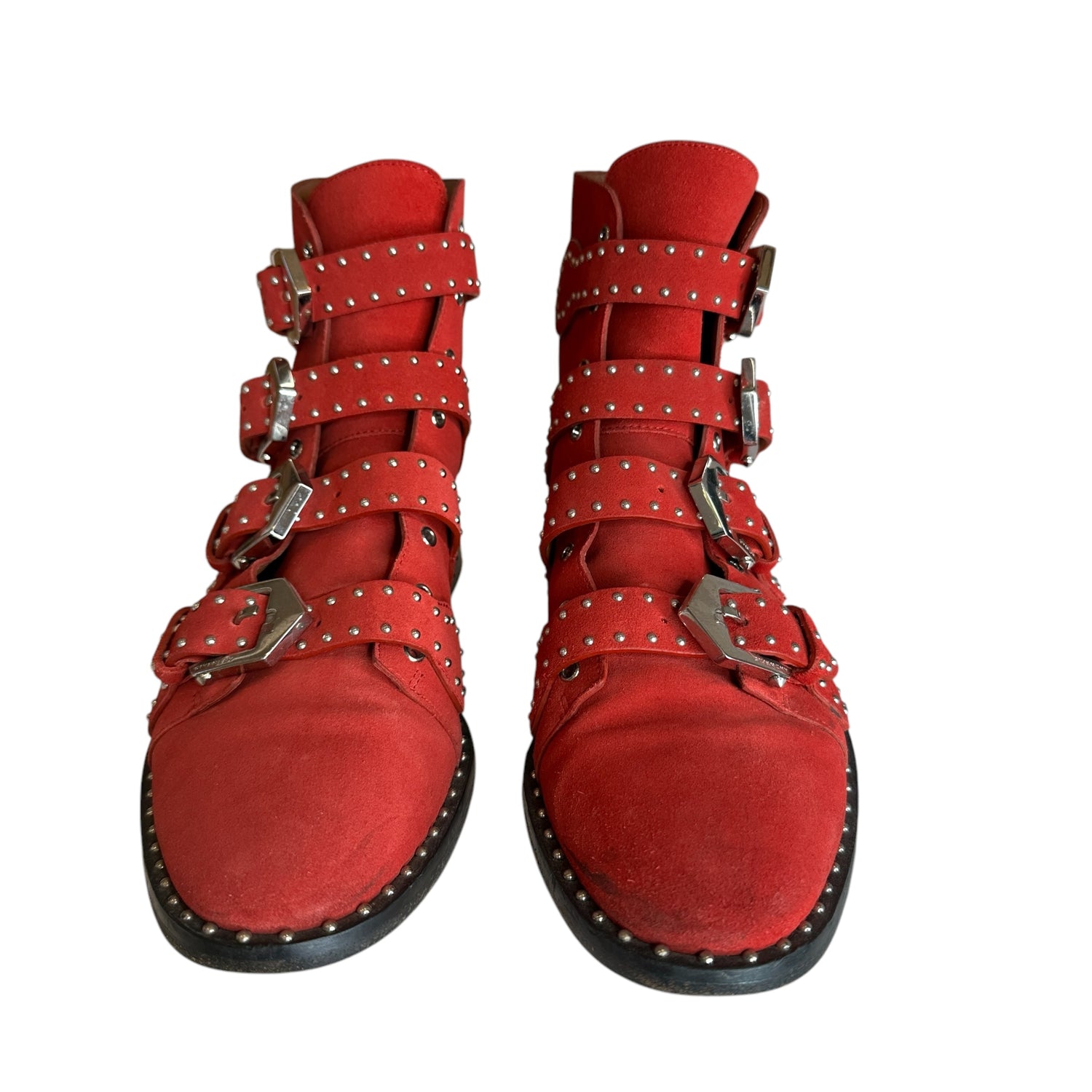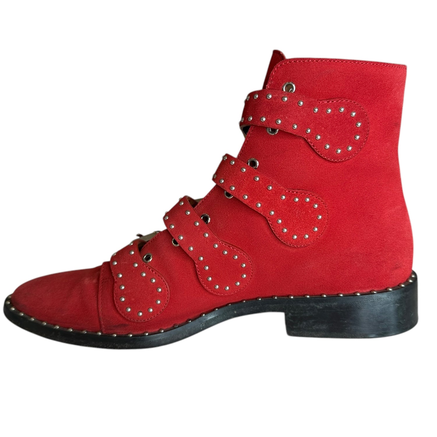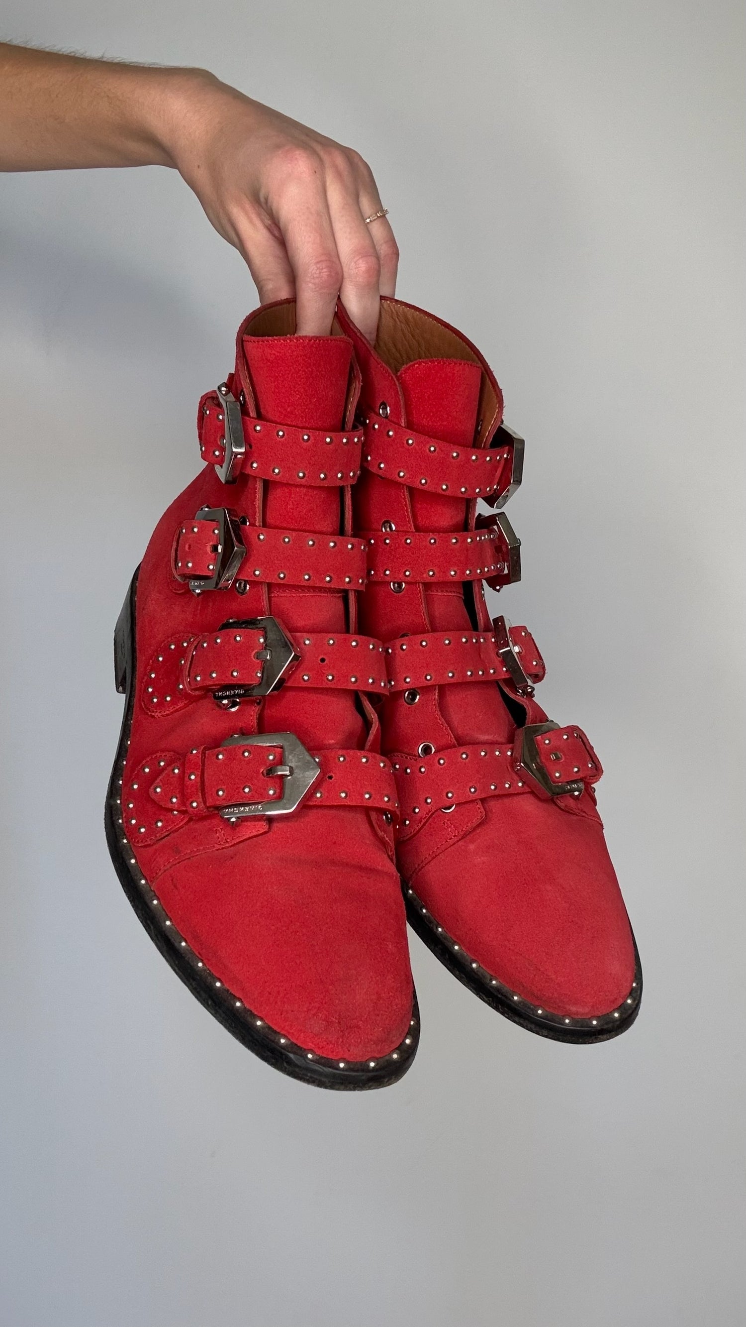 Givenchy red suede boots. Silver studded buckles closure. Designer size 40.