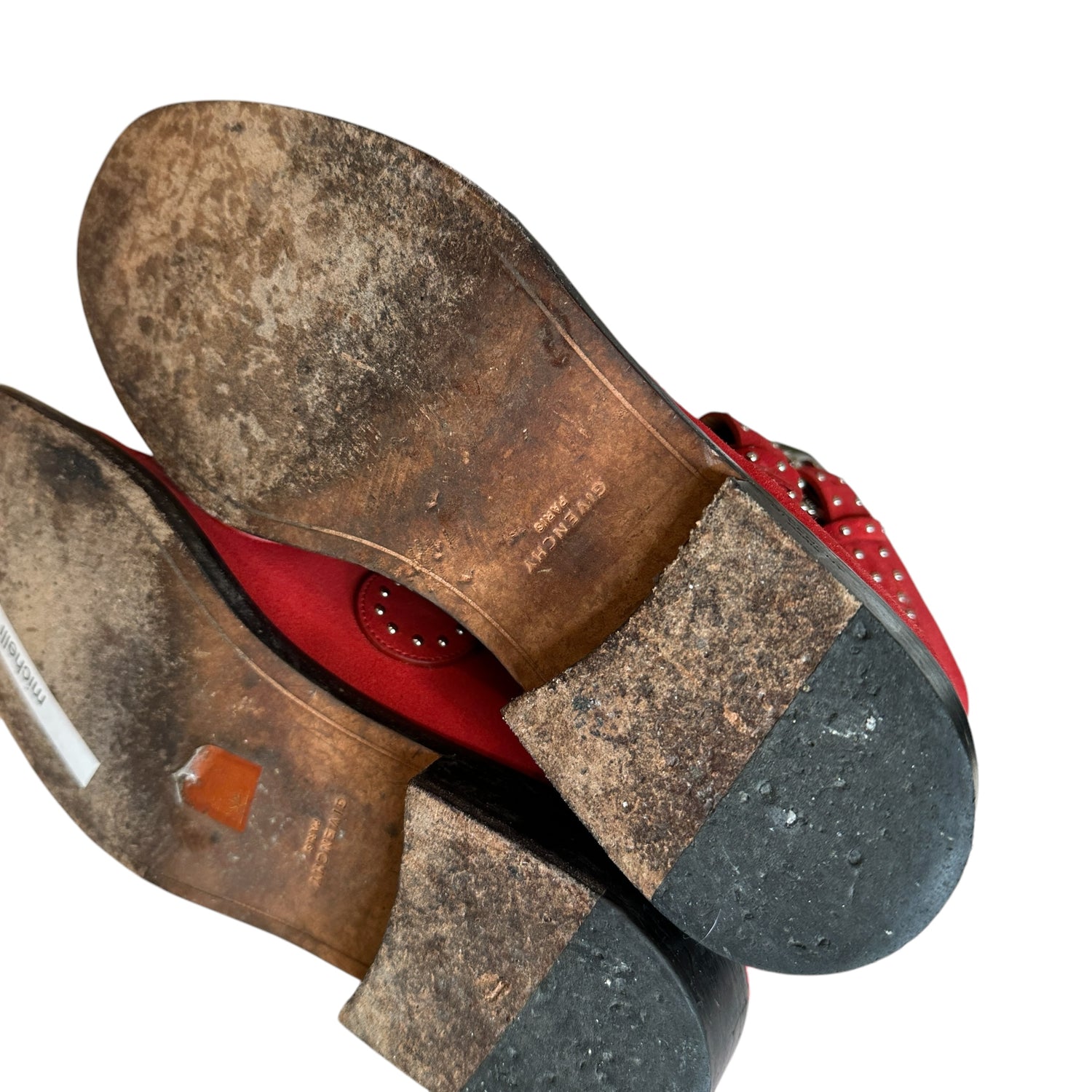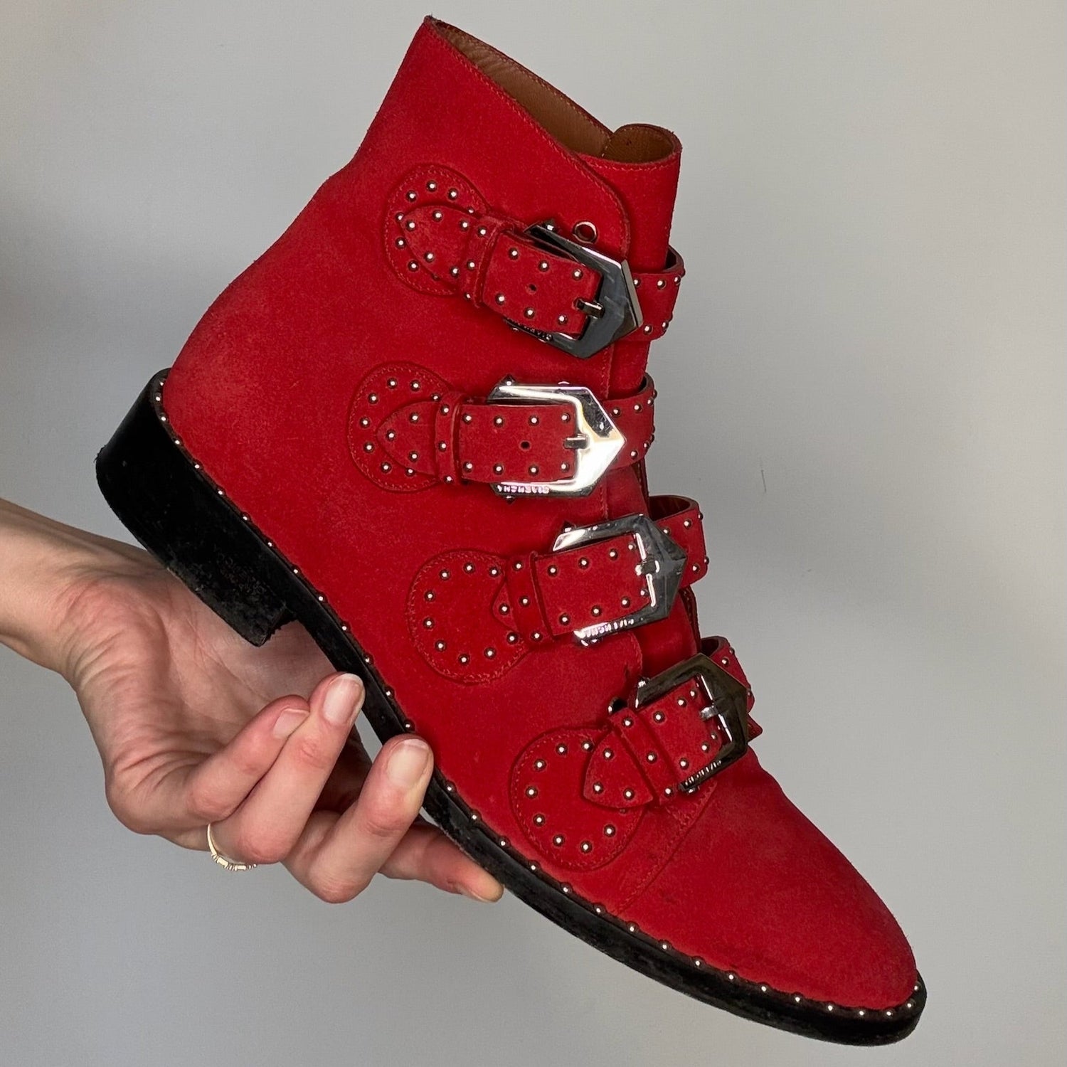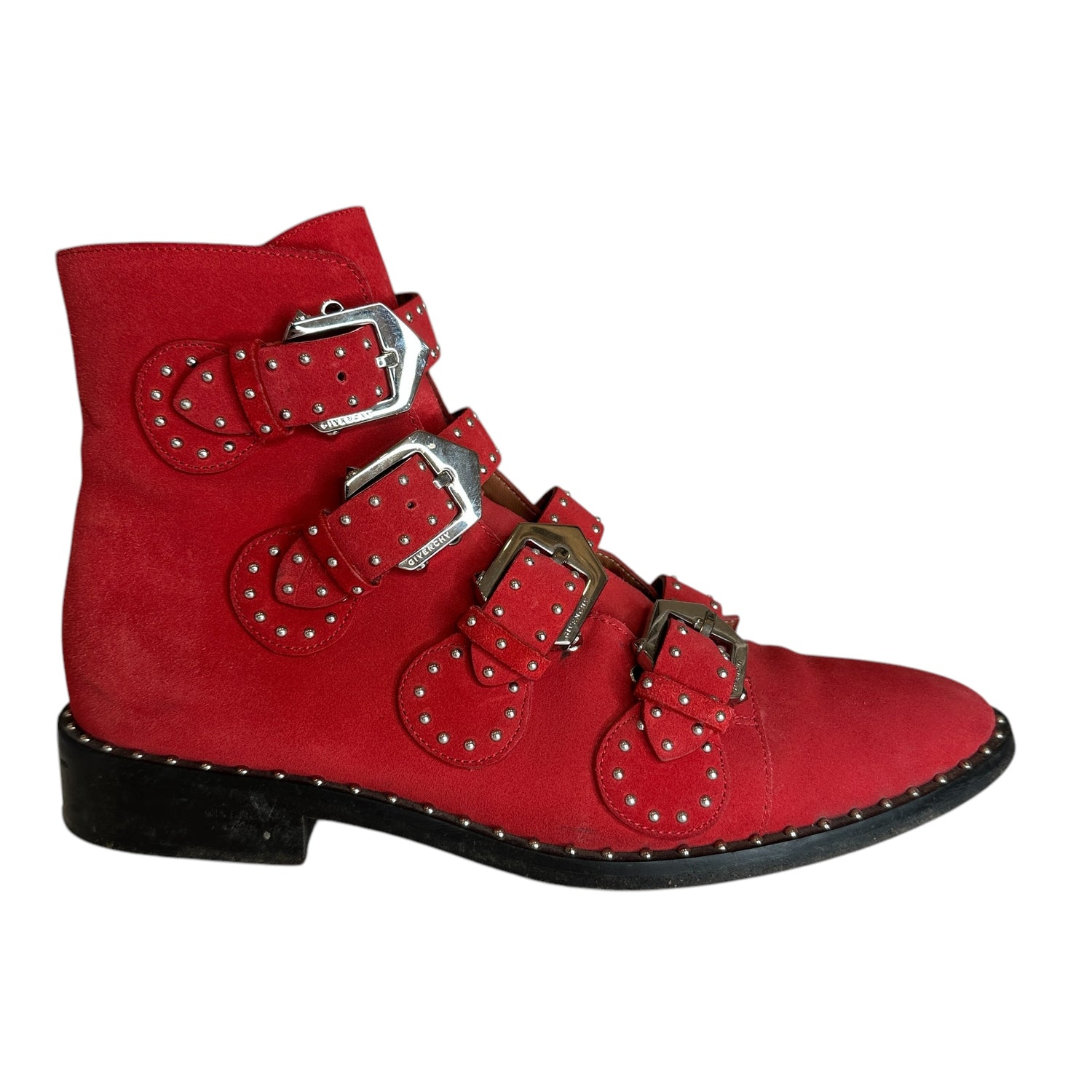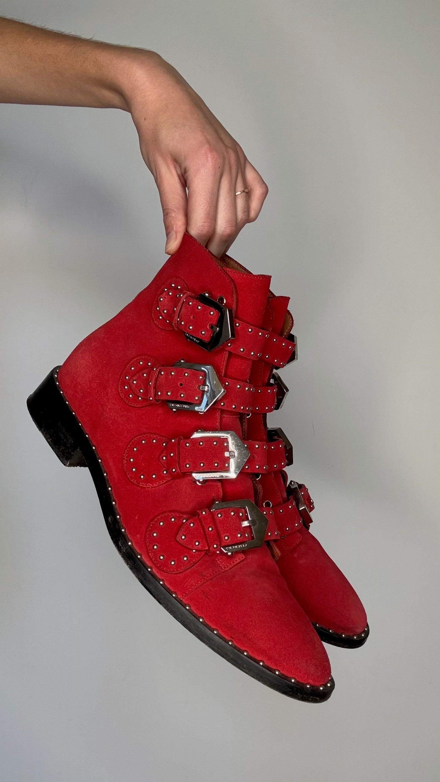 Givenchy red suede boots. Silver studded buckles closure. Designer size 40.