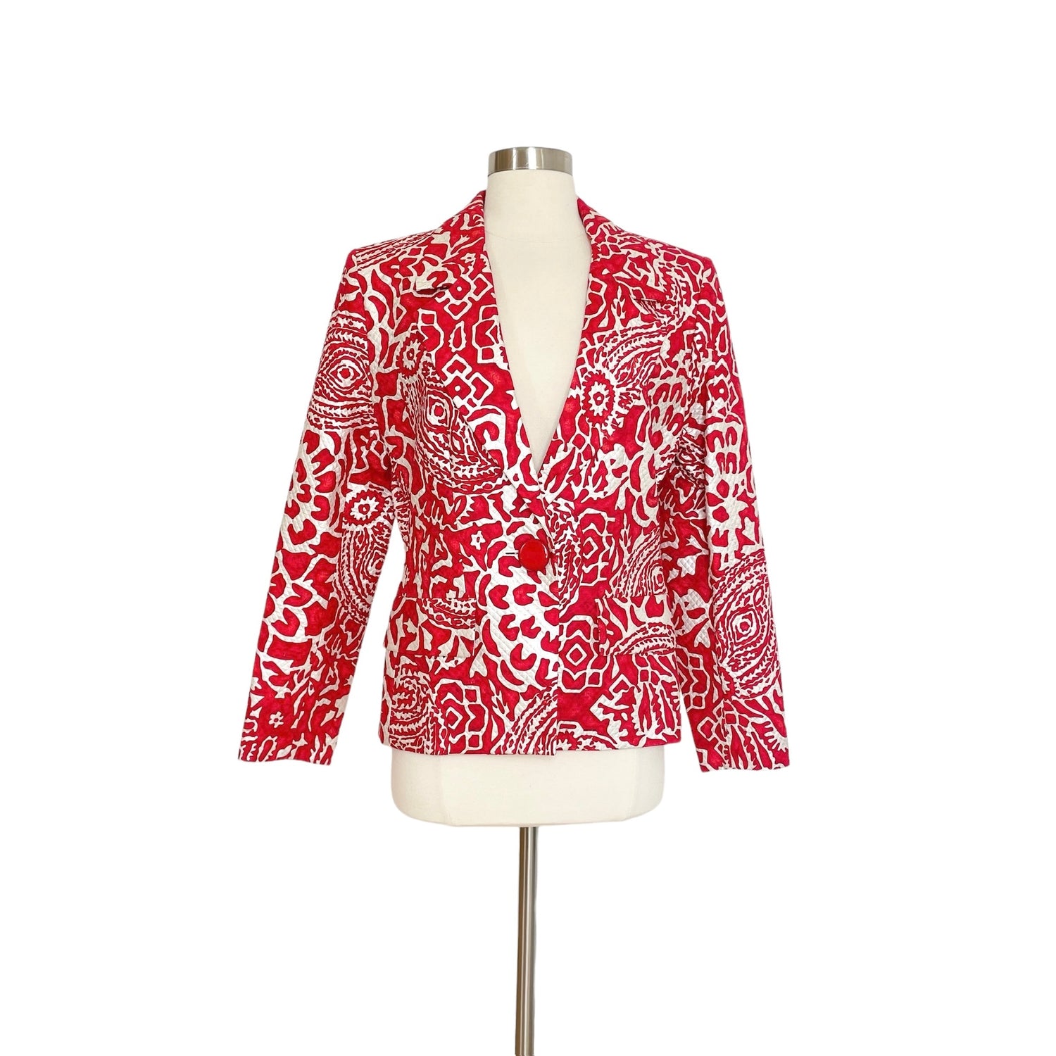 Yves Saint Laurent red and white patterned blazer. Button closure at front. Padded shoulders. Designer size 42