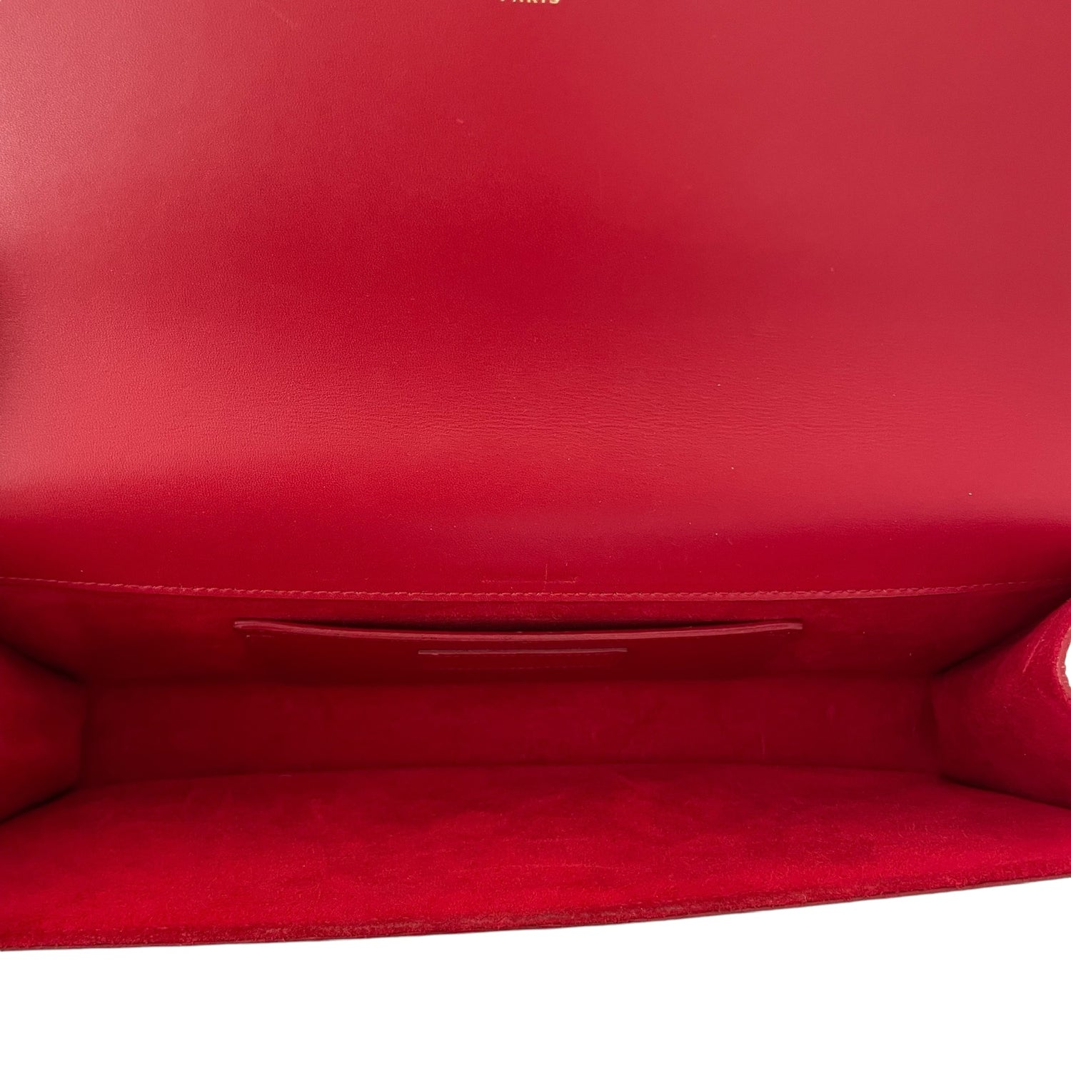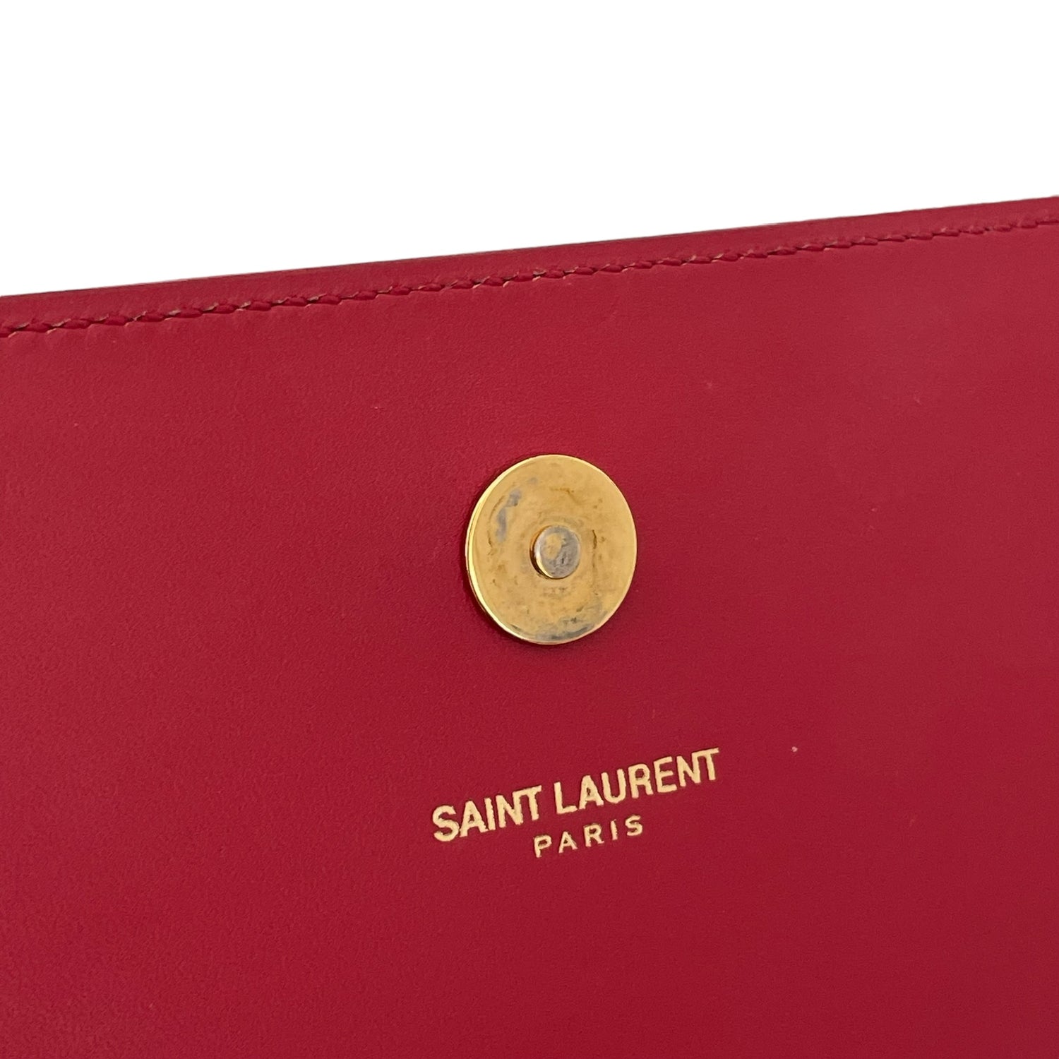 Saint Laurent red leather clutch. YSL logo in gold-tone hardware. Magnetic snap closure at flap. One interior slit pocket.
