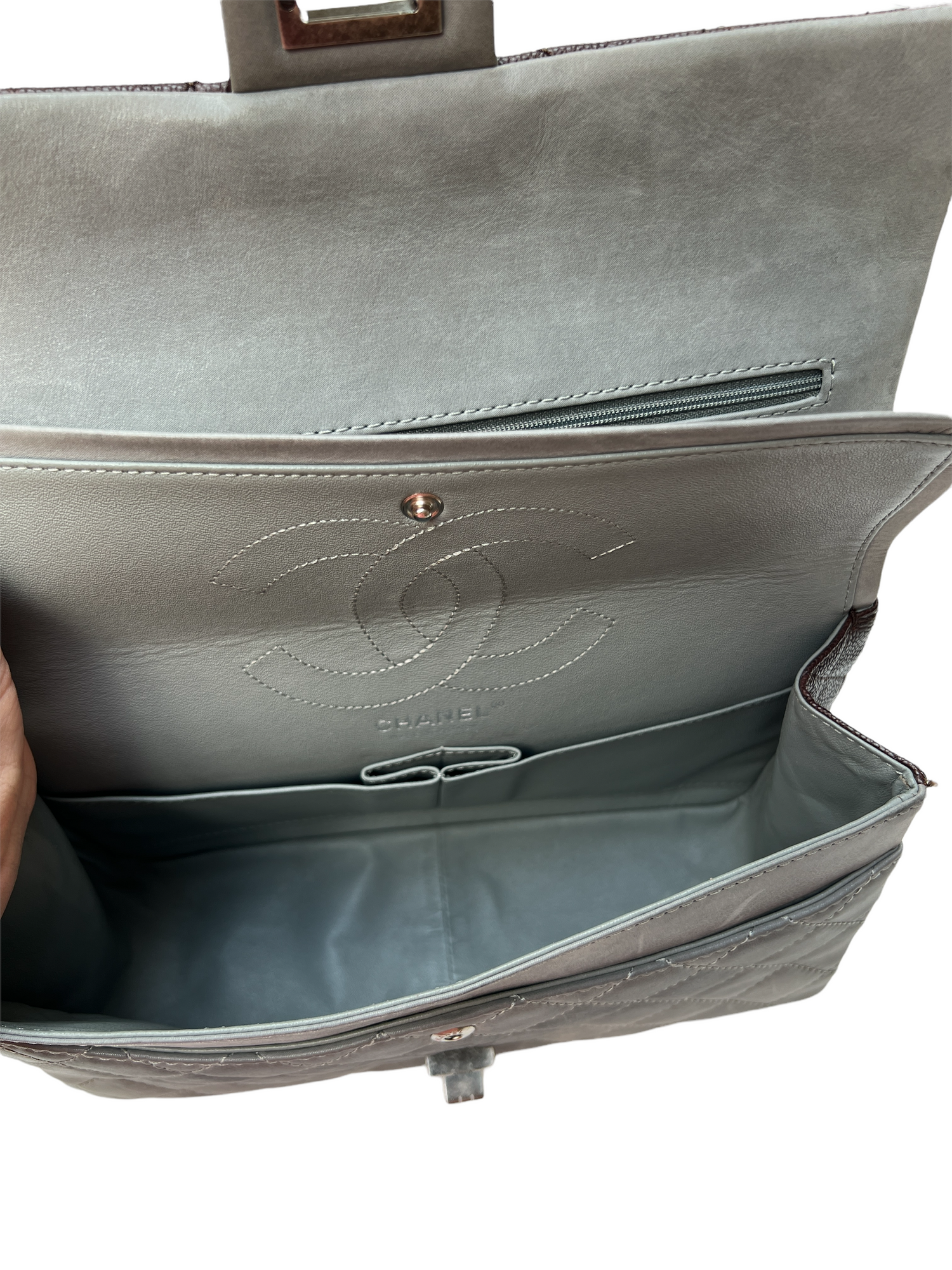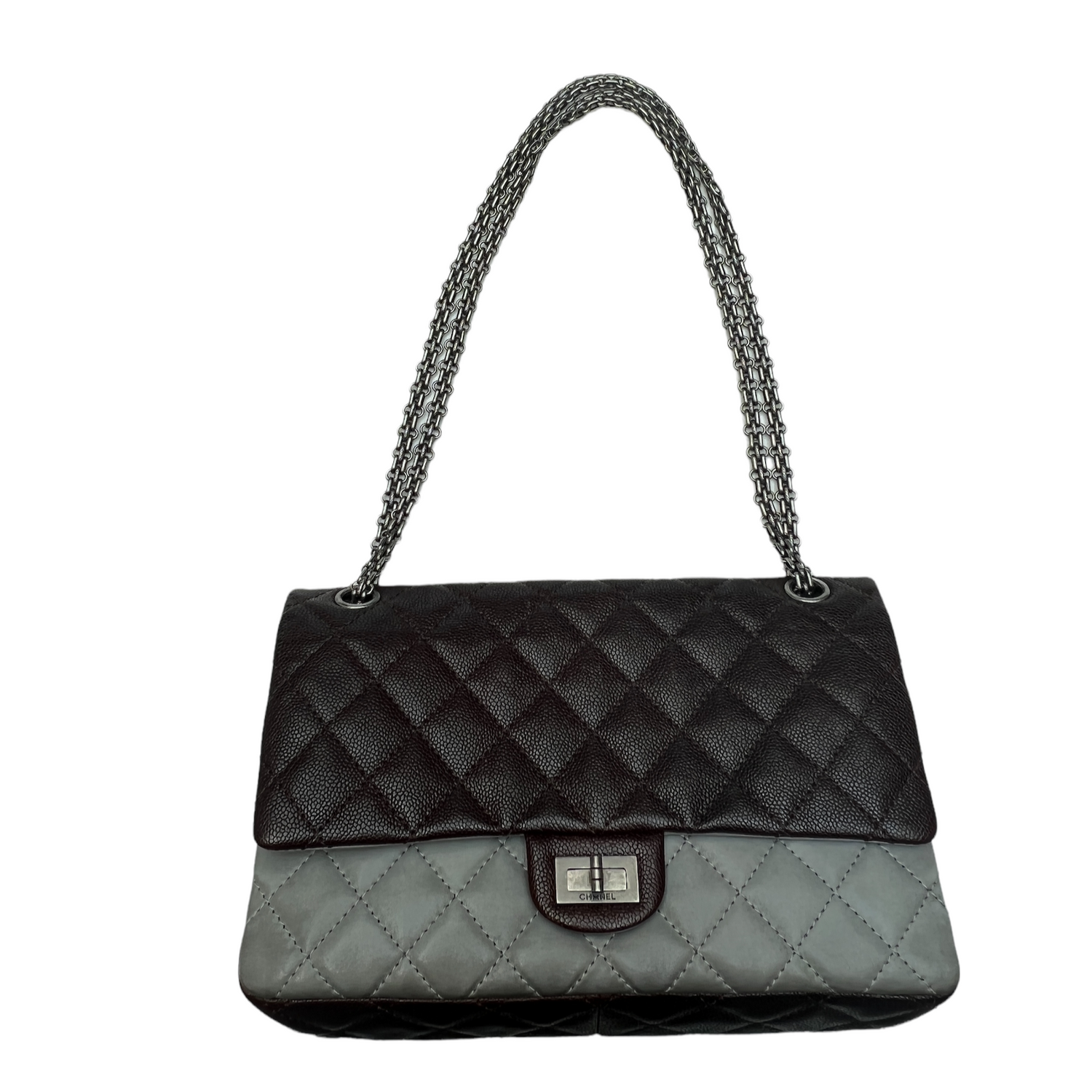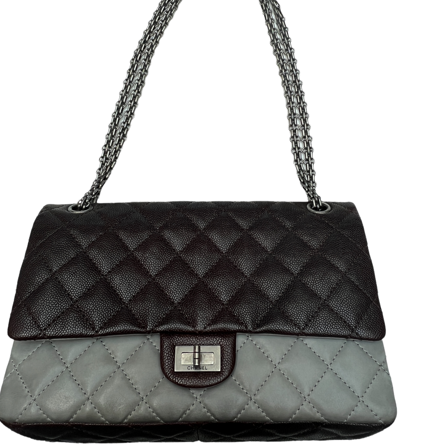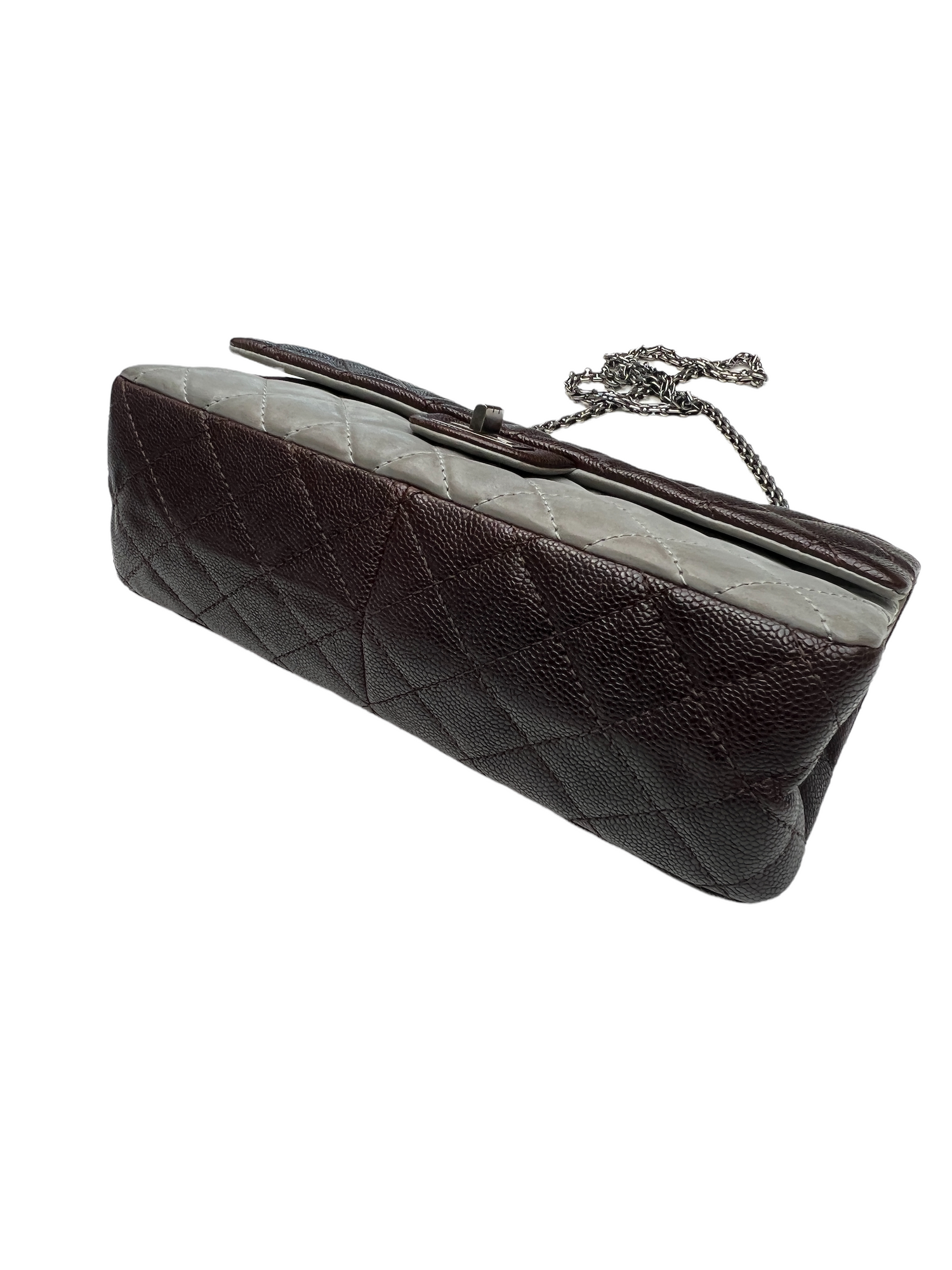 Chanel bag with brown caviar leather and smooth coated grey leather. Silver tone hardware. Classic double flap closure. Double chain which can be worn crossbody or shoulder. This bag can be paired with everything for a casual yet chic look thanks to the bi-color flap.