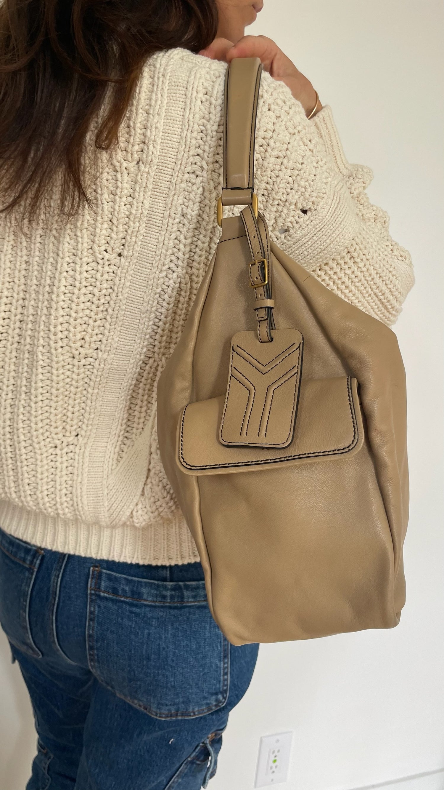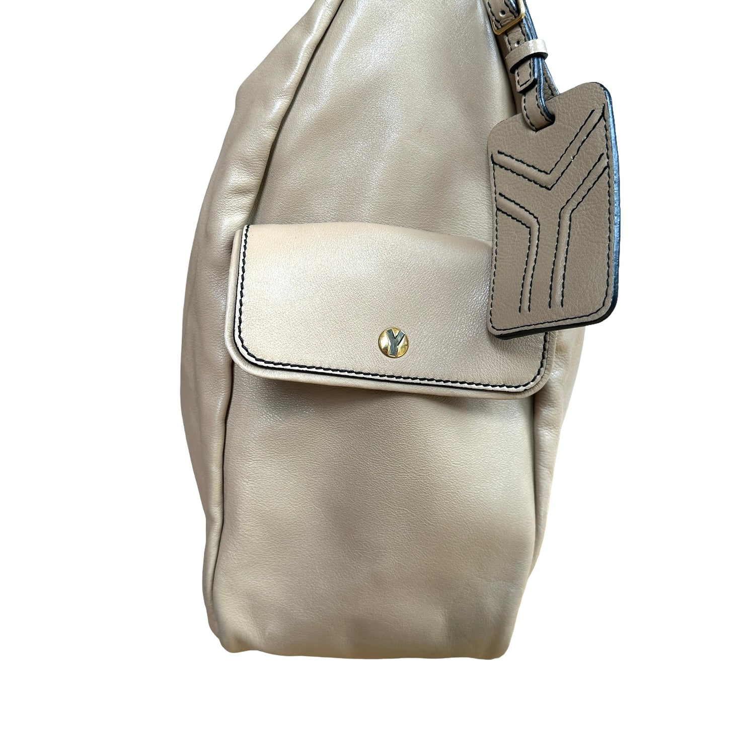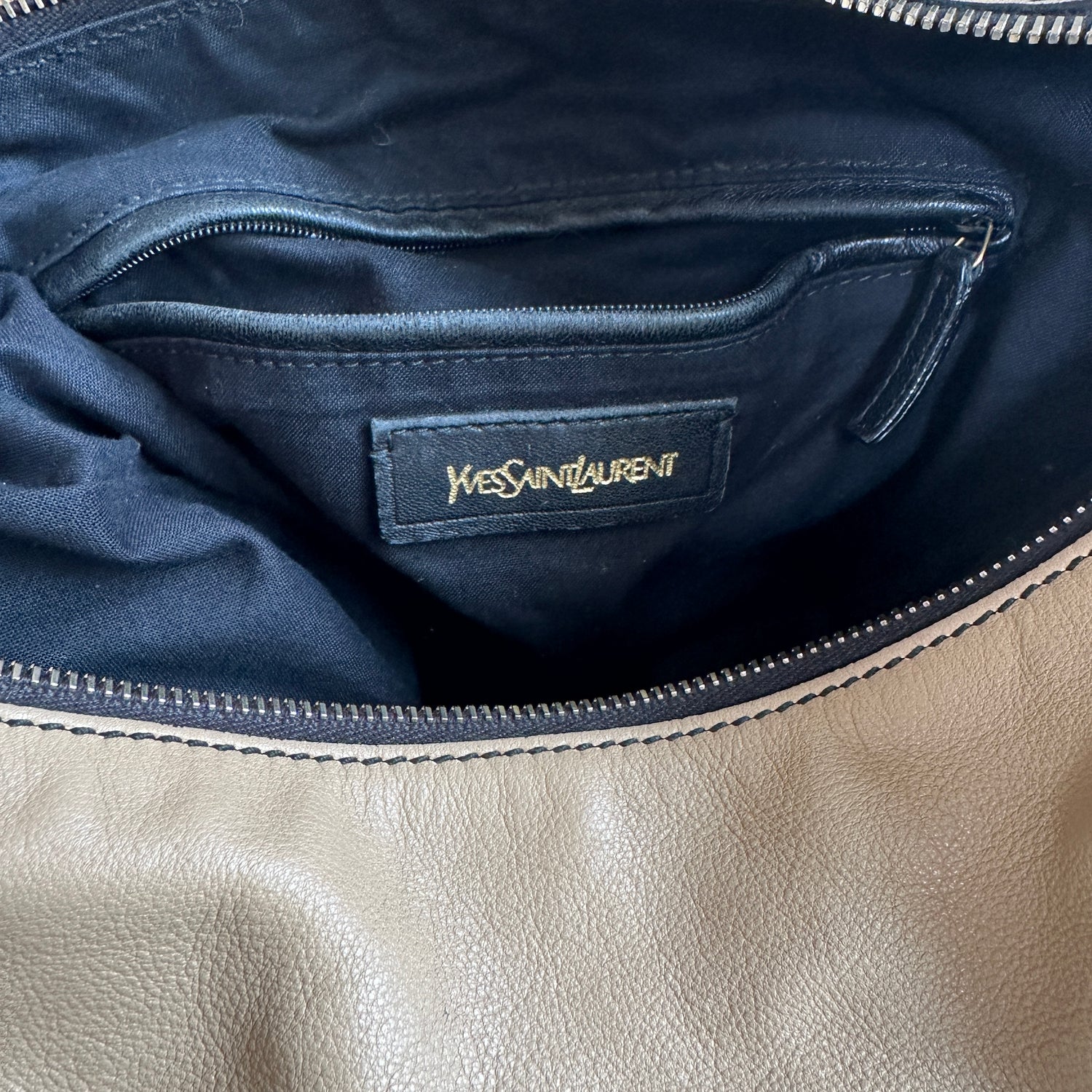 Yves Saint Laurent beige hobo bag. Zipper closure at top. Two exterior pockets. One interior zipper pockets. Gold-tone hardware. Y luggage ID tag at handle. Black cotton canvas lining.