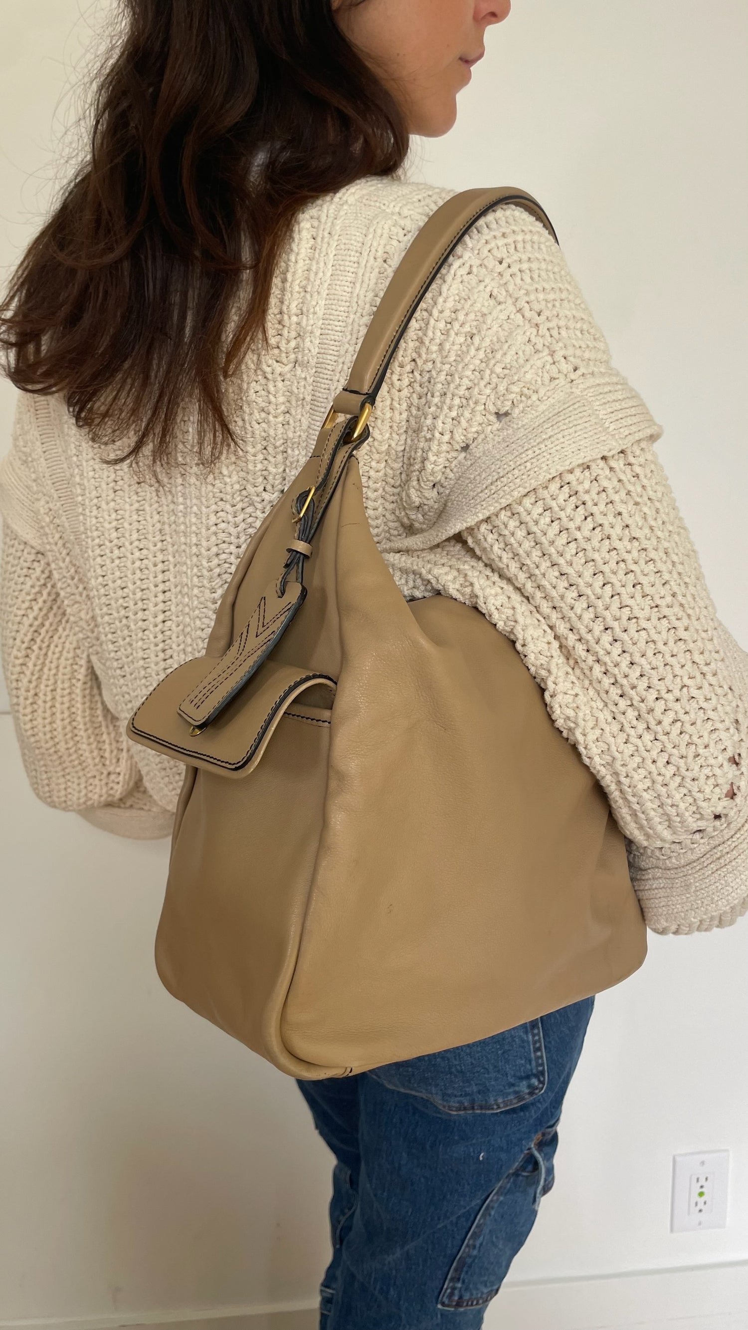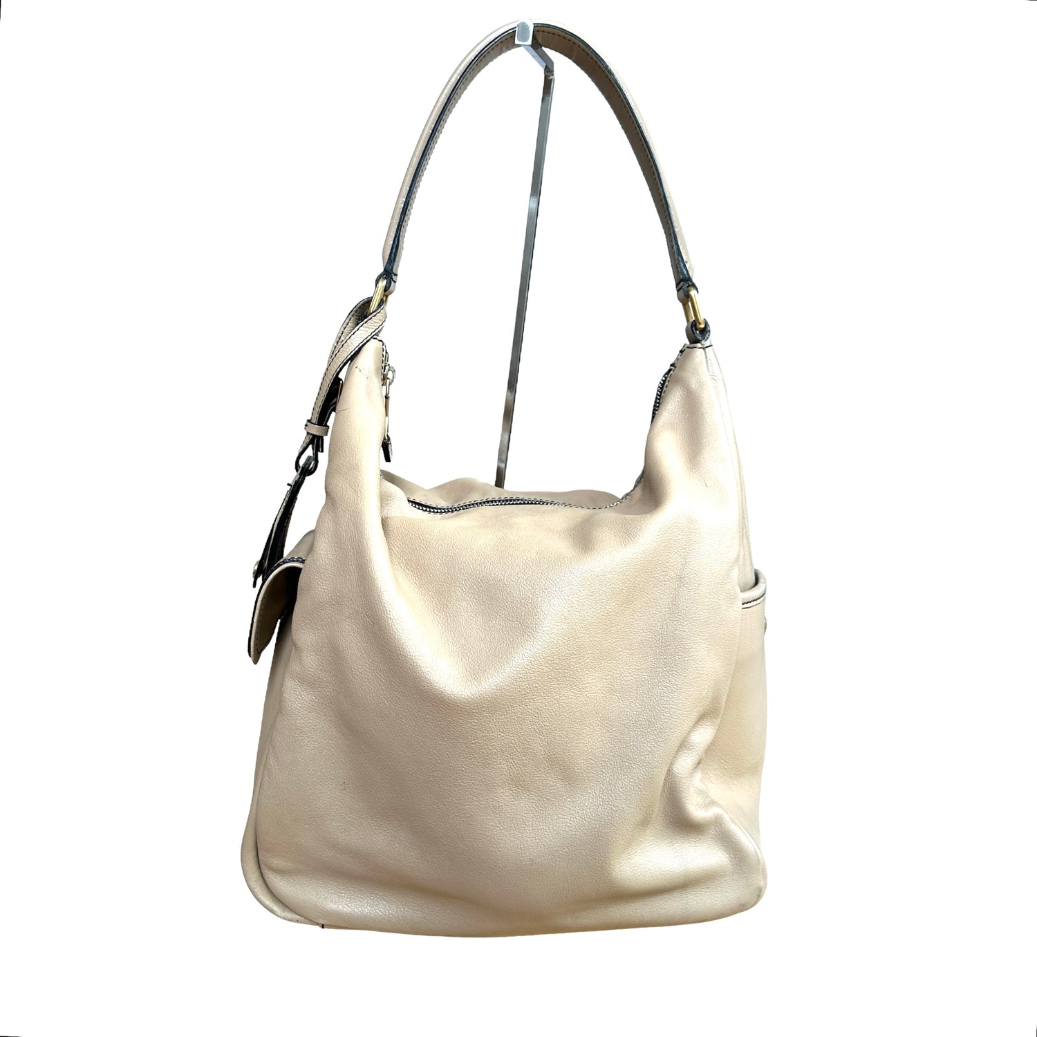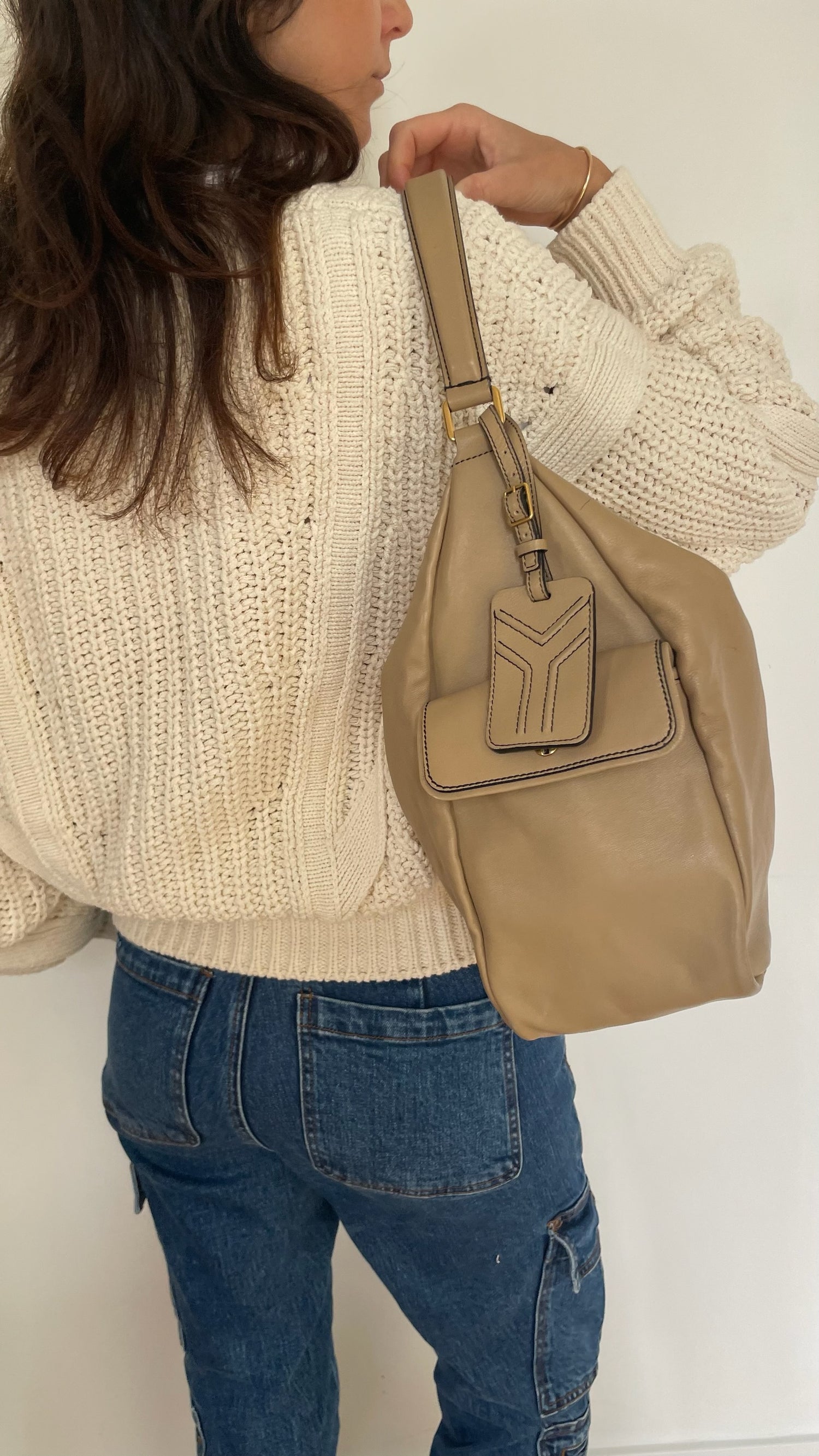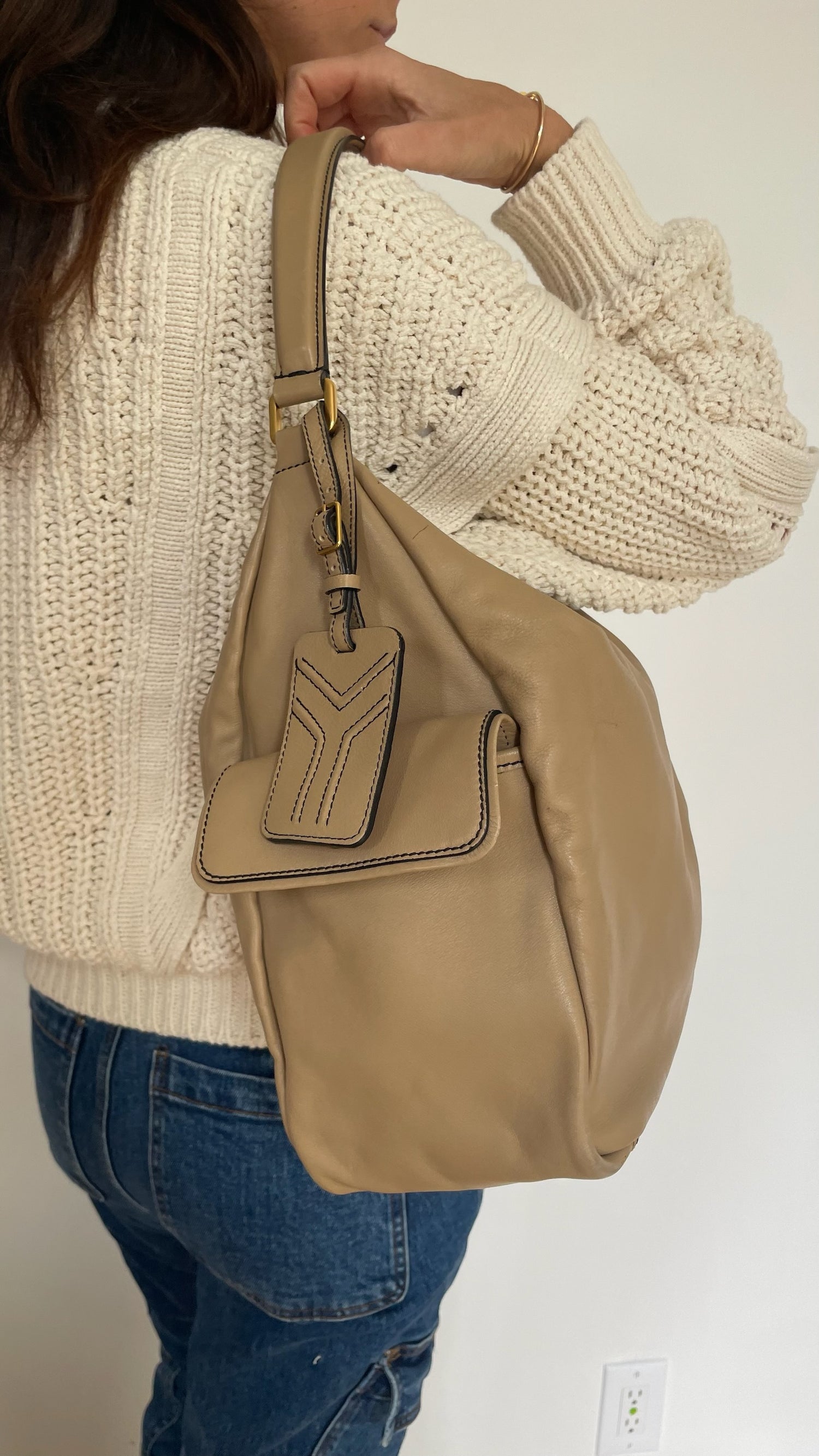 Yves Saint Laurent beige hobo bag. Zipper closure at top. Two exterior pockets. One interior zipper pockets. Gold-tone hardware. Y luggage ID tag at handle. Black cotton canvas lining.