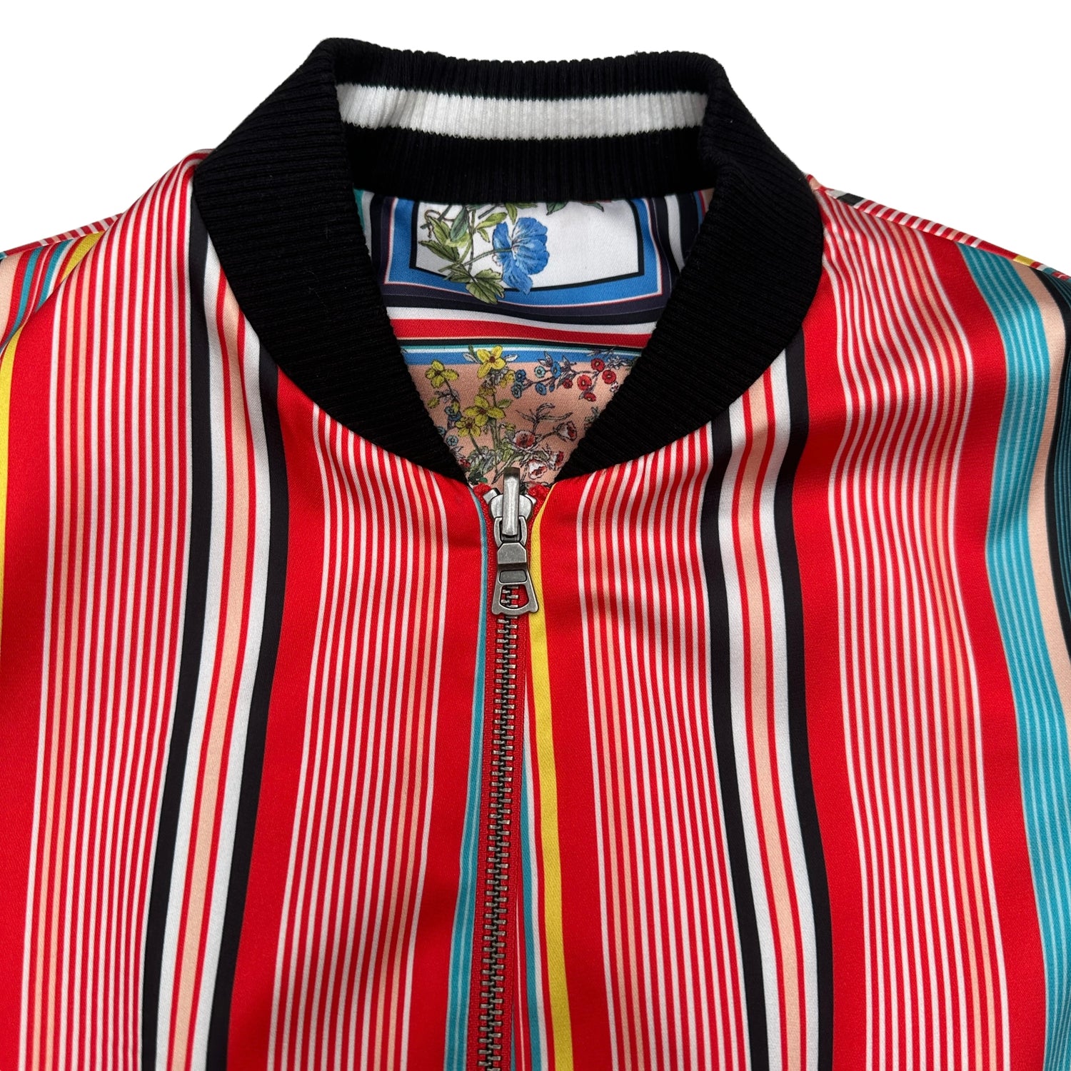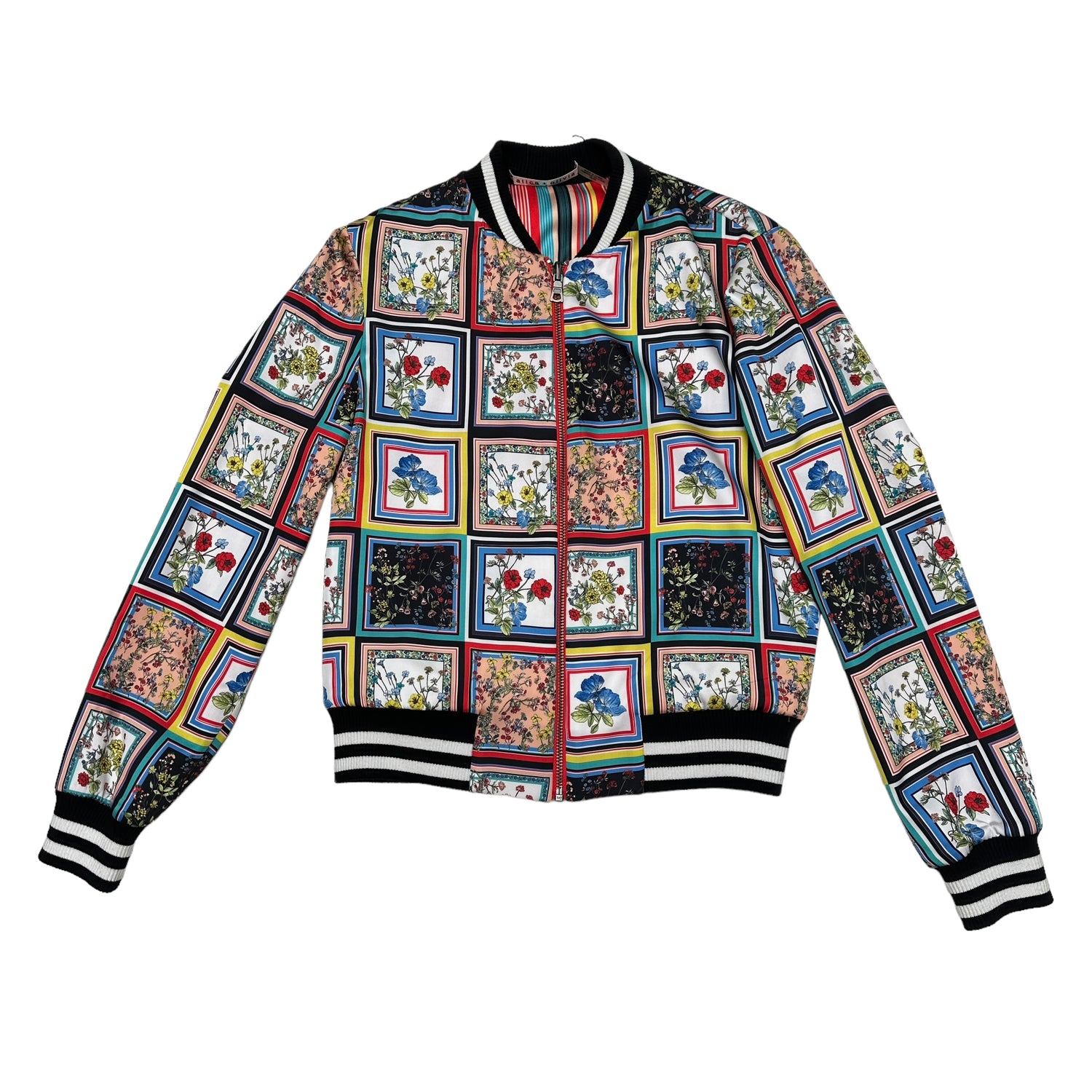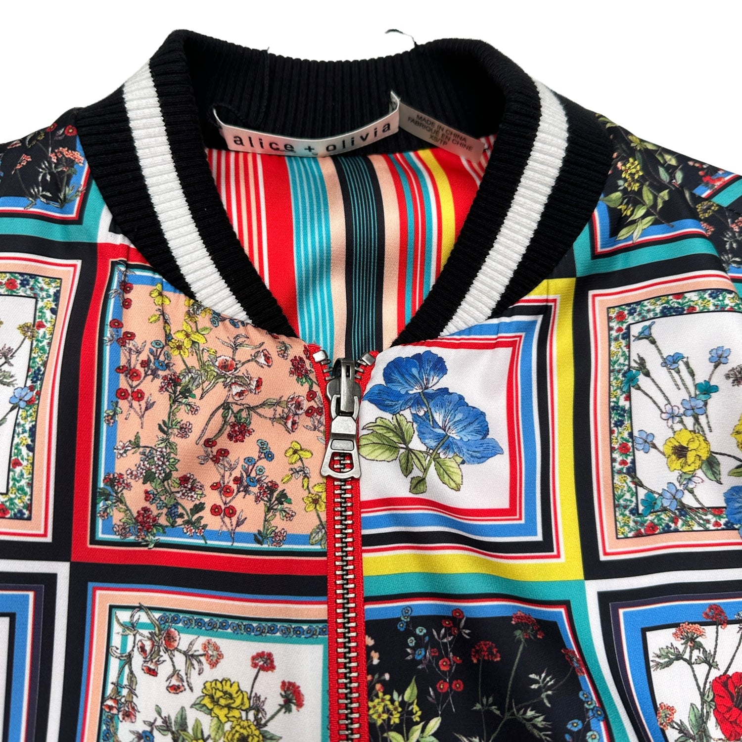 Alice + Olivia reversible bomber jacket. Red stripes on one side and flower patchwork print on the other side. Elasticised neck, wrists and waist. Size XS.
