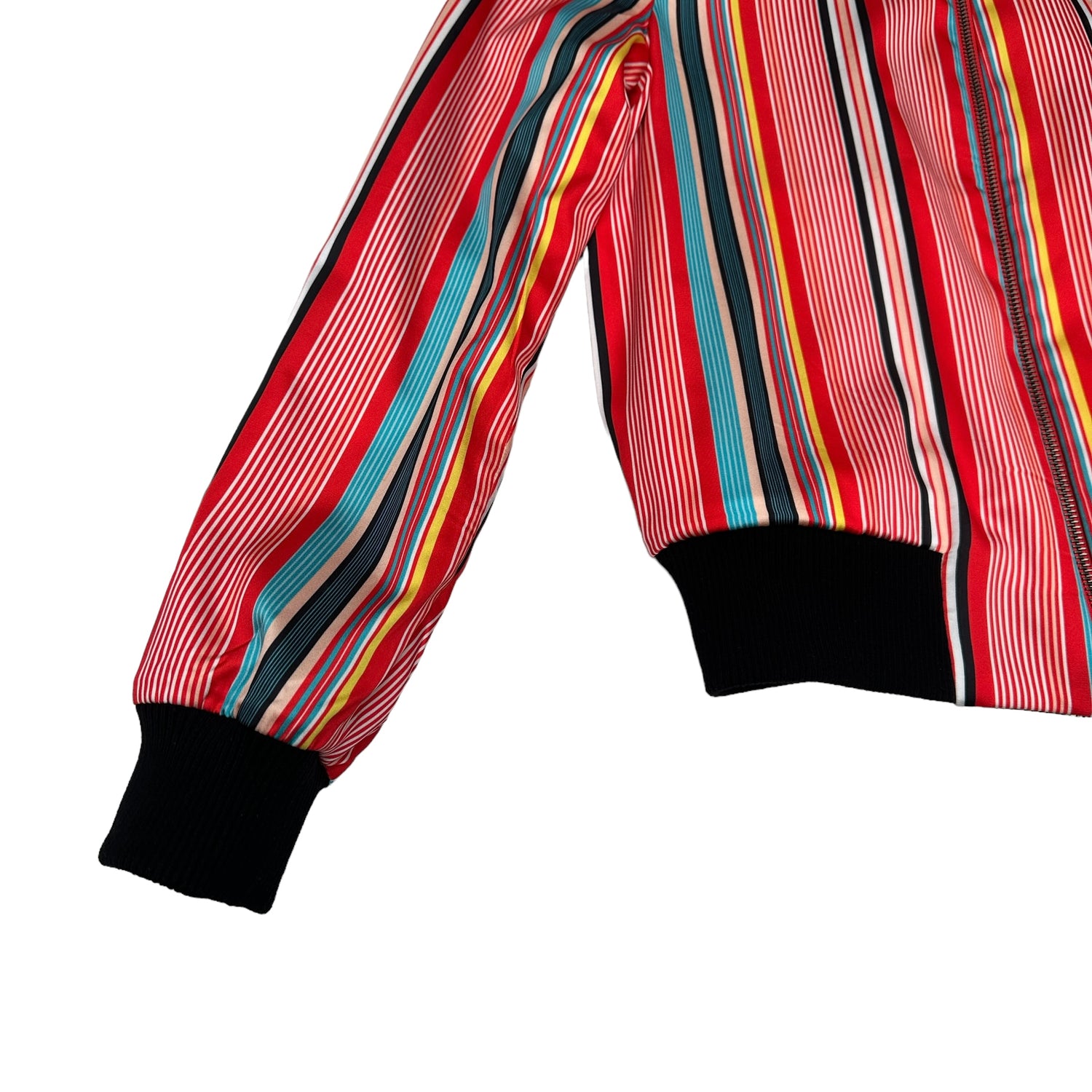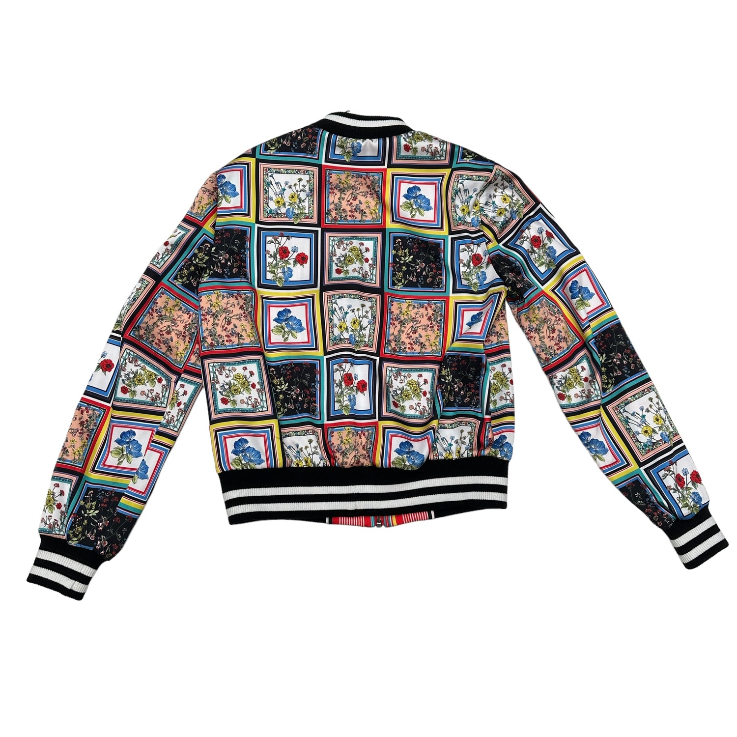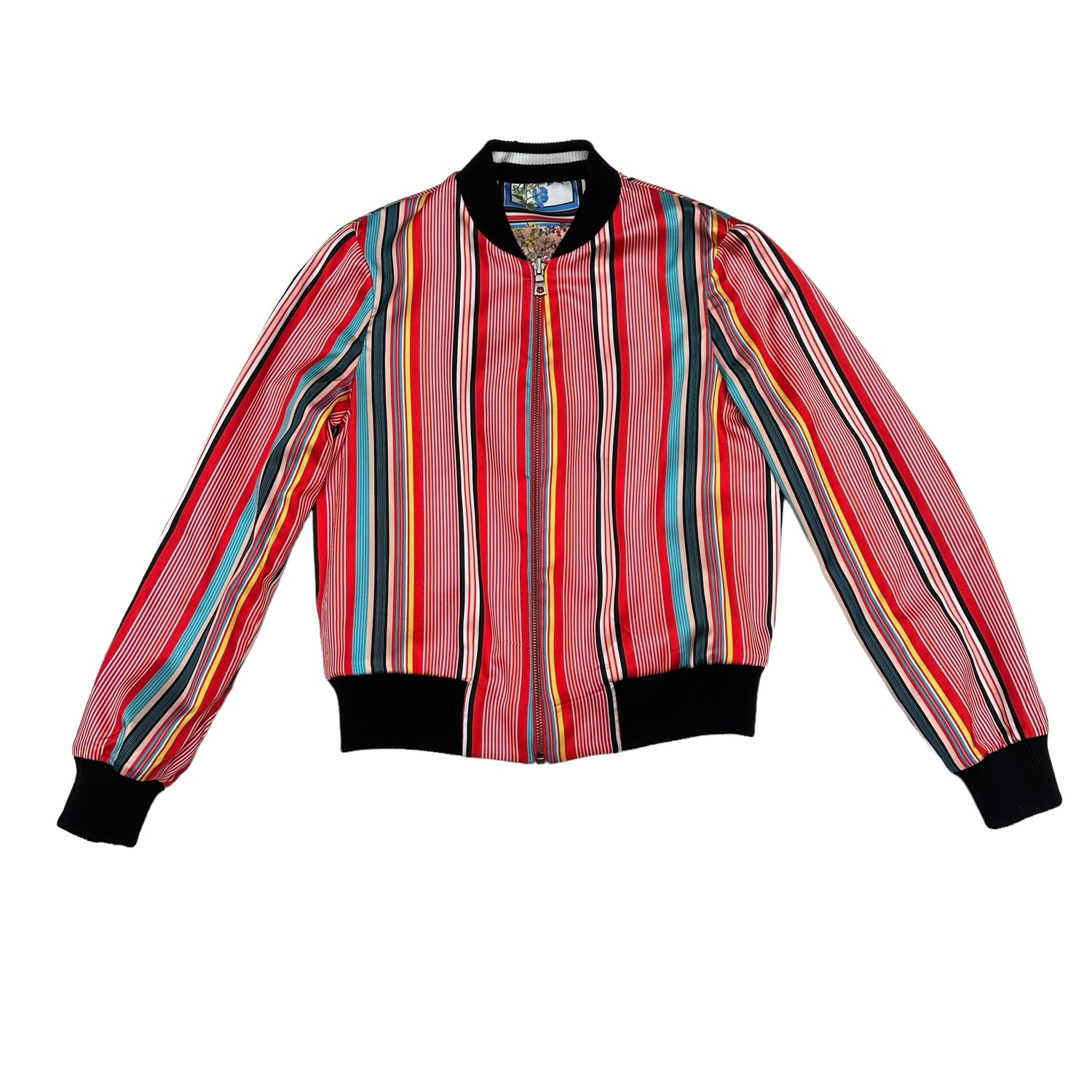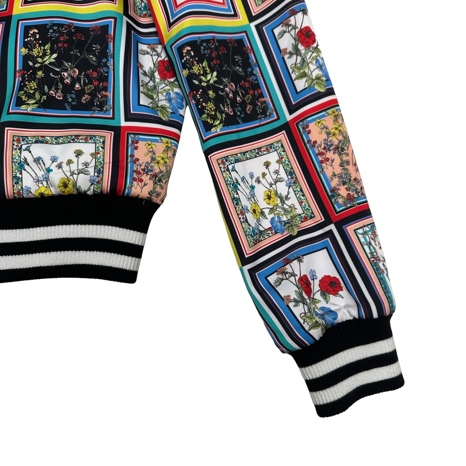 Alice + Olivia reversible bomber jacket. Red stripes on one side and flower patchwork print on the other side. Elasticised neck, wrists and waist. Size XS.