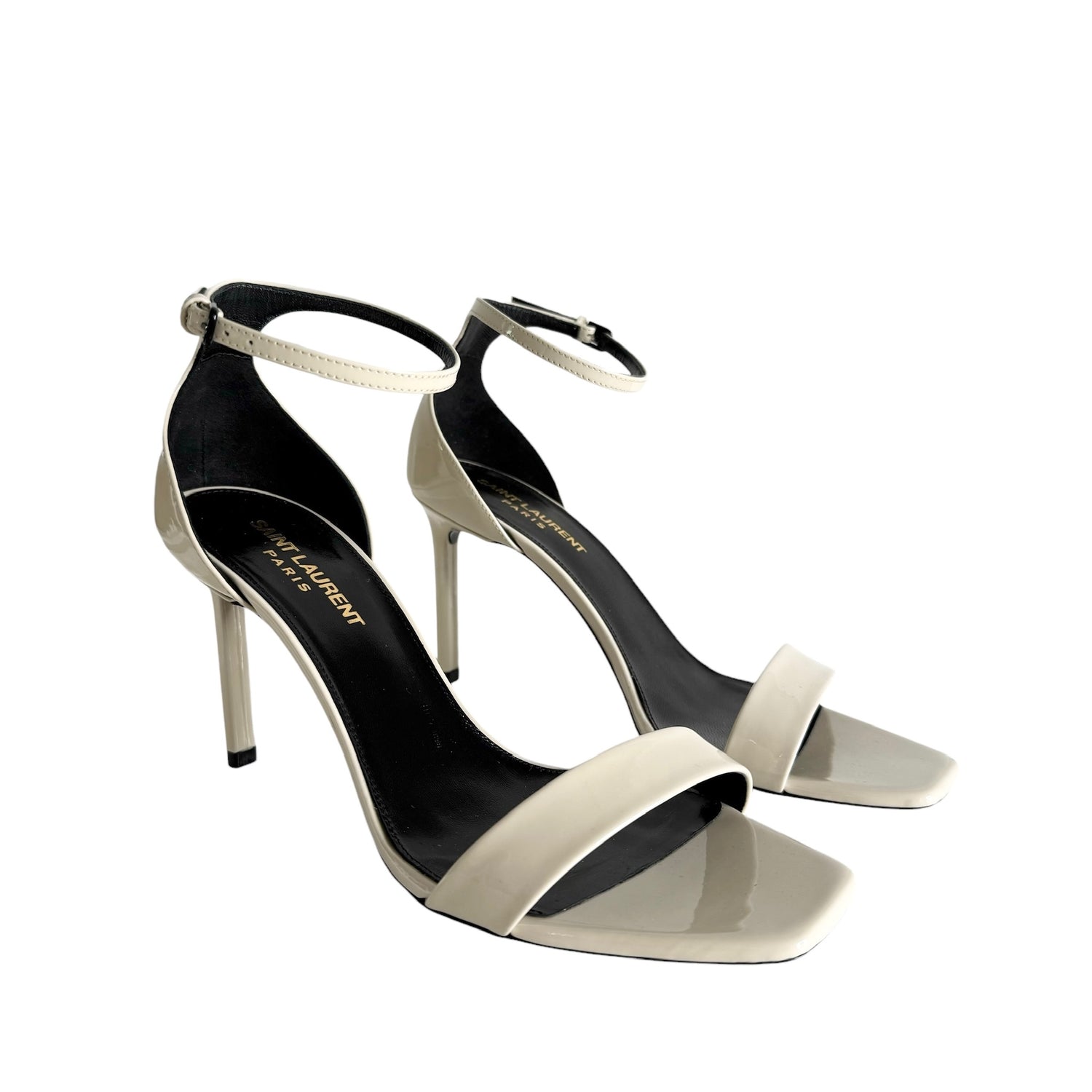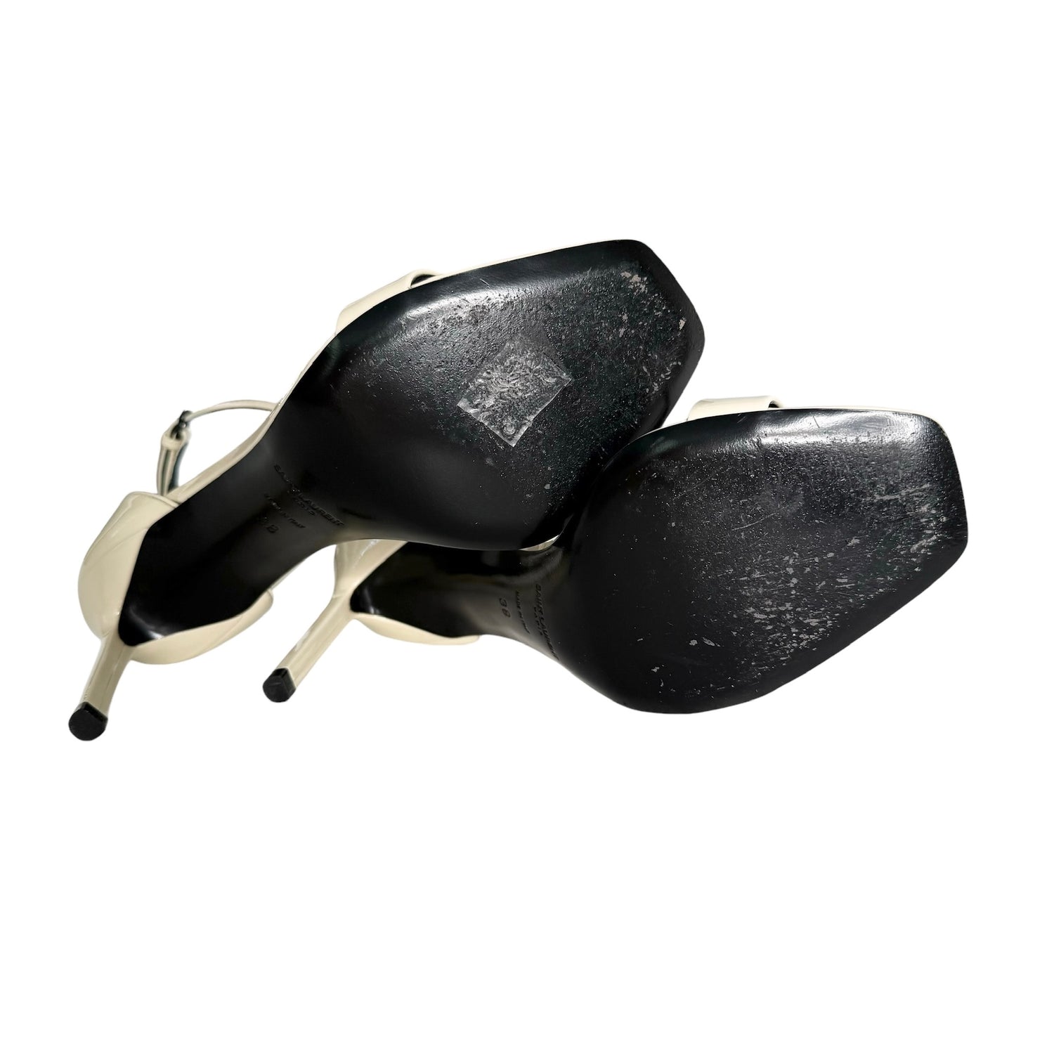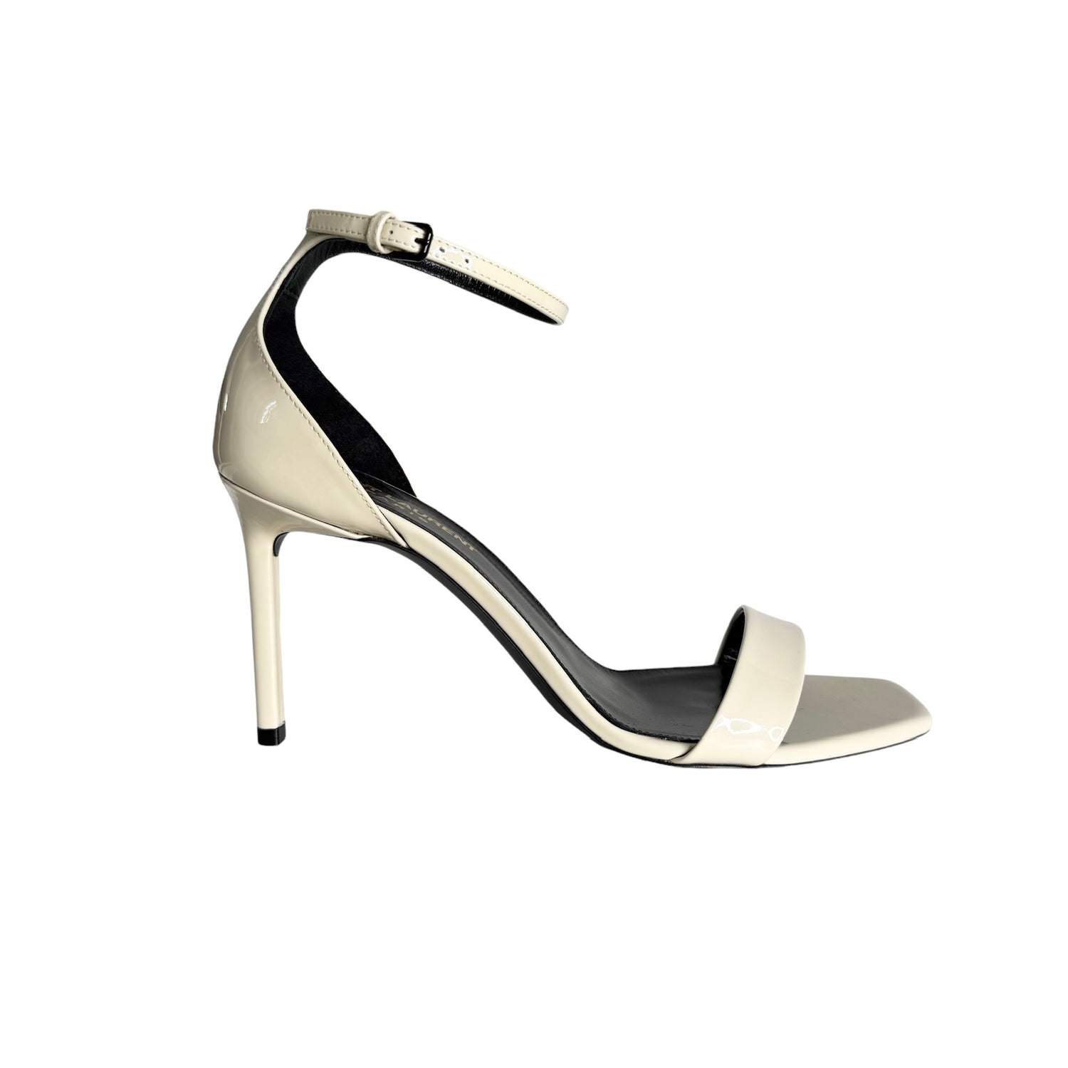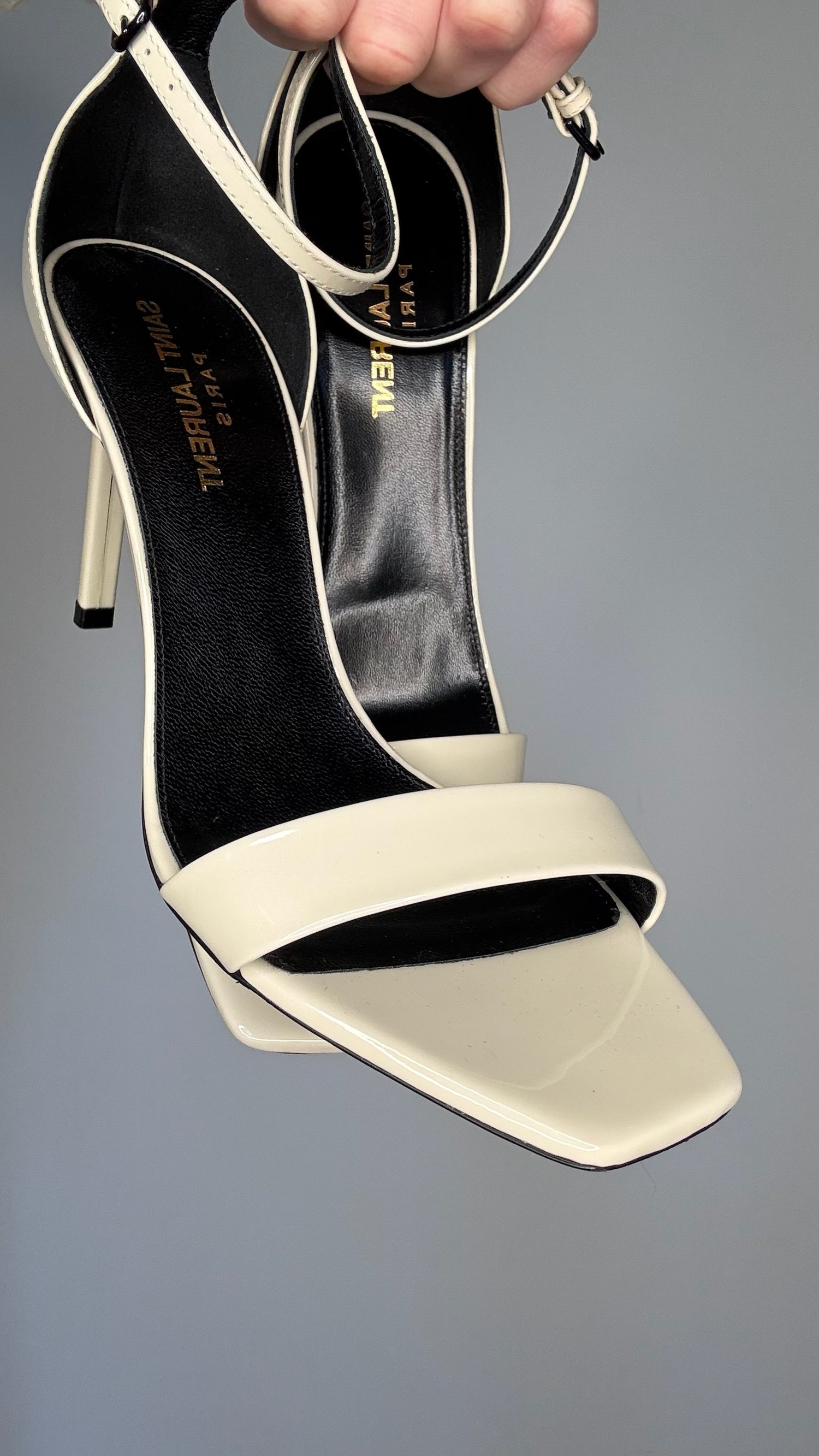 Saint Laurent white patent heels. Square toe. Ankle strap. Designer size 38.