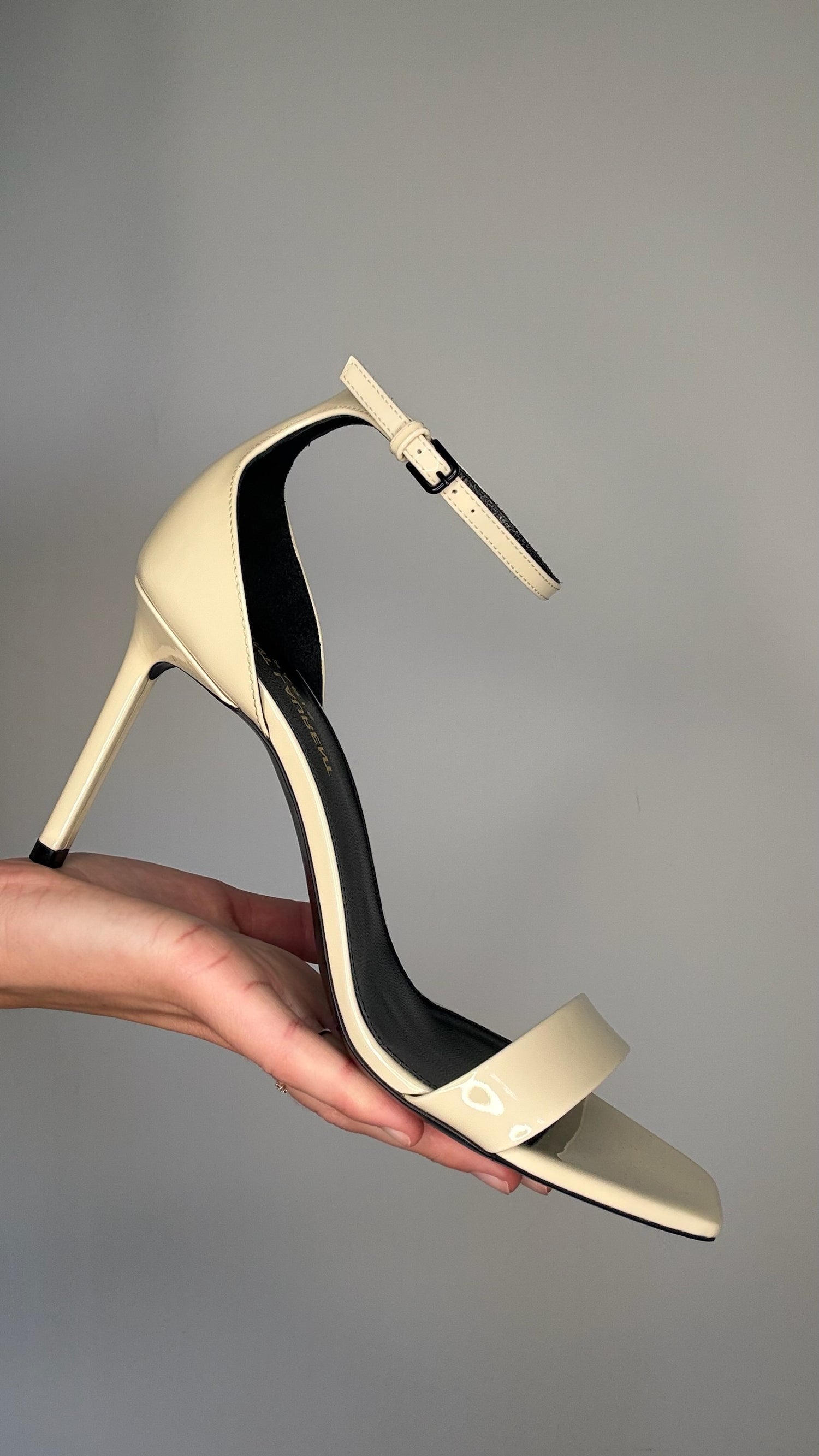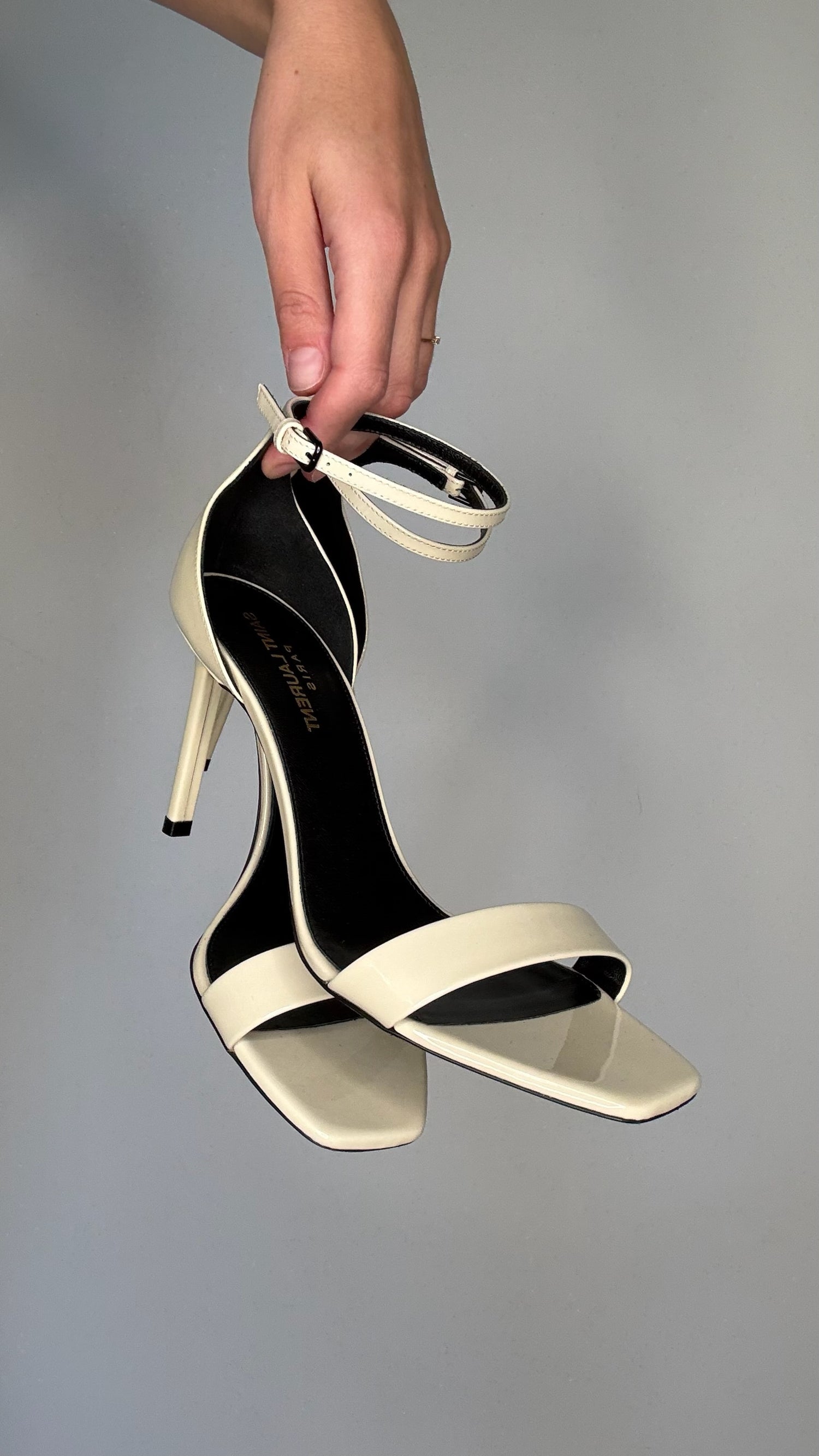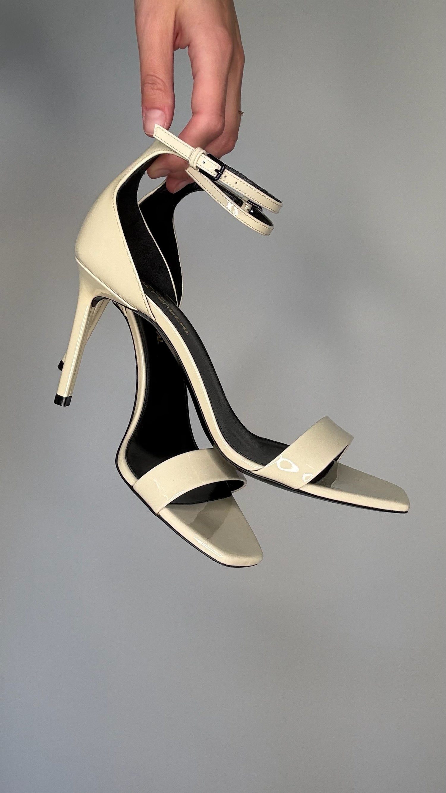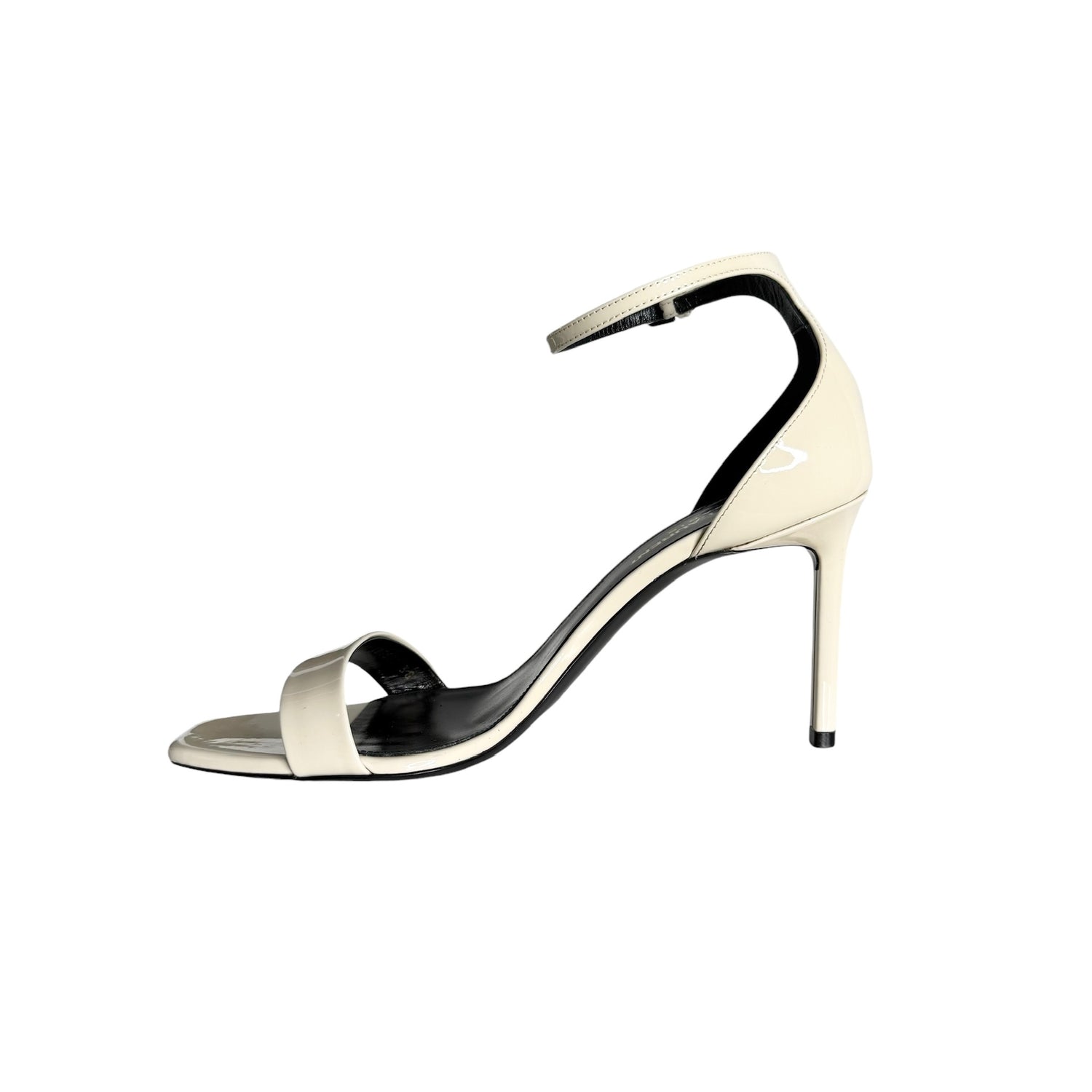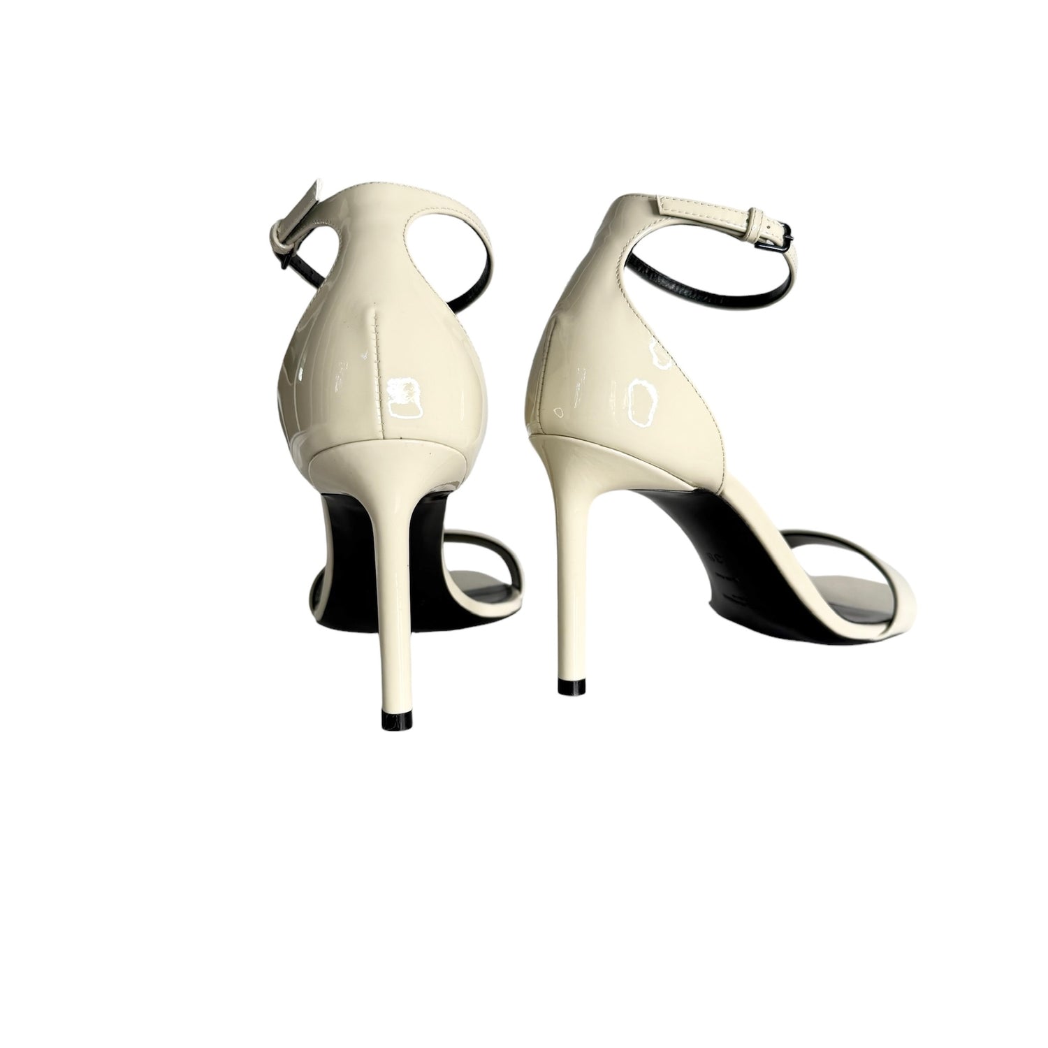 Saint Laurent white patent heels. Square toe. Ankle strap. Designer size 38.